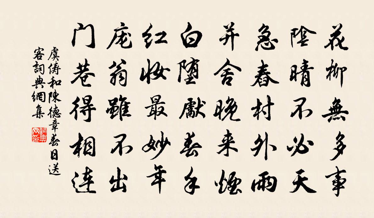 詩詞名句歷史字典書法欣賞書法字典國語詞典說文解字康熙字典古漢語字典標 題 作 者 詩 句 和陳德章春日送客作者:虞儔 朝代:宋代和陳德章春日送客原文花柳無多事,陰晴不必天。急舂村外雨,並舍晚來煙。白墮先春手,紅妝最妙年。龐翁雖不出,門巷得相連。詩詞問答問:和陳德章春日送客的作者是誰?答:虞儔問:和陳德章春日送客寫於哪個朝代?答:宋代虞儔和陳德章春日送客書法欣賞和陳德章春日送客書法作品詩詞推薦禪人並化主寫真求贊釋正覺〔宋代〕髮際點白,眼眶含青。情枯歷歷,智照靈靈。形骸如槁木,蹤跡肖流萍。月明四海犀通暈,春在百華蜂採馨。過武夷陳淳〔宋代〕武夷山下幾回過,未暇於中賞一遭。獅鶴諸仙知我意,故將青靄淡遮羅。九日新種梅花開方岳〔宋代〕木葉綠未脫,菊叢黃始華。泛萸幾何日,尚覺陶巾斜。寒梅殊不情,矜秋吐奇葩。霜須半含蕾,春{上艹下拱}新次韻宋履中題李侯檀欒亭秦觀〔宋代〕陰陰數畝籜龍稠,亭外危通一徑幽。頗似竹林當日集,酒狂莫笑阮陳留。禪人並化主寫真求贊釋正覺〔宋代〕雪顛未乾,秋波更寒。雲門舌不短,百丈鼻猶酸。心傳一燈自光燄,口翻四海看波瀾。間關半世,經歷百難。報導相如二首陳造〔宋代〕中宵卒卒去臨邛,賣酒壚邊混僦傭。想見令君醒後意,向人深悔謬為恭。雜詠一百首田橫劉克莊〔宋代〕南面稱孤貴,西京謁帝卑。誰能如李密,更望一台司。句車若水〔宋代〕江右文章今四葉,水心氣脈近三台。贈紫岩潘庭堅四首白玉蟾〔宋代〕得君四律詩,保啻百木難。我老非田光,何以酬燕丹。俯挹流泉漱,仰把青天看。絳闕遙相期,莫待瓊花殘。沁園春 答九華葉賢良劉克莊〔宋代〕一卷陰符,二石硬弓,百斤寶刀。更玉花驄噴,鳴鞭電抹,烏絲闌展,醉墨龍跳。牛角書生,虬髯豪客,談笑皆堪答張烏程皎然〔唐代〕莫道謫官無主人,秣陵才令日相親。前溪更有忘憂處,荷葉田田間白蘋。入書室東垣有神光自几案出三首羅公升〔宋代〕征鴻且勿飛,我憑問長安。長安在何許,征鴻亦良難。世狹日月短,氣縮天地慳。春色豈不深,風雨猶曉寒。送閣學袁尚書帥蜀分得雲字韻沈繼祖〔宋代〕秋郊時出祖,秋盡不余分。西湖貯秋色,護日浮輕雲。煌煌元戎乘,行旃駐河濆。璧水官僚多,飛蓋凝祥氛。坐間辰十月八日同希周掃松靈石晚步松下愴然有懷謝直〔宋代〕昔在井田日,一民本非四。農隙或工商,其艉秘稱士。是知桑禾間,可以寄書史。時非長桀耦,時得伊傅事。卒歲登樓子蘭〔唐代〕邊邑鴻聲一例秋, * 平日繞山流。故人千里同明月,盡夕無言空倚樓。三月二十一日泛舟十絕劉克莊〔宋代〕雖沉璧馬計安施,倏忽桑田就渺瀰。說與神通君看取,潮頭不到艮山祠。題扇許堅〔唐代〕喔吟但寫胸中妙,飲酒能忘身後名。但願長間有詩酒,一溪風月共清月。代書問費征君九華亭蕭建〔唐代〕見說九華峰上寺,日宮猶在下方開。其中幽境客難到,請為詩中圖畫來。感花吳芾〔宋代〕縱令日日 * ,已恨花無十日紅。何事東君長作惡,不容春色麗晴空。七夕唐彥謙〔唐代〕露白風清夜向晨,小星垂佩月埋輪。絳河浪淺休相隔,滄海波深尚作塵。天外鳳凰何寂寞,世間烏鵲漫辛勤。倚闌名句推薦江山代有才人出,各領風騷數百年。趙翼《論詩五首·其二》 天命之謂性;率性之謂道子思《中庸·第一章》 鄉心新歲切,天畔獨潸然。劉長卿《新年作》 一襟余恨宮魂斷,年年翠陰庭樹。仇遠《齊天樂·蟬》 去年折贈行人遠,今年恨、依然縴手。吳文英《花心動·柳》 貴上極則反賤,賤下極則反貴。司馬遷《史記·貨殖列傳》 雨中山果落,燈下草蟲鳴。王維《秋夜獨坐 / 冬夜書懷》 嗟余聽鼓應官去,走馬蘭台類轉蓬。李商隱《無題·昨夜星辰昨夜風》 帳底吹笙香吐麝,更無一點塵隨馬。蘇軾《蝶戀花·密州上元》 不違農時,谷不可勝食也孟子《孟子·梁惠王章句上·第三節》