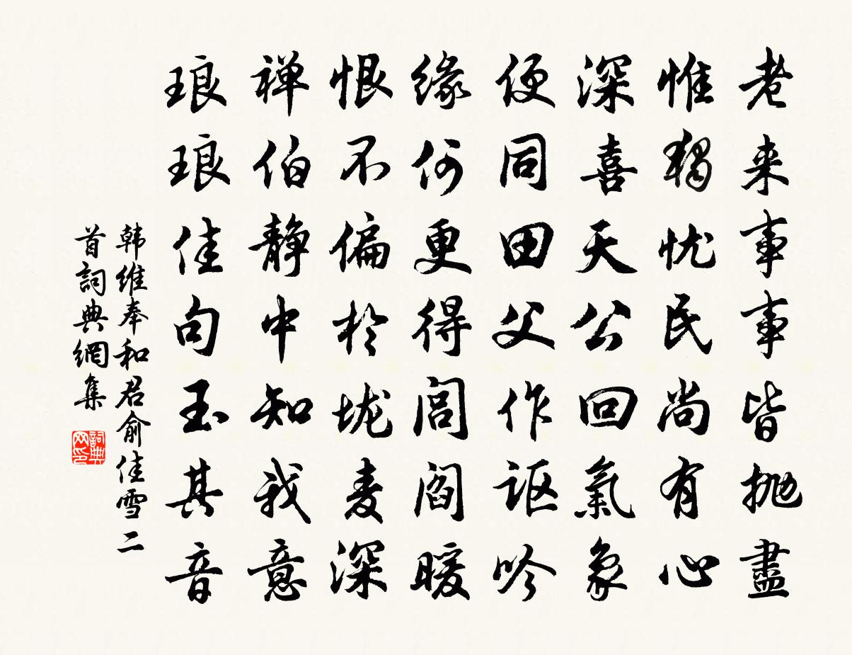 詩詞名句歷史字典書法欣賞書法字典國語詞典說文解字康熙字典古漢語字典標 題 作 者 詩 句 奉和君俞佳雪二首作者:韓維 朝代:宋代奉和君俞佳雪二首原文老來事事皆拋盡,惟獨憂民尚有心。深喜天公回氣象,便同田父作謳吟。緣何更得閭閻暖,恨不偏於壠麥深。禪伯靜中知我意,琅琅佳句玉其音。詩詞問答問:奉和君俞佳雪二首的作者是誰?答:韓維問:奉和君俞佳雪二首寫於哪個朝代?答:宋代韓維奉和君俞佳雪二首書法欣賞奉和君俞佳雪二首書法作品詩詞推薦鷓鴣天佚名〔宋代〕禁衛傳呼約下廊。層層掌扇簇親王。明珠照地三千乘,一片春雷入未央。宮漏永,柳街長。華燈偏共月爭光。樂聲宿九華化成寺莊泠然〔唐代〕佛寺孤莊千嶂間,我來詩境強相關。岩邊樹動猿下澗,雲里錫鳴僧上山。松月影寒生碧落,石泉聲亂噴潺湲。明朝和普公賦東園十題其三石筍梅堯臣〔宋代〕削出青山根,峭立碧玉圭。不作湘竹老,不染帝子啼。不為盤中蔬,豈與煙茁薺。奉和魯望樵人十詠樵叟皮日休〔唐代〕不曾照青鏡,豈解傷華發。至老未息肩,至今無病骨。家風是林嶺,世祿為薇蕨。所以兩大夫,天年自為伐。山亭觀梅陸游〔宋代〕與梅歲歲有幽期,忘卻如今兩鬢絲。乘淡月時和雪看,斸蒼苔地帶花移。先春瘦損應多恨,靜夜香來更一奇。醉倒旅寓洛南村舍鄭谷〔唐代〕村落清明近,鞦韆稚女夸。春陰妨柳絮,月黑見梨花。白鳥窺魚網,青簾認酒家。幽棲雖自適,交友在京華。題從叔述靈岩山壁孟郊〔唐代〕換卻世上心,獨起山中情。露衣涼且鮮,雲策高復輕。喜見夏日來,變為松景清。每將逍遙聽,不厭颼飀聲。遠念奉和隨王殿下詩 十六謝朓〔南北朝〕連漪映余雪。嚴城限深霧。清寒起洞門。東風急池樹。神居望已肅。徘徊舉沖趣。棲歸如遲詠。丘山不可屢。賀聖朝(兩辰歲生日作)趙鼎〔宋代〕花光燭影春容媚。香生和氣。紛紛兒女拜翁前,勸犀尊金醴。凌煙圖畫,王侯富貴,非翁雅意。願翁早早乞身歸,賀新郎(贈鄰人朱唐卿)劉過〔宋代〕多病劉郎瘦。最傷心、天寒歲晚,客他鄉久。大舸翩翩何許至,元是高陽舊友。便一笑、相歡攜手。為問武昌城下高宗建炎初祀昊天上帝佚名〔宋代〕內心齊誠,外物蠲潔。神來迪賞,俎豆既棄。燕及群生,靡或夭閈。降福穰穰,時萬時億。二月十五日同兄弟甥侄游西台次子載弟韻周必大〔宋代〕地飲成真率,天風恕澀慳。台臨平野迥,人對老僧閒。已是尋春至,仍容載月還。郊坰有如此,能不數追攀。福昌官舍後絕句十首張耒〔宋代〕洛川春色幾時歸,漾漾清流照翠微。日暖雪消沙岸軟,鴛鴦相對不驚飛。雜詠一百首公孫弘劉克莊〔宋代〕極力排舒黯,聯翩去不回。惟應刀筆吏,時得到翹材。尋桂南山至崇壽院因往靈三首張鎡〔宋代〕山頭籐斷空垂子,亭下泉荒不滿池。老衲坐來知敬客,南音猶記鬼仙詩。失調名佚名〔宋代〕說與教知。便是中朝一漢兒。耶溪泛舟孟浩然〔唐代〕落景餘清輝,輕橈弄溪渚。澄明愛水物,臨泛何容與。白首垂釣翁,新妝浣紗女。相看似相識,脈脈不得語。和聖俞春雨王珪〔唐代〕雲飛寒影欲千層,暝雨兼風斷復增。羃羃池台空鎖樹,蕭蕭簾幕更飄燈。歸將春晚花應笑,老入年來酒易凌。溝水雜詩李復〔宋代〕杯水入滄溟,浩浩通無際。原心方寸間,混合周天地。后稷勤稼穡,顏淵甘簞食。行己在一時,流芳播萬世。至道芍藥吟金朋說〔宋代〕畫闌倚玉對佃紅,娜裊翻階放艷農。自笑主人無個事,年年攜酒祝東風。名句推薦自從明宰投巫後,直至如今鬼不神汪遵《西河》 論德而定次,量能而授官。荀子《荀子·君道》 忍淚佯低面,含羞半斂眉。韋莊《女冠子·四月十七》 無冥冥之志者,無昭昭之明;無惛惛之事者,無赫赫之功。荀子《荀子·勸學》 牆頭馬上遙相顧,一見知君即斷腸。白居易《井底引銀瓶·止淫奔也》 蕭蕭遠樹疏林外,一半秋山帶夕陽。寇準《書河上亭壁》 兩處春光同日盡,居人思客客思家。白居易《望驛台》 亭皋木葉下。隴首秋雲飛。柳惲《搗衣詩》 別夢依依到謝家,小廊回合曲闌斜。張泌《寄人》 夢中未比丹青見,暗裡忽驚山鳥啼。姜夔《鷓鴣天·元夕有所夢》