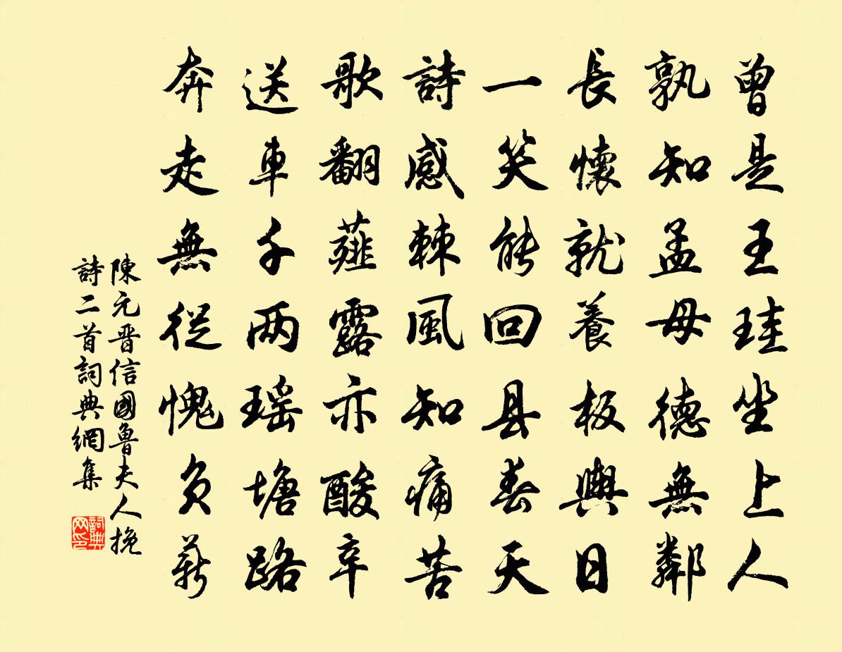 詩詞名句歷史字典書法欣賞書法字典國語詞典說文解字康熙字典古漢語字典標 題 作 者 詩 句 信國魯夫人輓詩二首作者:陳元晉 朝代:宋代信國魯夫人輓詩二首原文曾是王珪坐上人,孰知孟母德無鄰。長懷就養板輿日,一笑能回縣春天。詩感棘風知痛苦,歌翻薤露亦酸辛。送車千兩瑤塘路,奔走無從愧負薪。詩詞問答問:信國魯夫人輓詩二首的作者是誰?答:陳元晉問:信國魯夫人輓詩二首寫於哪個朝代?答:宋代陳元晉信國魯夫人輓詩二首書法欣賞信國魯夫人輓詩二首書法作品詩詞推薦招友人遊春(一作杜光庭詩)鄭遨〔唐代〕難把長繩系日烏,芳時偷取醉工夫。任堆金璧磨星斗,買得花枝不老無。偈頌一百零二首釋慧遠〔宋代〕托跡但知忘世故,棲蘆何事不容閒。已能躡足龍門過,試把輪鉤揚碧灣。早春招張賓客白居易〔唐代〕久雨初晴天氣新,風菸草樹盡欣欣。雖當冷落衰殘日,還有陽和暖活身。池色溶溶藍染水,花光焰焰火燒春。商山大衍易吟四十首方回〔宋代〕六陰升已極,坤下戰乎乾。建亥陽生處,居然復卦前。玉樓春石孝友〔宋代〕風光澹沲雲容粹。點染園林添況味。花間照夜簇紅紗,柳外踏青搖彩旆。芳時不分空憔悴。抖擻愁懷賒樂事。羅衫出郭陳造〔宋代〕江縣居人寒食下,少在縣中多在野。哭聲不似笑聲長,麗服新妝盡游者。長郊芳草接天綠,我亦行行策罷馬。盍簪喜劉伯宣尚書至五首方回〔宋代〕所至無嚬蹙,當今亦鮮哉。名譽非易致,悅服有從來。漢令更泉幣,吳儂告水災。忽聞自天下,何策可春回。南至即事馮時行〔宋代〕愛惜青秋預恐貧,豈堪時序過來頻。待梅沽酒無多日,隔臘看春只並鄰。俗薄連牆成異縣,時難佳節是蕭辰。望雲贛州文天祥〔宋代〕滿城風雨送淒涼,三四年前此戰場。遺老猶應愧蜂蟻,故交已久化豺狼。江山不敢人心在,宇宙方來事會長。翠玉浣溪沙(次韻王子弁紅梅)侯置〔宋代〕倚醉懷春翠黛長。肉紅衫子半窺牆。蘭湯浴困嫩勻妝。應為長年餐絳雪,故教丹頰耐清霜。弄晴飛馥笑馮唐。春秋戰國門楚懷王周曇〔唐代〕不聽陳軫信張儀,六里商於果見欺。既舍黔中西換得,又令生去益堪悲。紫芝圖釋寶曇〔宋代〕坐誦行欹憶紫芝,江南有愧斷腸詞。後於王母三千歲,始見商山十二枝。日上寶光應倒射,柱間甘露足華滋。吾鄉瑞鷓鴣王哲〔元代〕堪當奼女嫁丁郎。認得嬰兒住癸房。幸有甲田知出入,不無兌地做炎涼。鉛刀起處通神妙,汞劍開時仗慧鋼。殺卻石竺山二十詠劉克莊〔宋代〕點額有墨痕,剖腹無素書。俗視如頑石,仙騎上太虛。白髮趙汝鐩〔宋代〕朱顏留不住,白髮自應生。摘了依然有,徙勞打鑷聲。歲在癸丑年始七十年正旦日書事富弼〔宋代〕人生七十古來稀,今日愚年已及期。從此光陰猶不測,只應天道始相知。食蠣房楊萬里〔宋代〕蓬山側畔屹蚝山,懷玉深藏萬岳間。也被酒徒勾引著,薦他尊俎解他顏。春日李商隱〔唐代〕欲入盧家白玉堂,新春催破舞衣裳。蝶銜紅蕊蜂銜粉,共助青樓一日忙。過嶺蘇軾〔宋代〕暫著南冠不到頭,卻隨北雁與歸休。平生不作兔三窟,今古何殊貉一丘。當日無人送臨賀,至今有廟祀潮州。劍關【雙調】江兒水王仲元〔元代〕嘆世誰待理他閒是非,緊把紅塵避。庵前綠水圍,門外青山對,尋一個穩便處閒坐地。竹冠草鞋粗布衣,晦跡韜光名句推薦敗垣芳草,空廊落葉,深砌蒼苔。徐再思《人月圓·甘露懷古》 世風之狡詐多端,到底忠厚人顛撲不破王永彬《圍爐夜話·第 * 則》 非知之艱,行之惟艱。佚名《尚書·商書·說命中》 夭夭園桃,無子空長。曹丕《煌煌京洛行》 去年元夜時,花市燈如晝。歐陽修《生查子·元夕》 塵緣一點,回首西風又陳跡。吳文英《六么令·夷則宮七夕》 冠蓋滿京華,斯人獨憔悴。杜甫《夢李白二首·其二》 離多最是,東西流水,終解兩相逢。晏幾道《少年游·離多最是》 寂寞深閨,柔腸一寸愁千縷。李清照《點絳唇·閨思》 一雙冷眼看世人,滿腔熱血酬知己。袁枚《隨園詩話·卷十六》