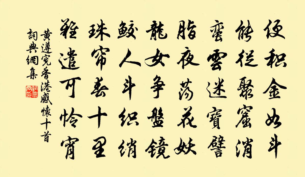詩詞名句歷史字典書法欣賞書法字典國語詞典說文解字康熙字典古漢語字典標 題 作 者 詩 句 香港感懷十首作者:黃遵憲 朝代:清代香港感懷十首原文便積金如斗,能從聚窟消。蠻雲迷寶譬,脂夜盪花妖。龍女爭盤鏡,鮫人斗織綃。珠簾春十里,難遣可憐宵。詩詞問答問:香港感懷十首的作者是誰?答:黃遵憲問:香港感懷十首寫於哪個朝代?答:清代問:香港感懷十首是什麼體裁?答:五律黃遵憲香港感懷十首書法欣賞香港感懷十首書法作品詩詞推薦又三絕徐鉉〔唐代〕銀燭金爐禁漏移,月輪初照萬上枝。造舟已似文事事,卜世應同八百期。【雙調】沉醉東風關漢卿〔元代〕面比花枝解語,眉橫柳葉長疏。想著雨和雲,朝還暮,但開口只是長吁。紙鷂兒休將人廝應付,肯不肯懷兒里便許贈李企許月卿〔宋代〕雁湖曾是謫臨川,誰道風流愧昔賢。共覺共兜亂堯世,何須虞黃質周田。三年遷客僅數舍,一日恩書落九天。歸去偶題朱熹〔宋代〕步隨流水覓溪源,行到源頭卻惘然。始信真源行不到,倚筇隨處弄潺湲。仁宗皇帝二詩御漢體書贊岳珂〔宋代〕鴻荒有開,昉頡鳥跡。字學之興,亦既象物。漢有議郎,曰臣蔡邕。帛書發奇,出淳古蹤。千齡寥寥,嗣響逾邈。日暮游東澗釋重顯〔宋代〕極目生晚照,遠樹籠微陰。誰知清淺流,別有滄海深。酬盧仝見訪不遇題壁含曦〔唐代〕長壽寺石壁,盧公一首詩。渴讀即不渴,飢讀即不飢。鯨吞海水盡,露出珊瑚枝。海神知貴不知價,留向人間光照寄沈時仲李洪〔宋代〕故人為別又經年,幾度臨風思黯然。赤縣暫陪珠履客,青衫空負小山篇。壯時之武無能用,老矣揚雄只守玄。何日和綿州於中丞登越王樓作薛蒙〔唐代〕左綿江上樓,五馬此銷愁。暑退千山雪,風來萬木秋。邅回猶刺郡,系滯似維舟。即有徵黃日,名川莫厭游。送胡叔獻被召二首劉克莊〔宋代〕解瑟於今又再秋,弓旌所致總名流。積輕曾覆祁公鼎,偏重能翻涑水舟。袖裡纏文差快意,局傍觀弈尚私憂。信庵汪尚書挽章二首姜特立〔宋代〕昔年宦路意相傾,四紀中間一寄聲。賢嗣登門如對面,新詩緘興見輸情。安輿方擬來岩邑,急訃俄傳上玉京。嘆息乳燕飛/賀新郎劉辰翁〔宋代〕赤壁之遊樂。但古今、風清月白,更無坡作。矯首中洲公何許,共我橫江孤鶴。把手笑、孫劉寂寞。頗有使君如今酬盈祖中散韓維〔宋代〕勇脫塵冠尚壯年,高齋圖史日蕭然。不教歌舞家規在,善作文章世學傳。道舊每思傾濁酒,仰高徒覺愧華顛。相君立春七首劉克莊〔宋代〕解凍依然風栗烈,鞭春才了雨廉纖。街坊遏密無儺鼓,村落豐登有酒帘。夜泊宣城界(一題作旅行欲泊宣州界)孟浩然〔唐代〕西塞沿江島,南陵問驛樓。湖平津濟闊,風止客帆收。去去懷前浦,茫茫泛夕流。石逢羅剎礙,山泊敬亭幽。火識用晦翁十梅詩韻酬張伯修孫子直吳泳〔宋代〕老瓦莫厭粗,奚童莫嫌小。及時不為樂,頃刻芳事了。夏日普信寺江閣趙汝鐩〔宋代〕到此全無暑,虛欄千里風。看飛雲度水,聽落石鳴空。日月忙鳥兔,春秋遞燕鴻。一生塵裹過,煙艇羨漁翁。念奴嬌(四和)吳潛〔宋代〕天然皓質,想當年此種,來從太素。一點紅塵都不染,羅列蟾宮玉女。色壓薝林,香欺蘭畹,肯向聞箏浦。靈龜千入夜應潭對岸作示成父趙蕃〔宋代〕溪山風月兩相當,痼疾真成得秘方。往日同舟但饒信,只今去路落湖湘。貧離親戚古所嘆,歸去田園老未忘。試趼淨光山四首茶山堂徐璣〔宋代〕山是朝廷賜,名從古昔傅。為堂居此地,汲水記前賢。雨露餘根在,荊榛細蔓緣。困來求一盞,打坐亦安禪。名句推薦怒髮衝冠,憑欄處、瀟瀟雨歇。岳飛《滿江紅·寫懷》 親戚或余悲,他人亦已歌。陶淵明《擬輓歌辭三首》 故不登高山,不知天之高也;不臨深溪,不知地之厚也;荀子《勸學》 綠池芳草滿晴波,春色都從雨里過。高啟《春暮西園》 二分塵土,一分流水蘇軾《水龍吟·次韻章質夫楊花詞》 四百年來成一夢,堪愁。王安石《南鄉子·自古帝王州》 樸實渾厚,初無甚奇,然培子孫之元氣者,必此人也。王永彬《圍爐夜話·第十九則》 冷冷水向橋東去。漠漠雲歸溪上住。劉鎮《玉樓春·東山探梅》 禮以行義,義以生利,利以平民,政之大節也。左丘明《左傳·成公·成公二年》 不鳴則已,一鳴驚人。司馬遷《滑稽列傳》
