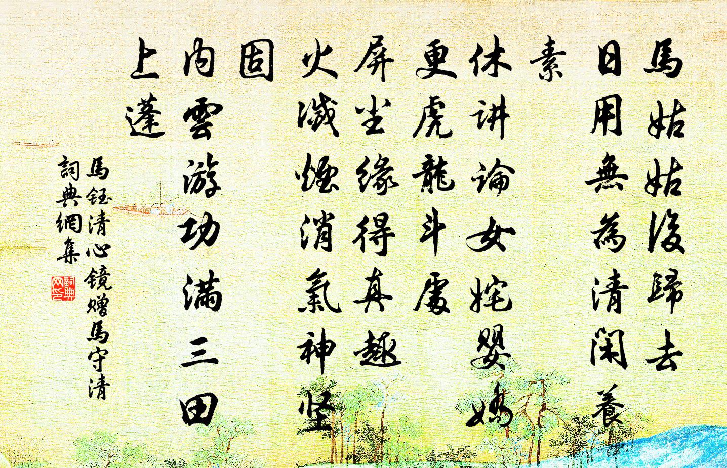 詩詞名句歷史字典書法欣賞書法字典國語詞典說文解字康熙字典古漢語字典標 題 作 者 詩 句 清心鏡 贈馬守清作者:馬鈺 朝代:元代清心鏡 贈馬守清原文馬姑姑,後歸去。日用無為,清閒養素。休講論、女奼嬰嬌,更虎龍斗處。屏塵緣,得真趣。火滅煙消,氣神堅固。內雲遊、功滿三田,上蓬詩詞問答問:清心鏡 贈馬守清的作者是誰?答:馬鈺問:清心鏡 贈馬守清寫於哪個朝代?答:元代問:清心鏡 贈馬守清是什麼體裁?答:詞馬鈺清心鏡 贈馬守清書法欣賞清心鏡 贈馬守清書法作品詩詞推薦鶯石延年〔宋代〕何處傳新哢,間關出建章。至清無奈玉,更巧莫如簧。谷口淒寒甚,花陰淑景長。上林棲處穩,慎勿近雕梁。次韻胡邦衡二首周必大〔宋代〕馮翊當年助匪頒,殊方此日奉賓歡。淺基想對銷金帳,生意重尋白玉槃。蟻泛似緣膻足慕,海凝如得毳逃寒。十羊會客有美堂,周邠長官與數僧同泛湖往北山,蘇軾〔宋代〕靄靄君詩似嶺雲,從來不許醉紅裙。不知野屐穿山翠,惟見輕橈破浪紋。頗憶呼盧袁彥道,難邀罵座灌將軍。晚風題苕溪漁隱圖胡仔〔宋代〕捲起綸竿撇棹歸,短篷斜掩宿漁磯。日高春睡無人喚,撩亂楊花繞夢飛。御賜真贊師演成四偈釋宗杲〔宋代〕圓覺空明,胡來漢現。一點靈光,萬化千變。減字木蘭花元絳〔宋代〕綠楊陰下。短帽輕衫行信馬。過盡春風。踏盡青青打盡紅。舞鸞歌鳳。人面湖光紅影動。醉眼歸時。人在朱樓曲角四言贈兄秀才入軍詩 其十八嵇康〔兩漢〕流俗難悟。逐物不還。至人遠鑒。歸之自然。萬物為一。四海同宅。與彼共之。予何所惜。生若浮寄。暫見忽終。送別感賦劉絮窗〔清代〕理罷雲鬟展轉思,池塘正值夢回時。近來詩句如春柳,只向東風贈別離。題福清薛明府太平禾圖劉克莊〔宋代〕聞說琴堂似水清,天公產瑞告西成。宛如唐叔稱同穎,未羨相如詫一莖。岳牧定應圖畫進,朝家曷有璽書旌。儂詩晚春即事鄭起〔宋代〕輕寒時節牡丹開,葉底青青又風梅。門外數枝楊柳薄,一春鶯燕不曾來。謝惠連徐鈞〔宋代〕千里相思一段奇,精交神契及心期。池塘春草天然句,不夢此人無此詩。排悶陸游〔宋代〕萬里風中寄斷蓬,古來虛死幾英雄?拔山力與回天勢,不滿先生一笑中。次韻南湖清飲二首蘇轍〔宋代〕翠箔紅窗映大堤,遠來清飲嘆參差。盈盈積水東西隔,脈脈幽懷彼此知。淥酒謾傳工破悶,主人何敢怪顰眉。明朝寄鸕鶿源方允迪江子我朱翌〔宋代〕世間豺虎正爭岐,隱去可妨九曲迷。懷人夢到北山北,卜鄰意欲西枝西。麥雲已有飽氣象,梅雨又煩詩品題。他日水調歌頭韓淲〔宋代〕新月已如許,我問帶湖梅。人閒題句,贏得浮瀲酒盈杯。落拓豪英滿坐,爛漫風騷連紙,天外鳳凰來。只怕輕孤負題搓線圖朱翌〔宋代〕誰言粉白但閒居,紉補尚煩金十奴。治得棼絲有條理,卻嫌紅女未工夫。宿猿洞和程師孟韻張徽〔宋代〕日上高台雲半屏,洞門休喚夕陽扃。巍冠不整跏趺坐,秋楮斕斑數點星。頌古一○一首釋子淳〔宋代〕拾得疏慵非覺曉,寒山懶惰不知歸。聲前一句圓音美,物外三山片月輝。訴衷情·出林杏子落金盤周邦彥〔宋代〕出林杏子落金盤。齒軟怕嘗酸。可惜半殘青紫,猶有小唇丹。南陌上,落花閒。雨斑斑。不言不語,一段傷春,都春秋戰國門平公周曇〔唐代〕鴻鵠輕騰萬里高,何殊朝野得賢豪。能知翼戴穹蒼力,不是蒙茸腹背毛。名句推薦天生我材必有用,千金散盡還復來。李白《將進酒》 此路無知己,明珠莫暗投。高適《送魏八》 胡沙沒馬足,朔風裂人膚。韋元甫《木蘭歌》 大漠西風急,黃榆涼葉飛。田錫《塞上曲》 征人去日殷勤囑,歸雁來時數附書。王維《伊州歌》 深秋絕塞誰相憶,木葉蕭蕭。納蘭性德《採桑子·九日》 丹砂成黃金,騎龍飛上太清家,雲愁海思令人嗟。李白《飛龍引二首·其一》 聞道長安燈夜好,雕輪寶馬如雲。毛滂《臨江仙·都城元夕》 二客東南名勝,萬卷詩書事業,嘗試與君謀。辛棄疾《水調歌頭·舟次揚州和人韻》 貧居鬧市無人問,富在深山有遠親。佚名《增廣賢文·上集》