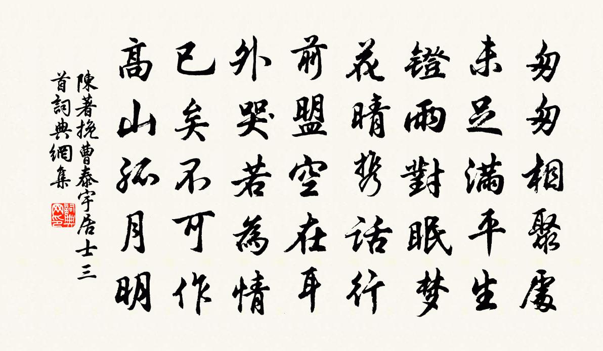詩詞名句歷史字典書法欣賞書法字典國語詞典說文解字康熙字典古漢語字典標 題 作 者 詩 句 挽曹泰宇居士三首作者:陳著 朝代:宋代挽曹泰宇居士三首原文匆匆相聚處,未足滿平生。鐙雨對眠夢,花晴攜話行。前盟空在耳,外哭若為情。已矣不可作,高山孤月明。詩詞問答問:挽曹泰宇居士三首的作者是誰?答:陳著問:挽曹泰宇居士三首寫於哪個朝代?答:宋代陳著挽曹泰宇居士三首書法欣賞挽曹泰宇居士三首書法作品詩詞推薦水仙花畫方回〔宋代〕□繪水仙陪魯直,梅邊更有子瞻形。蘇兄黃弟神遊處,重築人間頓有亭。將入匡山宿韓判官宅貫休〔唐代〕一宿蘭堂接上才,白雪歸去幾裴回。黛青峰朵孤吟後,雪白猿兒必寄來。簾卷茶煙縈墮葉,月明棋子落深苔。明朝清平樂 五月十五夜玩月劉克莊〔宋代〕風高浪快。萬里騎蟾背。曾識姮娥真體態。素麵元無粉黛。身游銀闕珠宮。俯看積氣濛濛。醉里偶搖桂樹,人間喚同器之游大宋陂值雨張耒〔宋代〕微雨護日曉陰陰,春去余芳尚可尋。詩倚醉豪連卷寫,酒逢勍敵百分斟。山光左右雙屏畫,雨腳崢嶸萬羽林。沙路靜觀堂十偈汪晫〔宋代〕春去人間日正長,天工催促綠陰忙。古槐高柳爭新意,自是無人知底涼。喜入蘭陵望紫閣峰呈宣上人李益〔唐代〕薙草開三徑,巢林喜一枝。地寬留種竹,泉淺欲開池。紫閣當疏牖,青松入壞籬。從今安僻陋,蕭相是吾師。至性靈迂僻學術空虛幸逢好古之君獲在藏書之李至〔宋代〕蓬閣多餘暇,捫心或暗思。學應無足日,發自有衰時。庶事曾經目,浮榮病切肌。何當臥雲嶺,方寸貯希夷。西征過仙霞雪晴陳淳〔宋代〕自入仙霞十里程,滿山晴雪射虛明。路從寶貝洞中去,人在瓊瑤世界行。枯木競傳千狀巧,荒崖亦作十分清。迴環江行贈鴈歐陽修〔宋代〕雲間征鴈水間棲,矰繳方多羽翼微。歲晚江湖同時客,莫辭伴我更南飛。游九鎖山龍洞林景熙〔宋代〕雲濕林腥隱右扉,不知何代有龍歸。卻疑此洞地無底,下挾滄溟作雨飛。金剛隨機無盡頌究竟無我分第十七釋印肅〔宋代〕承佛記堪任,情忘境自沉。解吹無孔笛,彈得沒弦琴。花光十梅淡中有味釋師範〔宋代〕半開半合榮枯外,似有似閒淡中。自是一般風味別,笑他紅紫斗芳叢。清明日與友人游玉粒(一本無粒字)塘莊來鵠〔唐代〕幾宿春山逐陸郎,清明時節好煙光。歸穿細荇船頭滑,醉踏殘花屐齒香。風急嶺雲飄迥野,雨余田水落方塘。不堪離昇州作王安石〔宋代〕相看不忍發,慘澹暮潮平。語罷更攜手,月明州渚生。展江亭海棠四首韓維〔宋代〕人避寒風與暖曦,年年長此探花期。如今太守尤珍受,只許官娃帶一枝。寓言陸游〔宋代〕山海三家市,風煙五畝園。藜羹均玉食,茅屋陋朱門。耕釣此身老,乾坤吾道尊。故交淪落盡,至理與誰論?句游九言〔宋代〕平生意思春風裡,信手題詩不用工。依韻和張姑夫主簿晁說之〔宋代〕即今時節總堪悲,寒食仍多雨意垂。幾處壠頭飄斷紙,誰家碑額仆盤螭。江湖魚糝聊為客,兒女米糰難療飢。即見過鳳山有感二首周文璞〔宋代〕秋蕪闕是草堂基,惟有南鄰盡得知。辛苦置家將守冢,告求廣地要穿池。淨蓮已付鄉僧掘,慈竹從教墓客移。雖向游北岩張嵲〔宋代〕尋山輕近境,偶向此中來。精舍層岩擁,穹林石路開。排雲今歲竹,封徑幾年苔。僧老無餘事,端居傲劫灰。名句推薦茶鼎熟,酒卮揚,醉來詩興狂。張大烈《阮郎歸·立夏》 任你官清似水,難逃吏滑如油。馮夢龍《醒世恆言·卷二十》 壚邊人似月,皓腕凝霜雪。韋莊《菩薩蠻·人人盡說江南好》 無求到處人情好,不飲任他酒價高。佚名《增廣賢文·上集》 昔嘆當年無李牧,今知江左有夷吾陳亮《送文子轉漕江東二首》 陶潛酷似臥龍豪,萬古潯陽松菊高龔自珍《己亥雜詩·其一百三十》 夕陽西下,塞雁南飛,渭水東流。康與之《訴衷情令·長安懷古》 內官初賜清明火,上相閒分白打錢。韋莊《長安清明》 一春魚雁無訊息,則見雙燕斗銜泥。關漢卿《大德歌·春》 琉璃鍾,琥珀濃,小槽酒滴真珠紅。李賀《將進酒》