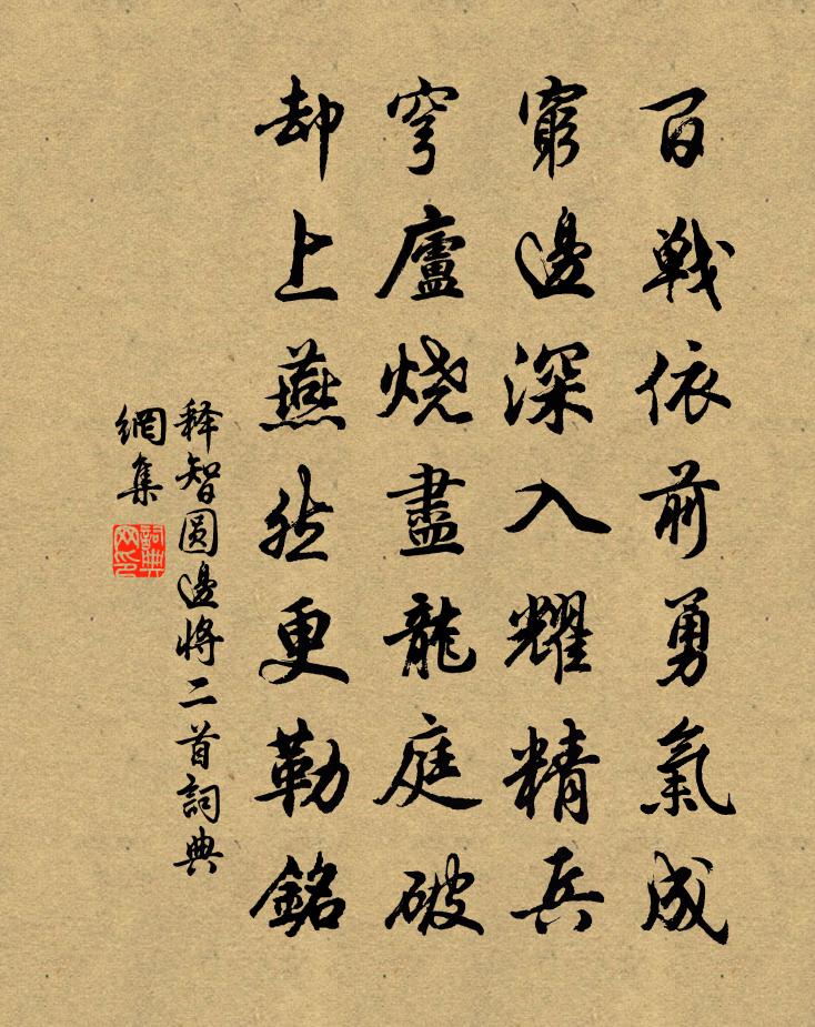 詩詞名句歷史字典書法欣賞書法字典國語詞典說文解字康熙字典古漢語字典標 題 作 者 詩 句 邊將二首作者:釋智圓 朝代:宋代邊將二首原文百戰依前勇氣成,窮邊深入耀精兵。穹廬燒盡龍庭破,卻上燕然更勒銘。詩詞問答問:邊將二首的作者是誰?答:釋智圓問:邊將二首寫於哪個朝代?答:宋代釋智圓邊將二首書法欣賞邊將二首書法作品詩詞推薦送姜夔堯章謁石湖先生楊萬里〔宋代〕釣璜英氣橫白蜺,欬唾珠玉皆新詩。江山愁欣鶯為泣,鬼神露索天泄機。彭蠫波心弄明月,詩星入腸肺肝裂。吐作庭花羅隱〔唐代〕昨日芳艷濃,開尊幾同醉。今朝風雨惡,惆悵人生事。南威病不起,西子老兼至。向晚寂無人,相偎墮紅淚。呈楊方叔姜特立〔宋代〕老醜慵看鏡,清狂愛作詩。雖酬真得侶,衰白亦相宜。復答迎郭侯犢車之句張耒〔宋代〕玉壺春酒射朝霞,只看纖腰不看花。但遣舟迎桃葉女,仍須恩賜短轅車。頌古三首釋祖先〔宋代〕應無所住以生心,大地山河一發沉。從此別開窮世界,新州柴把貴如金。雪後陸游〔宋代〕雪後晴初快,春前日漸長。菊根萌已動,梅藟意先香。禽語驚幽枕,冰消漲野塘。衰殘難出戶,不是嬾衣裳。馬上作貫休〔唐代〕柳岸花堤夕照紅,風清襟袖轡璁瓏。行人莫訝頻回首,家在凝嵐一點中。冬初雜興孫嵩〔宋代〕殘花與新蕊,不共橫斜枝。摧謝得清峭,獨照冰霜時。寒梅正如此,他木乃變衰。此由觀世物,特以厄見奇。古雲正月六日雪趙蕃〔宋代〕立春才十日,春事已交加。政苦詩材窘,欣逢眼界賒。漫天皆柳絮,何地是梅花。無復青簾覓,敲門問酒家。時人為屈突語佚名〔唐代〕寧食三斗艾,不見屈突蓋。寧服三斗蔥,不逢屈突通。番陽張君叔振觀予以其家雙瑞圖俾詩之叔振大姚勉〔宋代〕適齋詩仙人,吟境天寬廣。聞詩未識面,魚雁空來往。道周歘相遇,尉此積歲仰。煙林指深處,邀我稅塵鞅。入門公之還曾豐〔宋代〕公之還,謂常還兮,獨不謂公害。彈鼂冠,斯傳於馹,尚行於鵷。何以居之,宰臣白囏。豈無雞舌,輔以麋丸。於避暑煙水亭與王景文回紋聯句一首王阮〔宋代〕顏舒且對清樽酒,{景文}晝永方濃翠幄陰。{南卿}環佩響溪寒浪急,{景文}畫圖藏谷繡煙深。斑生石澗苔紋和子瞻和陶淵明雜詩十一首蘇轍〔宋代〕五年寓黃閣,盛服朝玄端。愧無昔人姿,謬作奇章遷。還從九淵底,回望百尺巔。身世俱一夢,往來適三餐。天公虎號南山一章黃庭堅〔宋代〕虎號南山,北風雨雪。百夫莫為,其下流血。相彼 * ,幾何不虎。父子相戒,是將食汝。百年歌陸機〔魏晉〕七十時。精爽狻損膂力愆。清水明鏡不欲觀。臨樂對酒轉無歡。攬形修發獨長嘆。和伯壽秘監韓維〔宋代〕曾陪道論接清歡,屈指於今四十年。不用笙歌娛上客,直將風月待高眠。黃花一醉猶能否,白首相逢是偶然。便欲午熱登多稼亭五首楊萬里〔宋代〕芒鞋葵扇頗蕭然,倦倚胡床不是眠。避暑無藏身去處,追涼行盡竹旁邊。太初宮楊備〔宋代〕三軍不食武昌魚,萬騎時遷建業居。曾得紫髯開國意,太初名是作宮初。題五泄瀑布四首喻良能〔宋代〕玉龍千丈自夭矯,飛雨十里長廉纖。愚柳一見心眼爽,未須界圍觀水簾。名句推薦聞君有兩意,故來相決絕。卓文君《白頭吟》 吾生如寄,尚想三徑菊花叢。楊炎正《水調歌頭·把酒對斜日》 江上雪,獨立釣漁翁。李綱《望江南·江上雪》 山泉散漫繞階流,萬樹桃花映小樓。元稹《離思五首》 不成便沒相逢日,重整釵鸞箏雁。張翥《陌上花·有懷》 楚水辭魚窟,燕山到雁家裴說《塞上曲》 琴里知聞唯淥水,茶中故舊是蒙山。白居易《琴茶》 晴野鷺鷥飛一隻,水葓花發秋江碧。皇甫松《天仙子·躑躅花開紅照水》 用之在於機,顯之在於勢。姜子牙《六韜·文韜·兵道》 林花謝了春紅,太匆匆。無奈朝來寒雨晚來風。李煜《相見歡·林花謝了春紅》