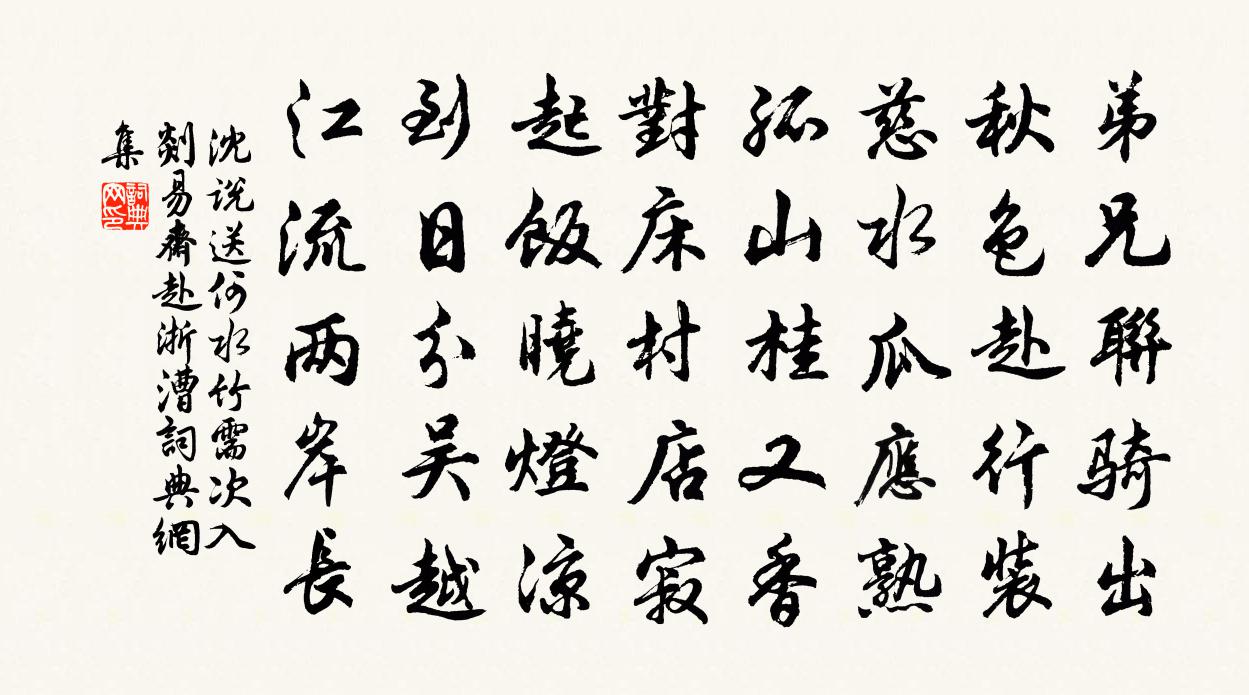 詩詞名句歷史字典書法欣賞書法字典國語詞典說文解字康熙字典古漢語字典標 題 作 者 詩 句 送何水竹需次入剡易齋赴浙漕作者:沈說 朝代:宋代原文弟兄聯騎出,秋色赴行裝。慈水瓜應熟,孤山桂又香。對床村店寂,起飯曉燈涼。到日分吳越,江流兩岸長。詩詞問答問:《送何水竹需次入剡易齋赴浙漕》的作者是誰?答:沈說問:該詩寫於哪個朝代?答:宋代書法欣賞送何水竹需次入剡易齋赴浙漕書法作品詩詞推薦長安龍圖陳學士寵示重陽日翠微樓上見覽拙詩魏野〔宋代〕京兆重陽大尹家,翠微樓上賞黃花。秦娥應怪停歌吹,看我狂詩到日斜。歲晏思歸五首宋庠〔宋代〕歲晏坐伊川,孤襟日惘然。無功堪載策,有路即防賢。寵辱丹心寸,年光素髮邊。含毫雖躑躅,自欲賦歸田。康秋惠詩和其韻二首杜范〔宋代〕春自桃園日正遲,懷人何以慰朝飢。自憐民事冥煩日,卻是詩人得句時。賀新郎黃升〔宋代〕席作此風送行春步。漸行行、山迴路轉,入雲深處。問訊花梢春幾許,半在詩人杖屐。點點是、祥煙膏露。中有瑤如夢令劉辰翁〔宋代〕寂歷柳風斜倚。錯莫夢雲難記。花影為誰重,一握鮫人絲淚。何事。何事。歷歷臉潮羞起。送方清孫參學劉克莊〔宋代〕仆負輕裝主倚轅,交遊握手若為言。須求沂水風雩樂,勿愛沙河夜市繁。曩日士曾宗郭太,它時我欲傳何蕃。殷勤賦棲真觀月季史彌寧〔宋代〕茶薌從臾訪棲真,闖戶蔫紅絕可人。不逐群芳更代謝,一生享用四時春。梅花喜神譜就實六枝宋伯仁〔宋代〕羽翼漢家了,忘形天地間。箇中有真樂,奚必拘商山。後天易吟三十首方回〔宋代〕宗廟烝嘗禮,朝廷覲見儀。無窮天下事,不過似農時。僧窗薛能〔唐代〕不悟時機滯有餘,近來為事更乖疏。朱輪皂蓋蹉跎盡,猶愛明窗好讀書。送董令升舍人歸朋溪二首王之道〔宋代〕仙舟東去訪金華,歌徹驪駒向水涯。試問玉堂司鳳詔,何如蓬島駕雲車。雨余翠筱初翻籜,風暖風葵欲放花。天氣讀梅聖俞詩張九成〔宋代〕吾生酒前輩後,酒不及識諸酒公。每讀酒諸公集,想見其音容。聖俞仁廟時,歐公最相知。春風一杯酒,夜坐數章同范景山到城西墺游鹿苑寺陳著〔宋代〕片帆帶月趁潮行,曉及三江作住程。上冢偶隴龐老去,過溪忽見遠公迎。山疑無路亦多路,鳥獨有聲時一聲。境自秋園詠物薛循祖〔宋代〕風急翅紛紛,遙空自作群。到來秋塞月,鳴入暮江雲。亂起千行字,俱飛一片文。高樓有思婦,嘹嚦豈堪聞。送元衛弟赴長亭鹽場樓鑰〔宋代〕阿連生而秀,二親所甚愛。仲兄勤拊養,遇事輒如誨。幹蠱靜而辦,胸次無卑隘。今焉職牢盆,官宇臨渤澥。毋謂暮春書懷寄董正翁寺正舒岳祥〔宋代〕尋春曾作太平民,說著花時淚濕巾。風雨差池桃杏過,山林牢落鳥烏親。書中悶見傷心事,畫裡思逢避世人。霄漢題鄒安齋詩卷羅公升〔宋代〕兵餘十八載,乃忽見此詩。乾坤發危涕,未論言語奇。古音乃泗磬,麗色藻鮫絲。想見堵牆人,傾倒落筆時。奈何好事近朱敦儒〔宋代〕短棹釣船輕,江上晚煙籠碧。塞雁海鷗分路,占江天秋色。錦鱗撥刺滿藍魚,取酒價相敵。風順片帆歸去,有何人和趙彥和祈晴郭印〔宋代〕靈宇祈昭霽,還車已報晴。高空開曠盪,遠樹見疏明。踴躍增行旅,歌謠遍耦耕。今年書大有,香飯亦炊秔。浮丘廟陳巨川〔宋代〕浮丘羽化幾經年,千仞青溪有洞天。丹灶石床依舊在,雲深何處問神仙。名句推薦擇子莫擇父,擇親莫擇鄰。佚名《增廣賢文·下集》 和氏之璧,不飾以五采;隋侯之珠,不飾以銀黃。其質至美,物不足以飾之。韓非及後人《韓非子·解老》 瀉水置平地,各自東西南北流。鮑照《擬行路難十八首》 入世冷挑紅雪去,離塵香割紫雲來。曹雪芹《訪妙玉乞紅梅》 集韻增廣,多見多聞。佚名《增廣賢文·上集》 落霞與孤鶩齊飛,秋水共長天一色。王勃《滕王閣序》 問君何事輕離別,一年能幾團圓月。納蘭性德《菩薩蠻·問君何事輕離別》 凡戰,所謂攻者,知彼者也。佚名《百戰奇略·第四卷·攻戰》 春江潮水連海平,海上明月共潮生。張若虛《春江花月夜》 人老去西風白髮,蝶愁來明日黃花。張可久《折桂令·九日》