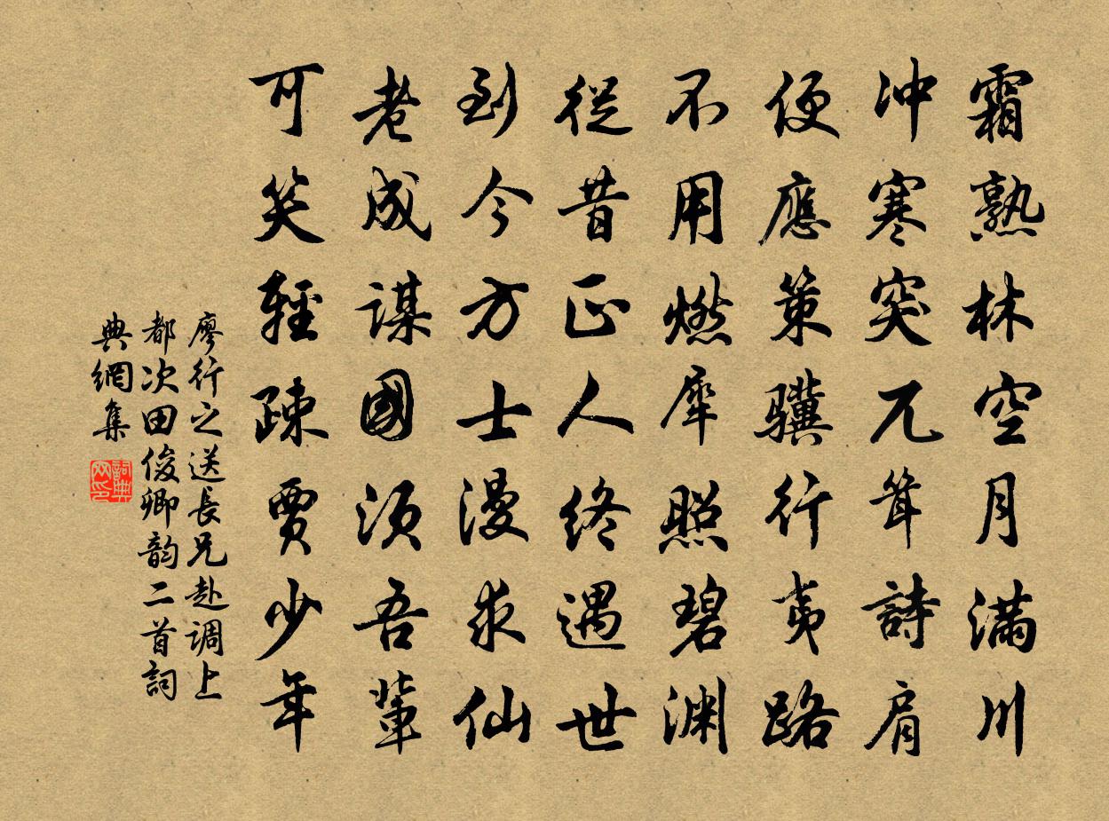 詩詞名句歷史字典書法欣賞書法字典國語詞典說文解字康熙字典古漢語字典標 題 作 者 詩 句 送長兄赴調上都次田俊卿韻二首作者:廖行之 朝代:宋代原文霜熟林空月滿川,沖寒突兀聳詩肩。便應策驥行夷路,不用燃犀照碧淵。從昔正人終遇世,到今方士漫求仙。老成謀國須吾輩,可笑輕疎賈少年。詩詞問答問:《送長兄赴調上都次田俊卿韻二首》的作者是誰?答:廖行之問:該詩寫於哪個朝代?答:宋代書法欣賞送長兄赴調上都次田俊卿韻二首書法作品詩詞推薦八功德水曾極〔宋代〕數斛供廚替八珍,穿松潄石瑩心神。中涵百衲煙霞色,不染齊梁歌舞塵。晚晴鄭獬〔宋代〕人間久厭雨,最快是初晴。驟見碧林影,喜聞歸雁聲。乾坤一甦醒,耳目兩聰明。寄語浮雲意,休來污太清。虎丘蘇耆〔宋代〕虎踞標靈跡,危樓杳靄間。劍池沉石壁,金地涌秋山。塔影松軒斷,雲迷蘚逕斑。磬隨靈籟盡,鶴伴老僧間。有句穆陵路陳存〔唐代〕西遊匣長劍,日暮湘楚間。歇馬上秋草,逢人問故關。孤村綠塘水,曠野白雲山。方念此中去,何時此路還。靜庵文同〔宋代〕問此初誰築,經營羨爾能。依深還巨木,就蔭覆高藤。坐與境同寂,來無人可憎。一床黃臥具,茂灌本如僧。開州園縱民遊樂二首蔡襄〔宋代〕風日朝來好,園林雨後清。游魚知水樂,戲蝶見春晴。草軟迷行跡,花深隱笑聲。觀民聊自適,不用管弦迎。蔡州蔣亭薛能〔唐代〕草徑徹林間,過橋如入山。蔡侯添水榭,蔣氏本柴關。靜泛窮幽趣,驚飛濕醉顏。恨無優俸買,來得暫時閒。步與解嘲十絕呈浩西堂釋紹嵩〔宋代〕崎巇世路九迴腸,兩鬢年深一鏡霜。身事龍鍾應是分,誰知貧樂異尋常。宿東魯父居二首張耒〔宋代〕夕陽低欲盡,春淺色蕭蕭。暝色催歸牧,炊煙向晚樵。疏星臨水際,遠火隔村橋。黯黯柴門夜,棲鴉對寂寥。走筆次韻芻父喜雨三首蘇泂〔宋代〕薰兮有南風,下此沛然雨。後天初震怒,盍燎緇黃侶。端來丹山鳳,況戢螽斯羽。君詩如民謠,能共天公語。次韻郭右曹黃庭堅〔宋代〕閱世行將老斲輪,那能不朽見仍雲。歲中日月又除盡,聖處工夫無半分。秋水寒沙魚得計,南山溫霧豹成文。古心清平樂(木犀)盧炳〔宋代〕玻璃翦葉。點綴黃金屑。雅淡幽姿風味別。翠影婆娑弄月。秋光占斷江南。清香鼻觀先參。一朵折來和露,烏雲髻秦皇石俞應僉〔宋代〕祖龍盛氣役神鞭,壁立無移只屹然。定見先朝陳寶化,陰靈寂寂笑求仙。送人游邵州狄煥〔唐代〕春江正渺渺,送別兩依依。煙里棹將遠,渡頭人未歸。漁家侵疊浪,島樹掛殘暉。況入湖湘路,那堪花亂飛。次韻和宣甫叔父遷謫過都見寄蘇頌〔宋代〕解組縱戎五筦城,壯謀期欲盪蠻腥。數奇不意同飛將,肺腑何因學衛青。報國有心猶慷慨,謫官無悶但沈冥。竹林和姚令威春晚即事許志仁〔宋代〕臥看遊絲媚遠天,起尋幽徑卻茫然。句成落絮飛花里,心在殘霞夕照邊。無復雙魚傳尺素,空餘寶瑟思華年。老來番陽喜晴贈幕僚袁甫〔宋代〕大江以樂,歲屢弗康。民病未蘇,正茲憂惶。一雨六旬。巨浸湯湯。我告上帝,是祈是禳。我來宿齋,室名朝陽。天闕山朱存〔唐代〕牛頭天際碧凝嵐,王導無稽亦宴談。若指遠山為上闕,長安應合指終南。蝶戀花黃裳〔宋代〕杳杳晴虛寒漫漫。放下塵勞,相共游銀漢。便入醉鄉休浩嘆。神仙只在雲門館。飲興偏宜流水畔。時有紅蕖,落在漁父(二)戴復古〔宋代〕漁父醉,釣竿閒。柳下呼兒牢繫船。高眠風月天。名句推薦借得山東煙水寨,來買鳳城春色施耐庵《念奴嬌·天南地北》 相恨不如潮有信,相思始覺海非深。白居易《浪淘沙·借問江潮與海水》 女為君子儒,無為小人儒。孔子弟子《論語·雍也篇》 花滿河陽,為君羞褪晨妝茜。吳文英《燭影搖紅·賦德清縣圃古紅梅》 望望不見君,連山起煙霧。李白《金鄉送韋八之西京》 滿川風雨獨憑欄,綰結湘娥十二鬟。黃庭堅《雨中登岳陽樓望君山》 有心為善,雖善不賞。無心為惡,雖惡不罰。蒲松齡《聊齋志異·卷一·考城隍》 殺一無罪,非仁也;非其有而取之,非義也。孟子《孟子·盡心章句上·第三十三節》 細草微風岸,危檣獨夜舟。杜甫《旅夜書懷》 勞心者治人,勞力者治於人。孟子《孟子·滕文公章句上·第四節》