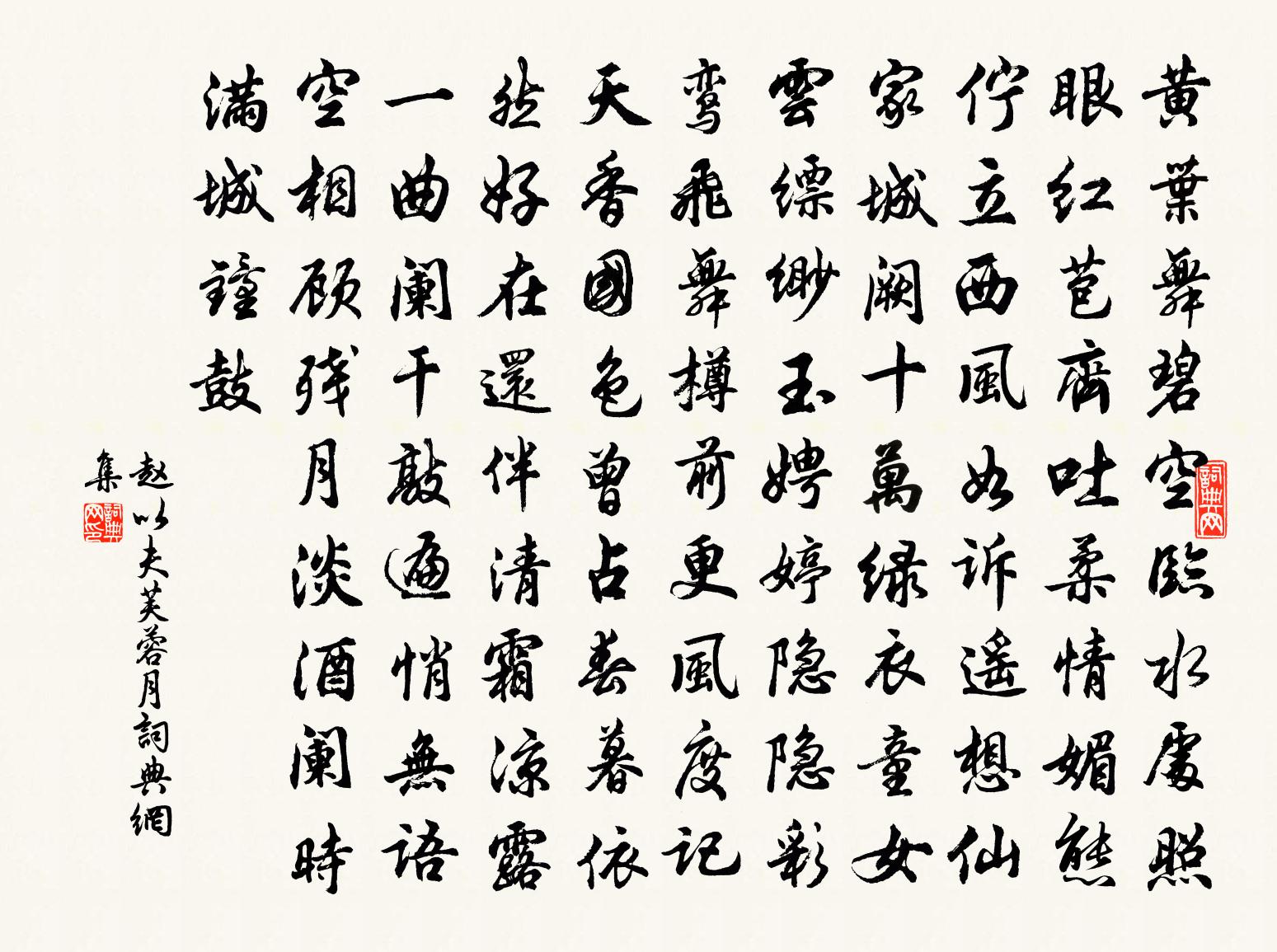 詩詞名句歷史字典書法欣賞書法字典國語詞典說文解字康熙字典古漢語字典標 題 作 者 詩 句 芙蓉月作者:趙以夫 朝代:宋代芙蓉月原文黃葉舞碧空,臨水處、照眼紅苞齊吐。柔情媚態,佇立西風如訴。遙想仙家城闕,十萬綠衣童女。雲縹緲,玉娉婷,隱隱彩鸞飛舞。樽前更風度。記天香國色,曾占春暮。依然好在,還伴清霜涼露。一曲闌乾敲遍,悄無語。空相顧。殘月淡,酒闌時、滿城鐘鼓。詩詞問答問:芙蓉月的作者是誰?答:趙以夫問:芙蓉月寫於哪個朝代?答:宋代趙以夫芙蓉月書法欣賞芙蓉月書法作品詩詞推薦摸魚兒·更能消幾番風辛棄疾〔宋代〕淳熙己亥,自湖北漕移湖南,同官王正之置酒小山亭,為賦更能消、幾番風雨。匆匆春又歸去。惜春長恨花開早,幾復讀莊子戲贈黃庭堅〔宋代〕蜩化搶榆枋,鵬化摶扶搖。大椿萬歲壽,糞英不重朝。有待於無待,定非各逍遙。譬如宿舂糧,所詣豈得遼。漆園和勝之雪霽借馬入局偶書司馬光〔宋代〕勝之家本公侯貴,弱冠英才已驚世。雒陽多士誰敢倫,千古比肩唯賈誼。昔遭絳灌深切齒,奔走十年為五吏。近主六州洪邁〔宋代〕堯傳舜,盛事千古難並。回龍馭,辭鳳掖,北內別有蓬瀛。為天子父,冊鴻名。萬年千歲福康寧。春秋不說楚冥靈上運使工部強至〔宋代〕網紀提諸郡,朝廷重外台。舉今持使柄,第一議公才。心計籠寰宇,時名薄斗魁。邦家經費足,山海利源開。待哺汴上留別李智父賀鑄〔宋代〕一馬西投汴水濱,自驚秋鬢帶塵紛。秋風盡日吹黃葉,心事經年寄白雲。去矣尺書勤訪我,醉來樽酒強酬君。北窗疏影趙文〔宋代〕寒泉濺雪,有環佩隱隱,飛度霜月。易水風寒,壯士悲歌,關山萬里離別。楊花浩蕩晴空轉,又化作、雲鴻霜鶻。自桃川至辰州絕句四十有二趙蕃〔宋代〕無策資身每自嗤,始謀不善悔何追。行乎患難寧今日,何暇更論淹速期。富陽陳大夫遣二吏抄俚文用寫道寓於文之意還曾豐〔宋代〕道固無方實以書,要於書悟道之虛。雷風水火易經始,草木魚蟲詩緒餘。萬理所歸為寶藏,一真之外是蘧廬。俚編次韻和馬都官宛溪浮橋梅堯臣〔宋代〕在昔當陽侯,建橋臨大川。洪波不為阻,馳道南北連。何此小溪上,擬象坦且平。馬頭分朱欄,水底裁碧天。白雨哭王子立次兒子迨韻三首蘇軾〔宋代〕彭城初識子,照眼白而長。異夢成先兆,(予為密州,子立未嘗相識,忽告同捨生曰:“吾夢為密州婿,何也?”舟過謝潭三首楊萬里〔宋代〕夾江百里沒人家,最苦江流曲更斜。嶺草已青今歲葉,岸蘆猶白去年花。醉太平·西湖尋夢王蘊章〔清代〕爐煙一窗,瓶花一床,更添十里湖光,對南屏晚妝。藕風氣香,竹風韻涼,等他月照迴廊,浴鴛鴦一雙。次韻題畫卷四首其二雪溪乘興蘇轍〔宋代〕亟往遄歸真曠哉,聾人不信有驚雷。雖雲不必見安道,已誤扁舟犯雪來。郊廟歌辭祀圜丘樂章豫和褚亮〔唐代〕歌奏畢兮禮獻終,六龍馭兮神將升。明德感兮非黍稷,降福簡兮祚休徵。夜讀韓子蒼文二首李石〔宋代〕四海文章六一仙,江西名派蜀人傳。從今元佑無多子,虎豹狐狸各斐然。鹹陽值雨溫庭筠〔唐代〕鹹陽橋上雨如懸,萬點空濛隔釣船。還似洞庭春水色,曉雲將入岳陽天。荊州新秋病起雜題一十五首病起見衰葉齊己〔唐代〕病起見衰葉,飄然似我身。偶乘風有韻,初落地無塵。縱得紅沾露,爭如綠帶春。因傷此懷抱,聊寄一篇新。龜山祭淮詞二首迎神張耒〔宋代〕木梟梟兮蒼山巔,回洑重深兮其下九淵。東風歌兮春水舞,庭肅肅兮神來下。神來下兮翠帷舉,谷冥冥兮春山雨。讀魏鶴山先生渠陽集五首方回〔宋代〕漢唐台閣畫功臣,何似宣尼從祀人。欲繪兩賢繼張呂,臨邛魏老建安真。名句推薦草色煙光殘照里,無言誰會憑闌意。柳永《蝶戀花·佇倚危樓風細細》 喜得故人同待詔,擬沽春酒醉京華。高啟《清明呈館中諸公》 清鏡無雙影,窮泉有幾重。顧況《酅公合祔輓歌》 柳色參差掩畫樓,曉鶯啼送滿宮愁。司馬扎《宮怨 / 閨怨》 歌舞尊前,繁華鏡里,暗換青青發。薩都剌《念奴嬌·登石頭城次東坡韻》 因病得閒殊不惡,安心是藥更無方。蘇軾《病中游祖塔院》 南渡君臣輕社稷,中原父老望旌旗。趙孟頫《岳鄂王墓》 驚風飄白日,忽然歸西山曹植《贈徐幹詩》 大雪壓青松,青松挺且直。陳毅《青松》 石門流水遍桃花,我亦曾到秦人家。李白《下途歸石門舊居》