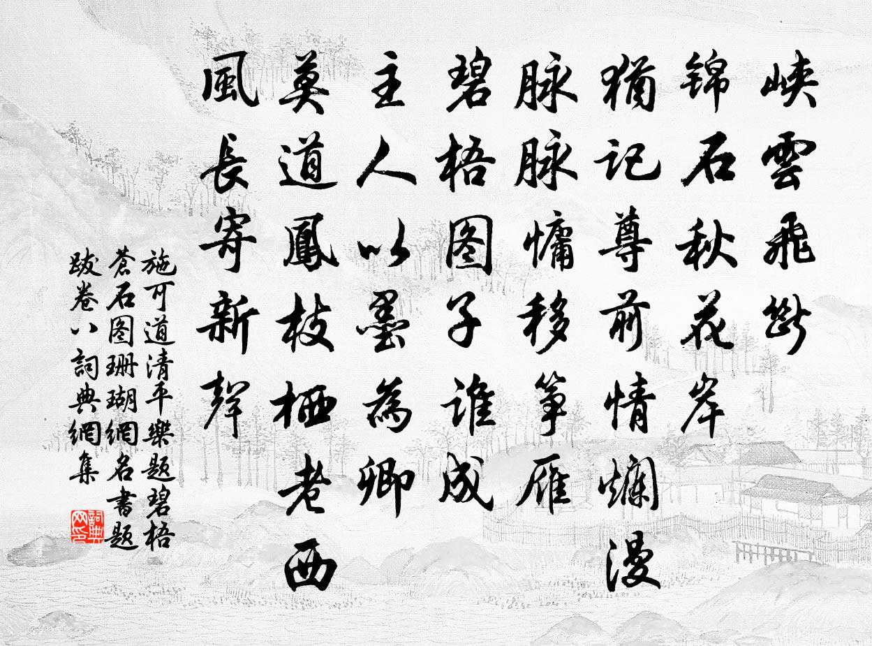 詩詞名句歷史字典書法欣賞書法字典國語詞典說文解字康熙字典古漢語字典標 題 作 者 詩 句 清平樂 題碧梧蒼石圖 珊瑚網名書題跋卷八作者:施可道 朝代:元代原文峽雲飛斷。錦石秋花岸。猶記尊前情爛漫。脈脈慵移箏雁。碧梧圖子誰成。主人以墨為卿。莫道鳳枝棲老,西風長寄新聲。詩詞問答問:《清平樂 題碧梧蒼石圖 珊瑚網名書題跋卷八》的作者是誰?答:施可道問:該詩寫於哪個朝代?答:元代問:該詩是什麼體裁?答:詞書法欣賞清平樂 題碧梧蒼石圖 珊瑚網名書題跋卷八書法作品詩詞推薦贈梁國惠康公主輓歌詞二首權德輿〔唐代〕外館嬪儀貴,中參睿渥深。初笄橫白玉,盛服鏤黃金。風度簫聲遠,河低婺彩沈。夜台留冊謚,悽愴即徽音。杳靄余寒王安石〔宋代〕余寒駕春風,入我征衣裳。捫鬢只得凍,蔽面尚疑創。士耳恐猶墜,馬毛欲吹僵。牢持有失箸,疾飲無留湯。曈曈新店道中 其一王冕〔元代〕黃桑葉落雁聲號,野鼠蹲沙北馬驕。萬里山河秋渺渺,一天風雨夜蕭蕭。客懷到此何由壯?酒興於人自覺饒。早起初發嘉州蘇轍〔宋代〕放舟沫江濱,往意念荊楚。擊鼓樹兩旗,勢如遠征戍。紛紛上船人,櫓急不容語。餘生雖江陽,未省至嘉樹。巉巉田無秋興蒲壽宬〔宋代〕草屋柴門風露涼,寒瓜收蔓力鋤荒。新栽莙薘恰逢雨,欲剪芹藍猶待霜。牧豎歸來煨芋熟,田翁相就潑醅香。里胥王敏節歡喜帖贊岳珂〔宋代〕秦火燎原,衣冠塗炭。繞指之柔,出乎百鍛。如公之剛,猶死憂患。時歟命歟,一覽三嘆。下元日扈蹕朝拜景靈宮宋庠〔宋代〕令月開真館,宸游薄太霄。躬行原廟禮,更作蕊宮朝。寶扇森排羽,仙輪恍御飈。霞觴浮桂液,瓊饌薦芝苗。日霽賜神童蔡伯禧宋真宗〔宋代〕七閔山水多才俊,三歲奇童出盛時。家世應傳清白訓,嬰兒自得老成資。初嘗學步來朝謁,方及能言解誦詩。更勵一日曲梅堯臣〔宋代〕妾家鄧侯國,肯愧邯鄲姝。世本富繒綺,嬌愛比明珠。十五學組紃,未嘗開戶樞。十六失所適,姓名傾里閭。十七早行陸游〔宋代〕寒漏參差斷,晨雞次第鳴。匆匆半枕夢,草草一杯羹。澤國多逢雨,閒人不計程。雲間出寸塔,迎我有餘情。感事祖無擇〔宋代〕東家木鐸德音遠,西竺金人像教來。禮樂不興王道絕,吾民何日遂康哉。子陵姜特立〔宋代〕足加帝腹狂奴態,自是君王禮數寬。四海但知天子貴,先生只作故人看。宿農家戴復古〔宋代〕門巷規模古,田園氣味長。小桃紅破萼,大麥綠銜芒。稚犬迎來客,歸牛帶夕陽。儒衣愧飄泊,相就說農桑。滿江紅(壽八十老人·十一月十六日)佚名〔宋代〕蓬島仙翁,元來是、神鍾岳瀆。喜遇生申時節,一陽來復。蓂莢合朝曾舞翠,月華昨夜圓如玉。展紅箋、泚筆染新詠毛女陳摶〔宋代〕曾折松枝為寶櫛,又編栗葉作羅襦。有時問著秦宮事,笑撚仙花望太虛。雜興十首以貧堅志士節病長高人情為韻陸游〔宋代〕君子尚大節,又甚惡不情,魯連故可人,用意終近名。千載高夷齊,採薇忘其生,周公述易象,所以貴幽貞。去聖吳徐夤〔唐代〕一主參差六十年,父兄猶慶授孫權。不迎曹操真長策,終謝張昭見碩賢。建業龍盤雖可貴,武昌魚味亦何偏。秦嬴謝天童老秋蘭鄭清之〔宋代〕秋色追隨入慧光,肯攜幽卉問行藏。深林未省炎涼態,來為閒人特地香。石樓朱南金〔宋代〕蒙茸披儘自成蹊,兩扇岩扉向日齊。說與白雲休鎖鑰,留將千古指人迷。封丘汪元量〔宋代〕今夜宿封丘,明朝過汴州。雲橫遮遠塞,水落見長洲。樹折棗初剝,藤枯瓜未收。傾囊沽一斗,聊以慰羈愁。名句推薦還作一段相思,冷波葉舞愁紅,送人雙槳。吳文英《解蹀躞·醉雲又兼醒雨》 尋桃覓柳,開遍南枝未覺。辛棄疾《瑞鶴仙·賦梅》 秋風吹地百草乾,華容碧影生晚寒。李賀《開愁歌》 性靈熔匠,文章奧府。淵哉鑠乎,群言之祖。劉勰《文心雕龍·宗經》 落日心猶壯,秋風病欲疏。杜甫《江漢》 太高人愈妒,過潔世同嫌。曹雪芹《紅樓夢·第五回》 永豐西角荒園裡,盡日無人屬阿誰。白居易《楊柳枝二首》 雨暗殘燈棋散後,酒醒孤枕雁來初。杜牧《齊安郡晚秋》 隨意春芳歇,王孫自可留。王維《山居秋暝》 青出於藍而勝於藍程登吉《幼學瓊林·卷二·師生》