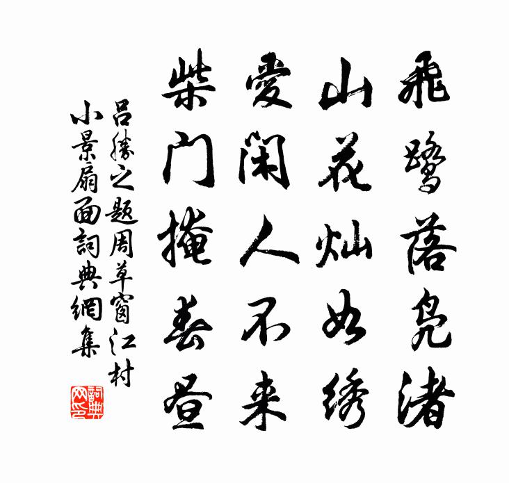 詩詞名句歷史字典書法欣賞書法字典國語詞典說文解字康熙字典古漢語字典標 題 作 者 詩 句 題周草窗江村小景扇面作者:呂勝之 朝代:宋代題周草窗江村小景扇面原文飛鷺落鳧渚,山花燦如繡。愛閒人不來,柴門掩春晝。詩詞問答問:題周草窗江村小景扇面的作者是誰?答:呂勝之問:題周草窗江村小景扇面寫於哪個朝代?答:宋代呂勝之題周草窗江村小景扇面書法欣賞題周草窗江村小景扇面書法作品詩詞推薦避暑陳允平〔宋代〕避暑入林扃,同僧坐竹亭。鳥飛晴地影,龍掛雨天形。掃葉鋪椰簟,臨流注石瓶。更無塵跡到,日落夢初醒。雪中簡林子長袁說友〔宋代〕玉沙飛墮何袞袞,一夜青山損顏色。此山底事厭青姿,故學何郎輕傅粉。曉來窗戶何人開,僵臥欲起驚皚皚。微風伍相廟周南〔宋代〕封域依神保,遺哀記屬鏤。荒庭垂白露,古屋換爰烏。配食虛神果,除壇欠闔閭。向來存二廟,猶得慰三吳。頌古一○一首釋子淳〔宋代〕妙相圓明不可親,奴兒婢子自殷勤。指天指地稱尊大,也是傳言送語人。上司空員外李洞〔唐代〕禪心高臥似疏慵,詩客經過不厭重。藤杖幾攜量磧雪,玉鞭曾把數嵩峰。夜眠古巷當城月,秋直清曹入省鍾。禹鑿原州九日趙時春〔明代〕秋聲咽塞笳,邊氣肅霜華。九日登高處,群山入望賒。蒼蒹仍碧水,綠酒對黃花。鴻鵠歸何處,長天空落霞。馮公嶺葉適〔宋代〕馮公此山民,昔開此山居。屈盤五十里,陟降皆林廬。公今去不存,耕鑿自有餘。鳳篁生谷隧,雨旆來岩虛。人隨幽居春暮書懷(一作石門暮春,一作藍田春暮)錢起〔唐代〕自哂鄙夫多野性,貧居數畝半臨湍。溪雲雜雨來茅屋,山雀將雛到藥欄。仙籙滿床閒不厭,陰符在篋老羞看。更憐上巳韓維〔宋代〕欄乾浮波走長橋,琉璃光中虹動搖。浪頭畫舸百龍首,鼓聲疊疊來塞慓。我欣禊事得壯觀,眼底不顧花飛飄。勸君漫歌八曲大回中元結〔唐代〕樊水欲東流,大江又北來。樊山當其南,此中為大回。回中魚好游,回中多釣舟。漫欲作漁人,終焉無所求。尋花劉言史〔唐代〕遊春未足春將度,訪紫尋紅少在家。借問流鶯與飛蝶,更知何處有幽花。赴北庭度隴思家岑參〔唐代〕西向輪台萬里餘,也知鄉信日應疏。隴山鸚鵡能言語,為報家人數寄書。胡彥功挽章中間家事少貶遂謝賓客絕饋餉者三姜特立〔宋代〕祖風文采秀儒林,父德幽遐玉有音。廷尉何妨謝諸客,鴟夷還復致千金。門前輿馬多英貴,架上圖書浩古今。欲識江蘺生幽渚沈約〔南北朝〕澤蘭被荒徑。孤芳豈自通。幸逢瑤池曠。得與金芝叢。朝承紫台露。夕潤綠池風。既美修嫮女。復悅繁華童。夙昔同李吏部伏日口號,呈元庶子、路中丞包佶〔唐代〕火炎逢六月,金伏過三庚。幾度衣裳汗,誰家枕簟清。頒冰無下位,裁扇有高名。吏部還開瓮,殷勤二客情。十六羅漢贊釋心月〔宋代〕飛錫五天雲冉冉,泛杯南海浪悠悠。一毫頭上輕收拾,不是冤家不聚頭。又次韻五首張嵲〔宋代〕行衣葉葉馬蕭蕭,快意寧知歸路遙。海上尖峰青似染,卻從雲外望岧嶢。擬古於石〔宋代〕東籬有佳菊,埋沒野草傍。草蔓日以滋,菊苗日以荒。生意幾欲息,菊短草何長。深秋嚴霜下,百草不復芳。采采月岩陸游〔宋代〕幾年不作月岩游,萬里重來已白頭。雲外連娟何所似?平羌江上半輪秋。秋江四絕滕岑〔宋代〕十日江頭一向風,差差寒浪白吹空。漁舠輊小不如葉,信意低昂風浪中。名句推薦念寒蛩殘夢,歸鴻心事,那聽江村夜笛。吳文英《瑞鶴仙·秋感》 重足而立,側目而視。司馬遷《史記·汲鄭列傳》 洞房昨夜停紅燭,待曉堂前拜舅姑。朱慶餘《近試上張籍水部 / 近試上張水部 / 閨意獻張水部》 望雲慚高鳥,臨水愧游魚。陶淵明《始作鎮軍參軍經曲阿作》 若待明朝風雨過,人在天涯!春在天涯。虞集《南鄉一剪梅·招熊少府》 石門流水遍桃花,我亦曾到秦人家。李白《下途歸石門舊居》 最愛東山晴後雪,軟紅光里涌銀山。楊萬里《最愛東山晴後雪》 何處飛來林間鵲,蹙踏松梢微雪。辛棄疾《賀新郎·把酒長亭說》 參軍春思亂如雲,白髮題詩愁送春歐陽修《春日西湖寄謝法曹歌》 父子之嚴,不可以狎;骨肉之愛,不可以簡。顏之推《顏氏家訓·教子篇》