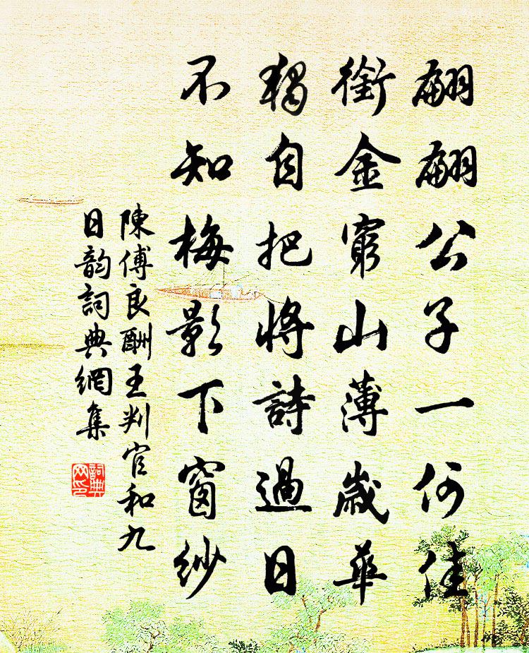 詩詞名句歷史字典書法欣賞書法字典國語詞典說文解字康熙字典古漢語字典標 題 作 者 詩 句 酬王判官和九日韻作者:陳傅良 朝代:宋代酬王判官和九日韻原文翩翩公子一何佳,銜金窮山薄歲華。獨自把將詩過日,不知梅影下窗紗。詩詞問答問:酬王判官和九日韻的作者是誰?答:陳傅良問:酬王判官和九日韻寫於哪個朝代?答:宋代陳傅良酬王判官和九日韻書法欣賞酬王判官和九日韻書法作品詩詞推薦衛公堂二首曾協〔宋代〕衛公精爽故依然,陳跡淒涼不記年。亭遠謾傳曾起草,樓高無復見籌邊。新銘初勒風煙上,舊觀都忘歲月遷。從此橫吹曲辭。梅花落劉方平〔唐代〕新歲芳梅樹,繁苞四面同。春風吹漸落,一夜幾枝空。小婦今如此,長城恨不窮。莫將遼海雪,來比後庭中。山歌三首白玉蟾〔宋代〕典釵賣釧買中秋,買得中秋醉又休。明日酒醒無米煮,兒啼妻怨甚來由。苦寒行二首張耒〔宋代〕茫茫楚鄉仲冬月,白屋無煙飛走絕。空林號風冰斷枝,長淮無人冰照雪。凍埋釣艇不復漁,南羹未嚼淮中魚。要須酬孟武昌苦雪元結〔唐代〕積雪閒山路,有人到庭前。雲是孟武昌,令獻苦雪篇。長吟未及終,不覺為悽然。古之賢達者,與世竟何異。不能和陳水雲湖莊韻趙師秀〔宋代〕巷南與巷北,相去路無多。以我常孤坐,勞君數見過。望山嫌夕靄,聽雨想春波。稍俟晴明日,相攜一醉歌。鎖蓮燈史鳳〔唐代〕燈鎖蓮花花照罍,翠鈿同醉楚台巍。殘灰剔罷攜縴手,也勝金蓮送轍回。陳情獻蜀皇帝貫休〔唐代〕河北江東處處災,唯聞全蜀勿塵埃。一瓶一缽垂垂老,千水千山得得來,奈菀幽棲多勝景,巴歈陳貢愧非才。自慚壽崇節致語口號王義山〔宋代〕東極承顏肅紫宸,恩醲湛露燕群臣。香傳禁柳鳴球瑟,影顫宮花藹縉紳。璀璨祥光三殿曉,怡愉和氣萬年春。明朝郊廟歌辭。太清宮樂章。真和佚名〔唐代〕玉磬含香,金爐既馥。風馭泠泠,雲壇肅肅。杳歸大象,霈流嘉福。俾寧萬邦,無思不服。菩薩蠻·庭葉翻翻秋向晚張孝祥〔宋代〕庭葉翻翻秋向晚。涼砧敲月催金剪。樓上已清寒。不堪頻倚欄。鄰翁開社瓮。喚客情意重。不醉且無歸。醉時歸路好事近·飛雪過江來呂渭老〔宋代〕飛雪過江來,船在赤欄橋側。惹報布帆無恙,著兩行親札。從今日日在南樓,鬢自此時白。一詠一觴誰共,負平生念奴嬌 高座寺鄭燮〔清代〕暮雲明滅,望破樓隱隱,臥鍾殘院。院外青山千萬疊,階下流泉清淺。鴉噪松廊,鼠翻經匣,僧與孤雲遠。空梁蛇葉少蘊生朝三首張元乾〔宋代〕綠髮翶翔翰苑春,昇平三輔已朱輪。詩成山谷句中眼,名應石林天上人。耆舊政須廊廟具,蕃宣聊寄股肱臣。生朝泊龍灣方岳〔宋代〕安得蓬籠雨一蓑,蘆花深處臥煙波,籌邊事付韓擒虎,種樹書傳郭橐駝。從古市朝如此耳,攙閒天地奈之何。秫田謁金門(春情)趙善扛〔宋代〕新雨霽。開遍滿園桃李。波暖池塘風細細。一雙花鴨戲。喚起春融睡美。扶醉宿妝慵理。移步避入花影里。繡裙低洗心司馬退之〔唐代〕不踐名利道,始覺塵土腥。不味稻粱食,始覺精神清。羅浮奔走外,日月無短明。山瘦松亦勁,鶴老飛更輕。逍遙送薛水部通判并州歐陽修〔宋代〕胸懷磊落逢知己,氣略縱橫負壯心。玉麈生風賓滿坐,金鱗照甲士如林。牛羊日暖山田美,雨雪春寒土屋深。自古贈陳起劉克莊〔宋代〕陳侯生長紛華地,卻以芸香自沐薰。鍊句豈非林處士,鬻書莫是穆參軍。雨檐兀坐忘春去,雪案清談至夜分。何日和徐鼎臣見寄包穎〔唐代〕平生中表最情親,浮世那堪聚散頻。謝朓卻吟歸省閣,劉楨猶自臥漳濱。舊遊半似前生事,要路多逢後進人。且喜名句推薦天地之道,可一言而盡也。其為物不貳,則其生物不測。子思《中庸·第二十六章》 亦余心之所善兮,雖九死其猶未悔。屈原《離騷》 仰天大笑出門去,我輩豈是蓬蒿人。李白《南陵別兒童入京》 野曠天低樹,江清月近人。孟浩然《宿建德江》 況是清明好天氣,不妨游衍莫忘歸。程顥《郊行即事》 心生,種種魔生;心滅,種種魔滅。吳承恩《西遊記·第十三回》 君知否,是山西將種,曾系詩盟。劉過《沁園春·張路分秋閱》 卻下水晶簾,玲瓏望秋月。李白《玉階怨》 虜騎聞之應膽懾,料知短兵不敢接,車師西門佇獻捷。岑參《走馬川行奉送出師西征 / 走馬川行奉送封大夫出師西征》 雪虐風饕愈凜然,花中氣節最高堅。陸游《落梅》