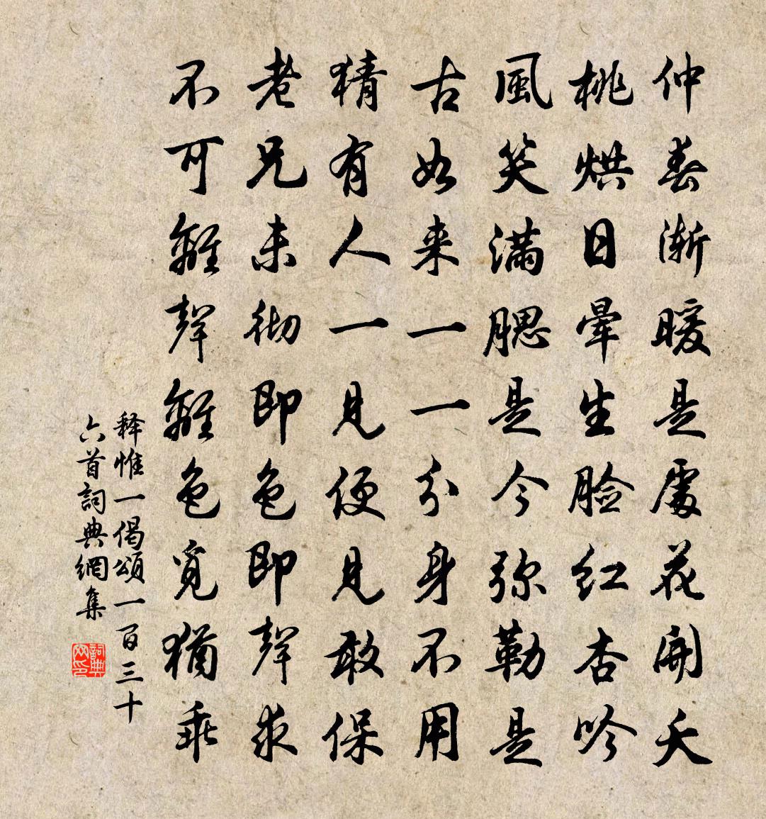 詩詞名句歷史字典書法欣賞書法字典國語詞典說文解字康熙字典古漢語字典標 題 作 者 詩 句 偈頌一百三十六首作者:釋惟一 朝代:宋代偈頌一百三十六首原文仲春漸暖,是處花開。夭桃烘日暈生臉,紅杏吟風笑滿腮。是今彌勒,是古如來,一一分身不用猜。有人一見便見,敢保老兄未徹。即色即聲求不可,離聲離色覓猶乖。詩詞問答問:偈頌一百三十六首的作者是誰?答:釋惟一問:偈頌一百三十六首寫於哪個朝代?答:宋代釋惟一偈頌一百三十六首書法欣賞偈頌一百三十六首書法作品詩詞推薦偈頌一百二十三首釋普度〔宋代〕船來也到,陸來也到。船來陸來,紅日杲杲。白雲缺處燒痕青,春在少林元不老。十一月十二日枕上曉作范成大〔宋代〕竹響風成陣,窗明雪已花。柴扉吟凍犬,紙瓦啄飢鴉。宿酒欺寒力,新詩管歲華。日高猶擁被,蓐食媿鄰家。哭蔡彥規二首張耒〔宋代〕文章不世用,淪落掩山阿。命也人無奈,悲哉天謂何。至交嗟我少,雙淚為君多。遙想山陽暮,秋風吹薜蘿。酬樂天醉別元稹〔唐代〕前回一去五年別,此別又知何日回。好住樂天休悵望,匹如元不到京來。知盧可庵教諭鼓歌何夢桂〔宋代〕崇牙樅樅,賁鼓逢逢。始作這以荊衡底貢之新革,試叩之以巴蜀故產之孤桐。雷震一聲草木拆,蠖信其屈龍起蟄。清明日欲宿石門,未到而風雨大作,泊靈星小楊萬里〔宋代〕波濤端不為君休,風雨何曾管客愁。自古詩人磨不倒,一樽大笑謝陽侯。題梅圖陳深〔宋代〕玉妃還絳嵌,委佩煙江演。瑤華振英采,照曜山水春。海若不敢受,謂是天上珍。掌管倩姮氏,封妨煩滕神。風標扈蹕建康道中值雪二首曹勛〔宋代〕雷動天旋從六龍,更催時雪下雲空。師行銀色光中地,鳥過瓊瑤草木中。徒然萬里行所得惟一莊王翬父泥溪別時語也戲洪咨夔〔宋代〕徒然萬里行,所得惟一莊。莊中果何有,蕎赤靡菽黃。豐歲誰可口,凶年或充腸。旦旦勤櫛耨,謹勿令莊荒。秀亭秋懷十五首方回〔宋代〕一針落大海,萬古無還期。纖纖刺繡女,斷腸終爾思。物重干將去,心愿精衛為。鄰嫗適有此,殷勤來獻之。銛鋒恭謝慶成詩十闋武衍〔宋代〕麝蠟籠紗粲玉階,珠櫳齊撤九門開。一天星斗明如月,法駕徐擎出殿來。蘭釋行海〔宋代〕紫莖綠葉帶春陰,千古湘江一寸心。今日已無君子佩,不如瀟灑在深林。明師見和梅詩再用韻兼奉送還福唐王銍〔宋代〕斲輪妙手聲名歇,誰信出門猶合轍。後來世外有高禪,凜凜蘭摧並玉折。久將生死付八還,不數圖書號三絕。詩來山居雜詩九十首曹勛〔宋代〕卜居得幽勝,景物無升沉。峰巒環郛郭,松竹排園林。時時破寂寥,悠悠賴鳴禽。於焉自有得,天籟皆餘音。夜直秘閣呈王敏甫蘇軾〔宋代〕蓬瀛宮闕隔埃氛,帝樂天香似許聞。瓦弄寒蟾鴛臥月,樓生晴靄鳳盤雲。共誰交臂論今古,只有閒心對此君。大隱牡丹李商隱〔唐代〕壓徑復緣溝,當窗又映樓。終銷一國破,不啻萬金求。鸞鳳戲三島,神仙居十洲。應憐萱草淡,卻得號忘憂。豐樂亭小飲歐陽修〔宋代〕造化無情不擇物,春色亦到深山中。山桃溪杏少意思,自趁時節開春風。看花游女不知醜,古妝野態爭花紅。人生象弈一首呈葉潛仲劉克莊〔宋代〕小藝無難精,上智有未解。君看橘中戲,妙不出局外。屹然兩國立,限以大河界。連營凜中權,四壁設堅械。三十水調歌頭(趙帥聖用生日)王之道〔宋代〕顥氣遍寰宇,風露逼衣裘。中秋昨夜,明月千里滿西樓。人道當年今日,海上騎鯨仙客,乘興下瀛州。雅志在扶世贈陳先生三首白玉蟾〔宋代〕木人手裡揮泥劍,石女頭邊帶鐵花。龍漢元年冬上巳,相逢一盞趙州茶。名句推薦酒闌更喜團茶苦,夢斷偏宜瑞腦香。李清照《鷓鴣天·寒日蕭蕭上瑣窗》 回雁峰前路,煙樹正蒼蒼葛長庚《水調歌頭·江上春山遠》 萬頃風濤不記蘇。雪晴江上麥千車。蘇軾《浣溪沙·萬頃風濤不記蘇》 雪似梅花,梅花似雪。呂本中《踏莎行·雪似梅花》 黃雞白酒,君去村社一番秋。辛棄疾《水調歌頭·送楊民瞻》 凡戰,所謂攻者,知彼者也。佚名《百戰奇略·第四卷·攻戰》 一生一代一雙人,爭教兩處銷魂。納蘭性德《畫堂春·一生一代一雙人》 日暮長江里,相邀歸渡頭。儲光羲《江南曲四首》 水繞陂田竹繞籬,榆錢落盡槿花稀。張舜民《村居·水繞陂田竹繞籬》 那年離別日,只道住桐廬。劉采春《囉嗊曲·那年離別日》