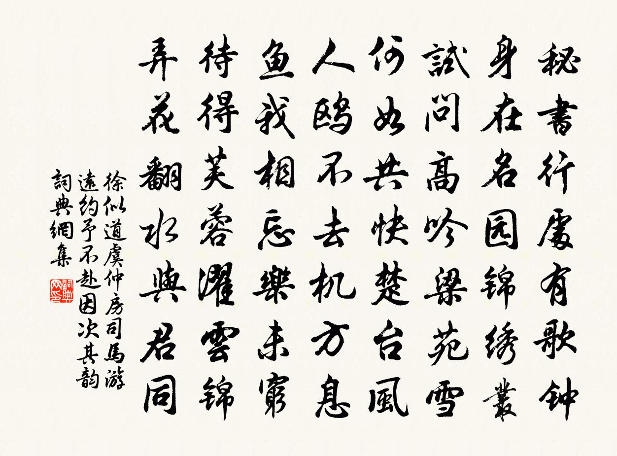 詩詞名句歷史字典書法欣賞書法字典國語詞典說文解字康熙字典古漢語字典標 題 作 者 詩 句 虞仲房司馬游遠約予不赴因次其韻作者:徐似道 朝代:宋代原文秘書行處有歌鐘,身在名園錦繡叢。試問高吟梁苑雪,何如共快楚颱風。人鷗不去機方息,魚我相忘樂未窮。待得芙蓉濯雲錦,弄花翻水與君同。詩詞問答問:《虞仲房司馬游遠約予不赴因次其韻》的作者是誰?答:徐似道問:該詩寫於哪個朝代?答:宋代書法欣賞虞仲房司馬游遠約予不赴因次其韻書法作品詩詞推薦山園陸游〔宋代〕山園寂寂閉春風,個裡天教著放翁。萬事已拋孤枕外,一尊常醉亂花中。閒隨戲蝶忘形久,細聽啼鶯得意同。月桂聖政更新詔書正告訐之罪因得小詩十首韓元吉〔宋代〕近聞羔雁已成群,藻鑒渠能涇渭分。急士且須侯雍齒,得賢端可吏朱雲。宋頌九首莫醜石介〔宋代〕皇祖曰嘻,天生蒸民。立之君長,以養以仁,乃予不恤,匪鋹之嚚。西山尋辛諤孟浩然〔唐代〕漾舟乘水便,因訪故人莊。落日清川里,誰言獨羨魚?石潭窺洞徹,沙岸歷紆徐。竹嶼見垂釣,茅齋聞讀書。款言無夢令馬鈺〔元代〕三鼓孤眠內守。重把玄門頻扣。喚覺箇中人,自是玉關無漏。無漏。無漏。奼女嬰兒攜手。題元子故宅文有年〔宋代〕漫郎百事皆漫爾,獨有溪山認作吾。念無一物鎮泉石,生怕偃蹇羞吾徒。靈武中興功掩德,天地大義須人扶。寧將王更令王哲〔元代〕二更分,鼓聲按。勻勻打,自然虎龍交換。清氣神、各住丹房,也並無錯亂。撞透重樓知片段。這玉液瓊漿,往來蜀四賢詠鮑照〔南北朝〕渤渚水浴鳧。舂山玉抵鵲。皇漢方盛明。羣龍滿階閣。君平因世閒。得還守寂寞。閉簾注道德。開封述天爵。相如浣溪沙陳允平〔宋代〕十二珠簾繡帶垂。柳煙迷暗楚江涯。自攜玉笛憑丹梯。寫恨鸞箋凝粉淚,踏青鴛襪濺金泥。落紅深處亂鶯啼。次張龍山韻反騷馬廷鸞〔宋代〕雪柏霜松自有神,衝風槁葉故難禁。雲間已閟貞元曲,歲晚誰聞正始音。天地有窮歸幻化,聖賢無命亦山林。愁來薊丘覽古贈盧居士藏用之四 燕太子陳子昂〔唐代〕秦王日無道。太子怨亦深。一聞田光義。匕首贈千金。其事雖不立。千載為傷心。元日平江作陳藻〔宋代〕草粿京糰要賀年,玉融風俗不同天。元正犯醉長洲市,又憶浮家厭海鮮。紅梅蘇泂〔宋代〕空牆碧水芳菲處,泣盡胭脂恨不銷。不遣二妃陪舜葬,故應淚沁雪枝條。八聲甘州汪莘〔宋代〕惜餘春、蛺蝶引春來,杜鵑趣春歸。算何如桃李,渾無言說,開落忘機。多謝黃鸝舊友,相逐落花飛。芳草連天遠偈頌二十二首釋道生〔宋代〕明星覷著眼睛枯,絕後何曾得再蘇。堪笑堪悲緣底事,一年一度被茶糊。依韻奉和經略司徒侍中寒食後池詩二首強至〔宋代〕放懷吟笑艷陽天,誰似征西相國賢。春酒丁寧終席滿,風花點檢幾枝全。柳間鶯踏柔條軟,池面魚吹細浪圓。東閣休日城上三首楊萬里〔宋代〕望中遠樹各依行,春後新晴未斷霜。池面得風呈縐碧,梅須經雨褪危黃。送鄧舍人將漕西淮用舍人坐上詩韻虞儔〔宋代〕醉里誰分主與賓,離觴到後莫辭頻。感懷今日知何日,屈指三春破二春。北郭忍教風送客,江湖猶賴雨留人。晚晴偈頌一百零二首釋慧遠〔宋代〕大哉花釋迦文,花生下便作花怪。南北花東西行,點胸也忒殺。棄捨輪王位,反受父母拜。六載向雪山,精進修淨嘆屩詞艾性夫〔宋代〕履穿無下嘆東郭,桃椎尚欠居士屩。是誰業屨捆秋芒,絕勝編棕便行腳。花泥溶溶草露滴,山石幽幽苔煙碧。江南名句推薦嶺樹重遮千里目,江流曲似九迴腸。柳宗元《登柳州城樓寄漳汀封連四州》 去年相送,餘杭門外,飛雪似楊花。蘇軾《少年游·潤州作》 雲物不殊鄉國異,教兒且覆掌中杯。杜甫《小至》 無言獨上西樓,月如鉤。寂寞梧桐深院鎖清秋。李煜《相見歡·無言獨上西樓》 蓬門未識綺羅香,擬托良媒益自傷。秦韜玉《貧女》 末俗以繁華相尚,終覺冷淡處趣味彌長。王永彬《圍爐夜話·第 * 則》 芳草年年惹恨幽。想前事悠悠。石延年《燕歸梁·春愁》 陽春布德澤,萬物生光輝。佚名《長歌行》 十年一覺揚州夢,贏得青樓薄倖名。杜牧《遣懷》 此時瞻白兔,直欲數秋毫。杜甫《八月十五夜月二首》
