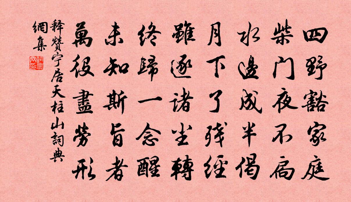 詩詞名句歷史字典書法欣賞書法字典國語詞典說文解字康熙字典古漢語字典標 題 作 者 詩 句 居天柱山作者:釋贊寧 朝代:宋代居天柱山原文四野豁家庭,柴門夜不扃。水邊成半偈,月下了殘經。雖逐諸塵轉,終歸一念醒。未知斯旨者,萬役盡勞形。詩詞問答問:居天柱山的作者是誰?答:釋贊寧問:居天柱山寫於哪個朝代?答:宋代釋贊寧居天柱山書法欣賞居天柱山書法作品詩詞推薦同誼夫國才餞季然於普門院取壁間五字詩各探王灼〔宋代〕塵榻為子下,柴扉為子開。從今斷還往,一室長莓苔。書意陸游〔宋代〕養生慕黃老,為治法唐虞。耆壽緣憂懼,危亡坐燕娛。大川宜利涉,蔓草戒難圖。退士惟身慮,銘膺豈敢無!送河南皇甫少尹赴絳州劉禹錫〔唐代〕祖帳臨周道,前旌指晉城。午橋群吏散,亥字老人迎。詩酒同行樂,別離方見情。從此洛陽社,吟詠屬書生。過魯公觀牡丹戲成小詩呈席上諸公李彌遜〔宋代〕昨日花間風送雨,淚眼凝愁暗無語。今日花間天色明,向人艷冶百媚生。雨中多思晴亦好,日日看花被藥惱。人間送張聖民學士知登州梅堯臣〔宋代〕慕君才行美,風義亦倜儻。在遠恨未逢,既近不屢往。非以近為輕,恃易遂成曩。倏為東牟守,別我駐征鞅。又作偈頌六十首釋曇華〔宋代〕金佛不度爐,木佛不度火。泥佛不度水,真佛屋裹坐。萬牛挽不回,千個與萬個。好事積如山,祗緣輕放過。不放大駕親征曹勛〔宋代〕驕虜敗盟至,飲馬淮之沱。煙塵犯江漢,腥膻連岷峨。王師因雷動,虎臣亦星羅。靈旗盪醜類,鐵馬馳琱戈。三軍照水梅張道洽〔宋代〕照影寒溪水,溪中水也香。佳人臨寶鑑,自作壽陽妝。西郊尋梅范成大〔宋代〕西郊梅花矜絶豔,走馬獨來看不厭。似羞流落蒙市塵,寧墮荒寒傍茅店。翛然自是世外人,過去生中差一念。淺顰賀新郎周紫芝〔宋代〕白首歸何晚。笑一椽、天教負與,楚江南岸。門外春山晚無數,只有匡廬似染。但想像、紅妝不見。誰念香山當日題曾氏園林張祜〔唐代〕十畝長堤宅,蕭疏半老槐。醉眠風卷簟,棋罷月移階。斫樹遺桑斧,澆花濕筍鞋。還將齊物論,終歲自安排。首尾吟邵雍〔宋代〕堯夫非是愛吟詩,詩是堯夫注思時。事少全由心意足,病多休道藥難醫。情當少日須思老,志在安時莫忘危。天道禺山方信孺〔宋代〕禺山何事作番山,空有陂陀跡已漫。今日升堂聽絲竹,沉香不見舊闌乾。書感陸游〔宋代〕鴨子陂頭看水生,蜂兒園裡按歌聲。天公用意誰能測?未許吾曹醉太平。戲答荊州王充道烹茶四首黃庭堅〔宋代〕龍焙東風魚眼湯,箇中即是白雲鄉。更煎雙井蒼鷹爪,始耐落花春日長。哭潘義榮二首鄭剛中〔宋代〕沈約樓前落葉黃,朝來玉折報潘郎。一區每嘆如懸馨,三版俄驚戒若堂。泉石半生閒日月,絲綸餘事人文章。但應曾著作之父文恩判院輓詩項安世〔宋代〕後有兒如許,前瞻祖自然。詩書三世驗,鄉黨一辭賢。遂失升堂願,徒供相柩篇。吾衰真久矣,祗此亦關天。龍門八詠下山劉長卿〔唐代〕誰識往來意,孤雲長自閒。風寒未渡水,日暮更看山。木落眾峰出,龍宮蒼翠間。謾書周邦彥〔宋代〕舊識回文譜,新諧遠調謳。望歸朝對鏡,合飲夜藏鉤。融蠟粘花蔕,燒檀暖麝油。雙眉誰與畫,張敞自風流。暮春泛西湖次口號韻呈程待制十首陳造〔宋代〕已規觴詠了餘齡,逕自無何到大庭。左界何人與調護,酒星移近少微星。名句推薦柳垂江上影,梅謝雪中枝。晏幾道《臨江仙·身外閒愁空滿》 玉人垂釣理纖鉤。月明池閣夜來秋。吳文英《浣溪沙·秋情》 城雪初消薺菜生,角門深巷少人行。楊載《到京師》 惡人自有惡人磨。施耐庵《水滸傳·第三十回》 溪雲初起日沉閣,山雨欲來風滿樓。許渾《鹹陽城東樓 / 鹹陽城西樓晚眺 / 西門》 福無雙至,禍不單行。張南莊《何典·第三回》 待約個梅魂,黃昏月淡,與伊深憐低語。柳如是《金明池·詠寒柳》 窈窕淑女,君子好逑。佚名《關雎》 尋尋覓覓,冷冷清清,淒悽慘慘戚戚。李清照《聲聲慢·尋尋覓覓》 梧桐更兼細雨,到黃昏、點點滴滴。李清照《聲聲慢·尋尋覓覓》