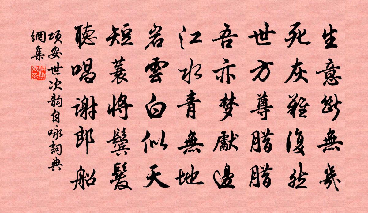 詩詞名句歷史字典書法欣賞書法字典國語詞典說文解字康熙字典古漢語字典標 題 作 者 詩 句 次韻自詠作者:項安世 朝代:宋代次韻自詠原文生意斷無幾,死灰難復然。世方尊臘臘,吾亦夢先邊。江水青無地,岩雲白似天。短蓑將鬢髮,聽唱謝郎船。詩詞問答問:次韻自詠的作者是誰?答:項安世問:次韻自詠寫於哪個朝代?答:宋代項安世次韻自詠書法欣賞次韻自詠書法作品詩詞推薦和文潛試院道舊晁補之〔宋代〕璧月照歌淮上舫,姚花引醉福昌城。何如閶闔門西北,臥聽秋風枕畔聲。題臥屏十八花薔薇葛立方〔宋代〕香風細細入東榮,嫩刺柔條疊絳英。飛下神霞緣底事,剪來曾傅董雙成。送鞏漢卿同年赴五原理掾宋祁〔宋代〕再赴天官調,仍還多士鄉。華陰餘霧散,光祿故垣長。春柳侵湖綠,秋雲際幕黃。片言民訟息,編美冠州堂。枕簟入林僻花瓜留客遲十韻葉茵〔宋代〕譚壘爭塵清,詩壇傳令急。今日有公事,俗駕不可人。重寄郭衢州許月卿〔宋代〕細數東京士,無如許郭優。山林異朝市,姓字欠書郵。久已巢由隱,難成李郭舟。三衢春有腳,山屋好中秋。次韻滕和叔投贈方岳〔宋代〕猶及溪齋識老成,萬琅玕外一溪清。諸郎與我雪燈共,兩眼觀書霜月明。二十一年如夢過,五三六籍尚誰賡。鹿車和立齋芙蓉觀三十韻王柏〔宋代〕我觀神仙傳,詭幻何紛紜。或生歆慕意,方土爭愚君。政徹既多欲,仙材隔幾塵。澄神黜粗穢,有時繙黃庭。年少葉公秉、王仲至見和,次韻答之蘇軾〔宋代〕袗絺方暑亦堪朝,歲晚淒風憶皁貂。共喜鵷鸞歸禁篽,心知日月在重霄。君如老驥初遭絡,我似枯桑不受條。強鑷再用前韻謝吳竹修陳著〔宋代〕禿髠歸陽羨,仙髯臥古藤。前賢成昨夢,後輩嗣誰鐙。傾蓋欣如故,吟壇得共登。春風吹相聚,聊此寄韋冰。西江月馬鈺〔元代〕臥化勝如坐化,修行所貴真常。假軀難以做馨香。何必臨歸著要。說破飛升一著,成仙只是神光。天宮無用臭皮囊李丞相綱生朝三首張元乾〔宋代〕希世推英偉,行藏孰是非。橫流曾砥柱,袖手且深衣。槐影搖黃合,星躔煥紫微。山林愚已老,袞繡看公歸。鳳棲梧 以上三首見中州樂府景覃〔元代〕百歲中分,流年過半,塵勞系人無盡。桑柘周圍,菅茅低架,且喜水親山近。倦飛高鳥,算也有、閒枝棲穩。紙帳夜船與白玉蟾聯句回文謝紫壺〔宋代〕煙山暮滴翠,露葉秋翻紅。川急回斜岸,草枯凋薄霜。蟬寒嘶月淡,雁過唳天長。船泊宜沙浦,夜深同詠觴。陪元侍御春遊韋應物〔唐代〕何處 * ,長安西復東。不因俱罷職,豈得此時同。貰酒宣平里,尋芳下苑中。往來楊柳陌,猶避昔年驄。浦中夜泊白居易〔唐代〕暗上江堤還獨立,水風霜氣夜稜稜。回看深浦停舟處,蘆荻花中一點燈。十月旦讀子美北風吹瘴癘羸老思散策之句初寮朱翌〔宋代〕中夜念涼天,搔首坐待旦。北風鳴屋角,此懷忽淒斷。兒曹計伏臘,極力供井爨。憶昔冬來南,骨肉遣星散。念茲游雪竇杖錫七首徐鳧岩陳著〔宋代〕平揖天風一望來,蒼崖萬仞兩分開。是中猨鶴亦難得,只有龍雲相往回。寄同年宗兄桐江府判去言五首方回〔宋代〕聯翩同掛別闈名,尚得秋崖病體輕。三十四年如一瞬,夢中時見老先生。水調歌頭 為揚志行壽 強村最書用明刊雲峰文胡炳文〔元代〕絳闕春回近,先放玉堂梅。當時產此人傑,天豈偶然哉。吾道以為元氣,學者仰如北斗,聊復振儒台。來歲紫微閣吳江道上陳允平〔宋代〕夜半扁舟出洞庭,客帆初掛早潮平。社風才起海鷹至,嵐霧未收江鵠鳴。吳岫亂雲擎古塔,楚皋寒葉擁荒城。垂虹名句推薦又疑瑤台鏡,飛在青雲端。李白《古朗月行》 入世冷挑紅雪去,離塵香割紫雲來。曹雪芹《訪妙玉乞紅梅》 一人飛升,仙及雞犬。蒲松齡《聊齋志異·卷四·促織》 潮打三更瓜步月,雨荒十里紅橋火。鄭燮《滿江紅·思家》 仙苑春濃,小桃開,枝枝已堪攀折。阮逸女《花心動·春詞》 綠暗汀州三月暮,落花風靜帆收。晁補之《臨江仙·綠暗汀洲三月暮》 飛絮濛濛。垂柳闌乾盡日風。歐陽修《採桑子·群芳過後西湖好》 惜別浮橋駐馬時,舉頭試望南山嶺。李頎《少室雪晴送王寧》 長堤春水綠悠悠,畎入漳河一道流。王之渙《宴詞》 驪山語罷清宵半,淚雨霖鈴終不怨。納蘭性德《木蘭詞·擬古決絕詞柬友》