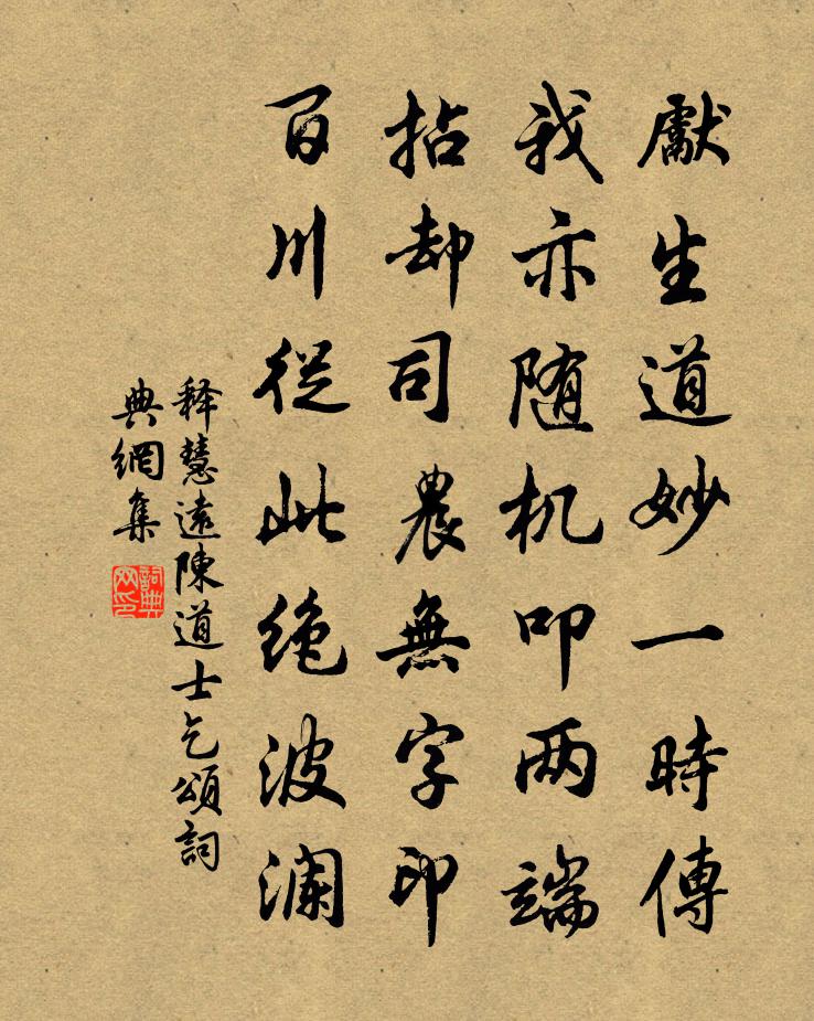 詩詞名句歷史字典書法欣賞書法字典國語詞典說文解字康熙字典古漢語字典標 題 作 者 詩 句 陳道士乞頌作者:釋慧遠 朝代:宋代陳道士乞頌原文先生道妙一時傳,我亦隨機叩兩端。拈卻司農無字印,百川從此絕波瀾。詩詞問答問:陳道士乞頌的作者是誰?答:釋慧遠問:陳道士乞頌寫於哪個朝代?答:宋代釋慧遠陳道士乞頌書法欣賞陳道士乞頌書法作品詩詞推薦寄福勝長老釋宗杲〔宋代〕真人十八界元空,三十一人同姓呂。分散游山各占山,三十一人又同處。寄呂巽伯換酒亭葉適〔宋代〕琅琊初址未完牢,猶倚虛名用我曹。自可全將醒前了,何因偏向醉中逃。艱危未肯當時共,誕逸空傳後代高。還有早行五首趙蕃〔宋代〕落月掛林高,溪行屢著篙。不令驚水宿,頻覺送雞號。此趨今成熟,吾生毋乃勞。何能永謝去,自學小舟操。題扇二首張耒〔宋代〕越衫羅薄逆新涼,扇剪青綃秋水光。花前一把羅敷手,直到花殘襟袖香。和子野郊居見寄仇遠〔宋代〕歸去來兮意趣長,幽居遠隔水雲鄉。花粘石風吟詩筆,風度溪房煮藥香。把酒有時思太白,下車何日見元方。雲萍晨起陸游〔宋代〕殘夢悠揚不復成,槍然已有百禽鳴。山童來報溪流長,幽事從今日日生。書齋十詠壓紙獅子劉子翬〔宋代〕鎮浮須假重,刻石作狻猊。偶以形模好,兒童競見知。偈八首釋慧遠〔宋代〕滴水冰生分外寒,凍雲環合鎖峰巒。根塵不昧心珠露,眨上眉毛子細看。贈郭承務蘆雁白玉蟾〔宋代〕畫士郭熙畫之冠,郭熙去後名未斷。其裔復有郭萬里,胸中丹青飽無限。為誰作此蘆雁圖,傑出南齊宇文煥。煙水春日雜興陸游〔宋代〕小甔有米可續炊,紙鳶竹馬看兒嬉。但得官清吏不橫,即是村中歌舞時。重陽山居司空圖〔唐代〕詩人自古恨難窮,暮節登臨且喜同。四望交親兵亂後,一川風物笛聲中。菊殘深處回幽蝶,陂動晴光下早鴻。明日迓泉守晚宿囊山黃公度〔宋代〕山木轉斜暉,秋風動客衣。露華侵坐冷,星宿傍檐稀。樓迥鐘聲隱,更長燭影微。年來倦奔走,早覺利名非。和陶淵明飲酒詩滕岑〔宋代〕秋風入我室,百蟲自相喧。中夜臥不周,起視河河偏。念我平生友,托體歸青山。遊魂往何方,千載不復還。人生牡丹程公許〔宋代〕春工殫巧恨花叢,晚見昭儀擅漢宮。可惜芳時天不借,三列雨歇五更風。次韻呂肖卿講學三首方回〔宋代〕忽復機鋒對,真堪底里傾。果能成伏老,時許喚殷兄。可惜茲逢晚,相期不計程。受恩凡兩世,焉敢恝無情。題束季博山園二十首西崦牟巘五〔宋代〕行行西崦西,螟色蒼然入。芸芸各歸根,我亦坐內息。征婦怨效張籍釋善珍〔宋代〕前年番兵來,郎戰淮河西。官軍來上功,不待郎書題。淮河在何許,妾身那得去。生死不相待,白骨應解語。天寒句陽枋〔宋代〕可奈紅法飛白羽,不容黃叟臥青山。雩祀樂章。雍和佚名〔唐代〕紺筵分彩,寶圖吐絢。風管晨凝,雲歌曉囀。肅事蘭羞,虔申桂奠。百穀斯登,萬箱攸薦。題義門胡氏華林書院阮思道〔宋代〕北闕重旌表,西齋盛討論。高陽旬爽里,通德鄭玄門。選勝開松院,憑幽敞竹軒。靈泉飛洞壑,花樹蔽郊原。露滴名句推薦日落波平。愁損辭鄉去國人。朱敦儒《採桑子·彭浪磯》 以此虧奪民衣食之財,仁者弗為也。墨子《墨子·32章 非樂(上)》 將在外,君命有所不受畢沅《續資治通鑑·元紀·元紀三十》 燕子飛時,綠水人家繞。蘇軾《蝶戀花·春景》 黃鶴一去不復返,白雲千載空悠悠。崔顥《黃鶴樓 / 登黃鶴樓》 凝恨對殘暉,憶君君不知。韋莊《菩薩蠻》 可與言而不與之言,失人;不可與言而與之言,失言。知者不失人亦不失言。孔子弟子《論語·衛靈公篇》 潭州官舍暮樓空,今古無端入望中。李商隱《潭州》 京國多年情盡改,忽聽春雨憶江南。虞集《聽雨》 但知江湖者,都是薄命人。佚名《增廣賢文·下集》