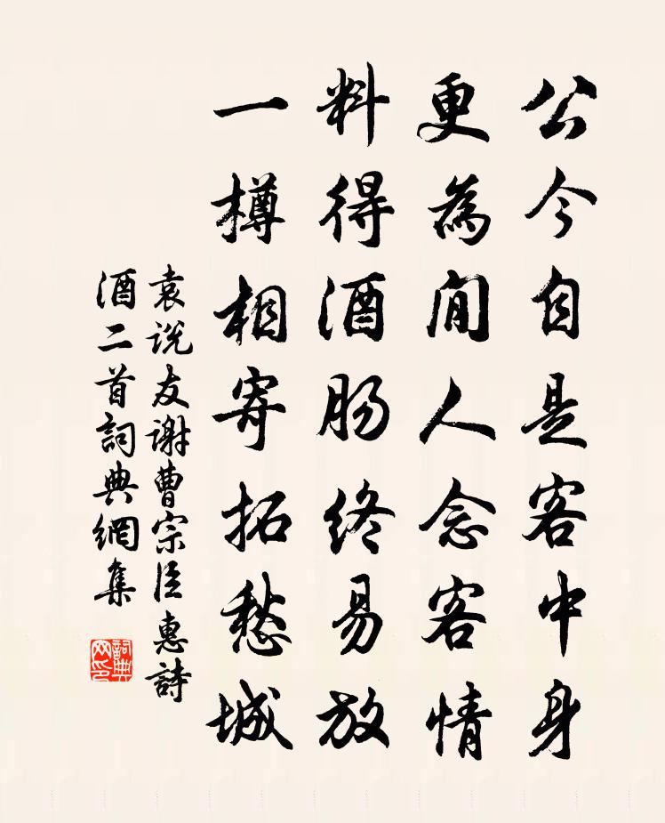 詩詞名句歷史字典書法欣賞書法字典國語詞典說文解字康熙字典古漢語字典標 題 作 者 詩 句 謝曹宗臣惠詩酒二首作者:袁說友 朝代:宋代謝曹宗臣惠詩酒二首原文公今自是客中身,更為閒人念客情。料得酒腸終易放,一樽相寄拓愁城。詩詞問答問:謝曹宗臣惠詩酒二首的作者是誰?答:袁說友問:謝曹宗臣惠詩酒二首寫於哪個朝代?答:宋代袁說友謝曹宗臣惠詩酒二首書法欣賞謝曹宗臣惠詩酒二首書法作品詩詞推薦讀峴山碑齊己〔唐代〕三載羊公政,千年峴首碑。何人更墮淚,此道亦殊時。兵火燒文缺,江雲觸蘚滋。那堪望黎庶,匝地是瘡痍。次韻李參政湖上雜詠錄寄龍鶴墳廬魏了翁〔宋代〕木落天宇空,野迥江水碧。誰歟驅四運,昨夕復今夕。君看瀛海內,壽考匪金石。贈僧玘長老陳郁〔宋代〕客單近掛屋東偏,細看家風似閬仙。為功月舡來茂苑,因披雲衲出潭田。詩篇熟誦如持咒,句法旁參若勘禪。既是宿野人家陸游〔宋代〕避雨來投白版扉,野人憐客不相違。林喧鳥雀棲初定,村近牛羊暮自歸。土釜暖湯先濯足,豆秸吹火旋烘衣。老來次韻六安魏明府三首陳舜俞〔宋代〕故人方信落江東,開解愁顏與病悰。自笑漫生湖海上,略無豪氣似元龍。白帝城最高樓杜甫〔唐代〕城尖徑昃旌旆愁,獨立縹緲之飛樓。峽坼雲霾龍虎臥,江清日抱黿鼉游。扶桑西枝對斷石,弱水東影隨長流。杖藜東韋曲野思唐彥謙〔唐代〕淡霧輕雲匝四垂,綠塘秋望獨顰眉。野蓮隨水無人見,寒鷺窺魚共影知。九陌要津勞目擊,五湖閒夢誘心期。孤燈送徐仲洪尉南安八首彭龜年〔宋代〕仲洪作尉南安縣,示我西園藥石辭。莫道近民民易擾,官清民近更相宜。重次臞軒韻二首劉克莊〔宋代〕憶昔抽毫白玉堂,奏篇字字谷年荒。內人久已呼才子,明主今方記寢郎。駑豆未應堪秣驥,鶉籠誰道可容皇。何當奉和聖制答張說扈從南出鼠雀谷之作王丘〔唐代〕襟帶三秦接,旂常萬乘過。陽原淑氣早,陰谷沍寒多。花縟前茅仗,霜嚴後殿戈。代雲開晉嶺,江雁入汾河。北土和二兄書事三首李廌〔宋代〕述逃內潰古雲多,楚塞群雄尚感歌。血饗彼猖神苟幸,廟謀非壯士誰何。將軍威信當詢眾,決勝神機豈謂他。試把次韻梅山弟醉吟七首陳著〔宋代〕蟁翼只為黃昏忙,鵠心自與青天長。世人皆失我獨得,春風浩浩詩書香。讀史陸游〔宋代〕蕭相守關成漢業,穆之一死宋班師。赫連拓跋非難取,天意從來未易知。寄南劍守陳寺丞宿王邁〔宋代〕復齋出守劍津時,正直清廉真吏師。遣愛昔嘗垂竹帛,徽音今又嗣塤篪。侯能培植基棠茇,我欲摩挲常萼碑。千載任叟書授劉生佚名〔唐代〕承欲往梁宋,梁宋災方重,旦夕為人訟。承欲訪鄭生,鄭生將有厄。即為千里客,兼亦變衫色。以採菊東籬下悠然見南山為韻賦十首方回〔宋代〕我詩無所師,意略與古同。篆士見之笑,寒苦啼秋蟲。採菊忽見山,不辨南與東。奇句忽天來,目斷孤征鴻。豈有侍香金童姬翼〔元代〕天壤之間,蕩蕩無拘束。一二襟期資野服。何處會心宜卜築。萬壑松風,一溪寒玉。炯茅堂、澹炷漫爐香味馥。聽次韻莫令因迓使者同泛舟至漂神已而誤焉問宿趙蕃〔宋代〕我割僅鉛刀,公銛比孟勞。莫酬談絕倒,難和句揮毫。既誤前驅遠,不妨乘興高。悠然風月底,脫略異官曹。秋辭江南黃滔〔唐代〕灞陵橋上路,難負一年期。積雨鴻來夜,重江客去時。勞生多故疾,漸老少新知。惆悵都堂內,無門雪滯遺。八月二十日天曉方回〔宋代〕清曉潮初過,西風獵弊裘。肯為貧士地,偏覺老人愁。蟋蟀聲彌急,梧桐色漸愁。殘星余幾點,吾獨倚吾樓。名句推薦鄉國真堪戀,光陰可合輕。白居易《洛橋寒食日作十韻》 日月忽其不淹兮,春與秋其代序。屈原《離騷》 蕭蕭落木不勝秋,莫回首、斜陽下。納蘭性德《一絡索·過盡遙山如畫》 歸志寧無五畝園,讀書本意在元元。陸游《讀書》 當年得意如芳草。日日春風好。辛棄疾《虞美人·賦虞美人草》 故人早晚上高台。贈我江南春色、一枝梅。舒亶《虞美人·寄公度》 東君也不愛惜,雪壓霜欺。晁沖之《漢宮春·梅》 奢則不孫,儉則固。與其不孫也,寧固。顏之推《顏氏家訓·治家篇》 其山水揀乳泉、石池漫流者上;其瀑涌湍漱,勿食之。陸羽《茶經·五之煮》 一朵江梅春帶雪。玉軟雲嬌,姑射肌膚潔。趙鼎《蝶戀花·一朵江梅春帶雪》