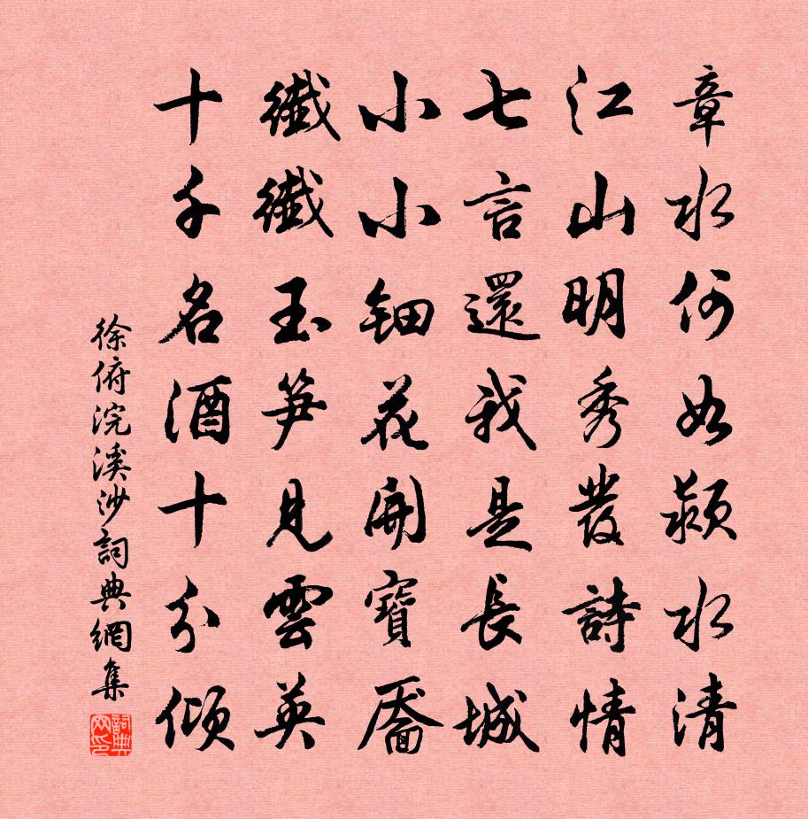 詩詞名句歷史字典書法欣賞書法字典國語詞典說文解字康熙字典古漢語字典標 題 作 者 詩 句 浣溪沙作者:徐俯 朝代:宋代浣溪沙原文章水何如潁水清。江山明秀髮詩情。七言還我是長城。小小鈿花開寶靨,纖纖玉筍見雲英。十千名酒十分傾。詩詞問答問:浣溪沙的作者是誰?答:徐俯問:浣溪沙寫於哪個朝代?答:宋代問:浣溪沙是什麼體裁?答:詞徐俯浣溪沙書法欣賞浣溪沙書法作品詩詞推薦初夏雜興陸游〔宋代〕老子今朝不用扶,雨涼百病一時蘇。扇題杜牧故園賦,屏對王維初雪圖。把釣溪頭蹋湍瀨,煎茶林下置風爐。箇中福先寺尋湛然寺主不見皇甫冉〔唐代〕寂然空佇立,往往報疏鍾。高館誰留客,東南二室峰。川原通霽色,田野變春容。惆悵層城暮,猶言歸路逢。月暈梅堯臣〔宋代〕月暈已知風,燈花先作喜。明日掛帆歸,春湖能幾里。送陳縣尉之太和新任姚勉〔宋代〕古來尉自號神仙,況是棲身快閣天。好向盤根施利器,如登熟路著先鞭。可知豈患無知己,自愛應能不愛錢。近世賀權郡雨應禱陳宓〔宋代〕衡山開霽雨迴風,正直心期自感通。頓使沾濡千里足,都由精白寸誠中。誰知憂國丹心在,不與農夫喜色同。四海得錢舍人書問眼疾白居易〔唐代〕春來眼暗少心情,點盡黃連尚未平。唯得君書勝得藥,開緘未讀眼先明。正月三日驟暖多稼亭前梅花盛開四首楊萬里〔宋代〕春被梅花抵死催,今年春向去年回。春回十日梅初覺,一夜商量一併開。沁園春(為老人書南堂壁)蔣捷〔宋代〕老子平生,辛勤幾年,始有此廬。也學那陶潛,籬栽些菊,依他杜甫,園種些蔬。除了雕梁,肯容紫燕,誰管門前春陰黃庭堅〔宋代〕竹筍初生黃犢角,蕨芽初長小兒拳。試尋野菜炊春飯,便是江南二月天。偈頌一百四十一首釋師範〔宋代〕萬木驚霜風,千林著秋色。堪笑寒山子,到處覓不得。木蘭花慢(追和晁次膺)王之道〔宋代〕對春光淡沲,煙冉冉、日遲遲。漸紅入桃溪,青回柳陌,鶯刷金衣。差池。競求友去,惱佳人、幽恨上蛾眉。應念宮詞十首張樞〔宋代〕燦錦堂西過夕陽,水風吹起芰荷香。內監催掃池邊地,準備官家納晚涼。西窗芭蕉陳宓〔宋代〕青羅千丈拶窗排,玉樹移從海底栽。夜半偏能延月住,暑深長是挹涼來。竹君似欠封侯骨,松老難當翰□□。□□寄張仲符時得烏石岡地二首裘萬頃〔宋代〕今人那似古人賢,一鍤隨身日醉眠。此老有靈應笑我,區區常費買山錢。梅枝圖唐寅〔明代〕東風吹動看梅期,簫鼓聯船發恐遲。斜日僧房怕歸去,還攜紅袖繞南枝。初築南齋蘇轍〔宋代〕我老不自量,築室盈百間。舊屋收半料,新材伐他山。盎中粟將盡,橐中金亦殫。涼風八月高,扶架起南邊。首成曲肱詩二十首白玉蟾〔宋代〕玉府官僚無甚人,上皇憐我最辛勤。忽然詔下催歸去,猿叫萬山空白雪。次韻楊宰公田道士陳造〔宋代〕人有騫裳去,時閒野渡舟。知君問雕瘵,隨處訪深幽。歲事方關念,村醪不破憂。貰租仍已責,或可繼前修。無夢令 繼重陽韻馬鈺〔元代〕不論趙州幾碗。更不盧仝請喚。禱告太原公,免了睡魔廝玩。明燦。明燦。得見長生道岸。答客詩鮑照〔南北朝〕幽居屬有念。含意未連詞。會客從外來。問君何所思。澄神自惆悵。嘿慮久回疑。謂賓少安席。方為子陳之。我以名句推薦過能改,歸於無。倘掩飾,增一辜。李毓秀《弟子規·信》 酌酒以自寬,舉杯斷絕歌路難。鮑照《擬行路難·其四》 回日樓台非甲帳,去時冠劍是丁年溫庭筠《蘇武廟》 年年躍馬長安市。客舍似家家似寄。劉克莊《玉樓春·戲林推》 挽弓當挽強,用箭當用長。杜甫《前出塞九首》 江燕話歸成曉別,水花紅減似春休。西風梧井葉先愁。吳文英《浣溪沙·秋情》 浮雲柳絮無根蒂,天地闊遠隨飛揚。韓愈《聽穎師彈琴》 醉後涼風起,吹人舞袖回。李白《與夏十二登岳陽樓》 寧做太平犬,莫做離亂人!佚名《增廣賢文·下集》 飛雪過江來,船在赤欄橋側。呂渭老《好事近·飛雪過江來》