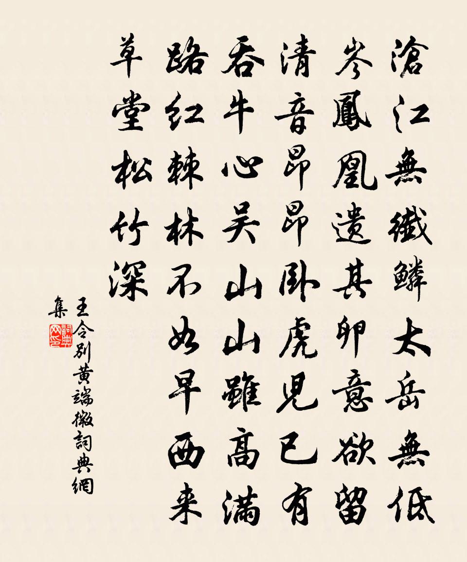 詩詞名句歷史字典書法欣賞書法字典國語詞典說文解字康熙字典古漢語字典標 題 作 者 詩 句 別黃端微作者:王令 朝代:宋代別黃端微原文滄江無纖鱗,太岳無低岑。鳳凰遺其卵,意欲留清音。昂昂臥虎兒,已有吞牛心。吳山山雖高,滿路紅棘林。不如早西來,草堂松竹深。詩詞問答問:別黃端微的作者是誰?答:王令問:別黃端微寫於哪個朝代?答:宋代王令別黃端微書法欣賞別黃端微書法作品詩詞推薦好事近王之望〔宋代〕彩艦載娉婷,宛在玉樓瓊宇。人慾御風仙去,覺衣裳飄舉。玉京咫尺是藍橋,一見已心許。夢解漢皋珠佩,但茫茫古意李新〔宋代〕野人孤鶴姿,與雲相伉儷。百禽相和鳴,了不關鶴意。彼美靚閨女,窺戶欣客貴。復有琴心挑,中夜駕車至。詞章送王恪郎中知襄州蘇轍〔宋代〕魏公德業冠當年,汝守威名竦漢邊。將相傳家俱未遠,子孫到處各推賢。風流最喜君真似,符竹連分政得專。峴首雜興效阮步兵王銍〔宋代〕松巔負殘雪,高映寒食輝。衝風忽飄墮,勢若從天飛。庭虛四散入,凌亂侵人衣。衣重不忍佛,恐與清景違。援琴慶資深康樂園四詠王之道〔宋代〕不知眼界幾多闊,隱隱青山在天末。湖光醉就琥珀濃,應助先生恣澆潑。西風搖落黃花秋,江城有蟹供拍浮。人如寄陝守祖擇之舍人邵雍〔宋代〕記得相逢否,當時在海東。別離千里外,倏忽十年中,跡異中尤異,心同齒更同。終期再清會,文酒樂無窮。和蘆洲劉子泉秋懷葛起耕〔宋代〕雨送秋歸雁帶霜,凝情無處寄詩狂。一庭莎草蛩吟老,萬里梅花鶴夢長。德誼可踰鐘鼎貴,聖賢不死簡編香。邇來八月十四夜對月方岳〔宋代〕澄空四無雲,明月如凝霜。岸巾南窗下,領略今夕涼。鴟夷渴生塵,風味不可忘。欲上排九關,箋此世故忙。百年寄令狐相公(一作赴長江道中)賈島〔唐代〕策杖馳山驛,逢人問梓州。長江那可到,行客替生愁。予出蜀日嘗遣僧則華乞簽於射洪陸使君祠使君陸游〔宋代〕少壯不自料,慷慨志四方。謝病還故山,始覺白日長。命薄類蟬翼,功名安可望?狐狸不足問,力不當財狼。惟有酬謝宣城朓詩沈約〔南北朝〕王喬飛鳧舄。東方金馬門。從宦非宦侶。避世不避諠。揆予發皇鑒。短翮屢飛翻。晨趨朝建禮。晚沐臥郊園。賓至次韻馬少伊木犀范成大〔宋代〕月窟飛來露已涼,斷無塵格惹蜂黃。纖纖綠裹排金粟,何處能容九里香?水尾山腰樹影蒼,一天風露不供香。誰家和皇甫判官游琅琊溪孟郊〔唐代〕山中琉璃境,物外琅琊溪。房廊逐岩壑,道路隨高低。碧瀨漱白石,翠煙含青蜺。客來暫游踐,意欲忘簪珪。樹杪皇后閣端午帖子詞宋庠〔宋代〕魏井開冰潔,齊宮獻服新。宮門無暑氣,猶許艾為人。自誨白居易〔唐代〕樂天樂天,來與汝言。汝宜拳拳,終身行焉。物有萬類,錮人如鎖。事有萬感,爇人如火。萬類遞來,鎖汝形骸。和鄧慎思未試即事難書率用秋日同文館為首句耿南仲〔宋代〕敗葉掃還飛,秋容肅粉闈。青錢如已選,白璧會須歸。燕坐書橫案,孤吟月滿衣。還同潘散騎,魚鳥性都違。金縷曲 慰西溟納蘭性德〔清代〕何事添淒咽?但由他、天公簸弄,莫教磨涅。失意每多如意少,終古幾人稱屈。須知道、福因才折。獨臥藜床看北次韻子瞻題泗州監倉東軒二首蘇轍〔宋代〕萬斛塵飛日為霾,無心退食自成齋。梅生紅粟初迎臘,魚躍銀刀正出淮。臥病空看帆度磧,誦詩猶記雪填階。夾河苞苴行鄭俠〔宋代〕苞苴來,苞苴去,封書裹信不得住。君不見箕山之下有仁人,室無杯器,以手的捧水,不願風瓢掛高樹。次答姚考成留別陳普〔宋代〕別後相逢各問年,依然緣發對華顛。間雲獨占半間住,伴客那無一榻眠。酒為愁多全欠力,詩因料少未成聯。卻憐名句推薦桂花香霧冷,梧葉西風影。高觀國《菩薩蠻·何須急管吹雲暝》 文人之筆,勸善懲惡也。王充《論衡·卷二十·佚文篇》 山從人面起,雲傍馬頭生。李白《送友人入蜀》 報導先生歸也,杏花春雨江南。虞集《風入松·寄柯敬仲》 自別後遙山隱隱,更那堪遠水粼粼。王實甫《十二月過堯民歌·別情》 北極朝廷終不改,西山寇盜莫相侵。杜甫《登樓》 列德而尚賢。雖在農與工肆之人,有能則舉之。墨子《墨子·08章 尚賢(上)》 書卷多情似故人,晨昏憂樂每相親。于謙《觀書》 君子以儉德辟難,不可榮以祿。佚名《易傳·象傳上·否》 登車宿遷北,萬頃鋪瓊田。陸文圭《宿遷道中遇雪》