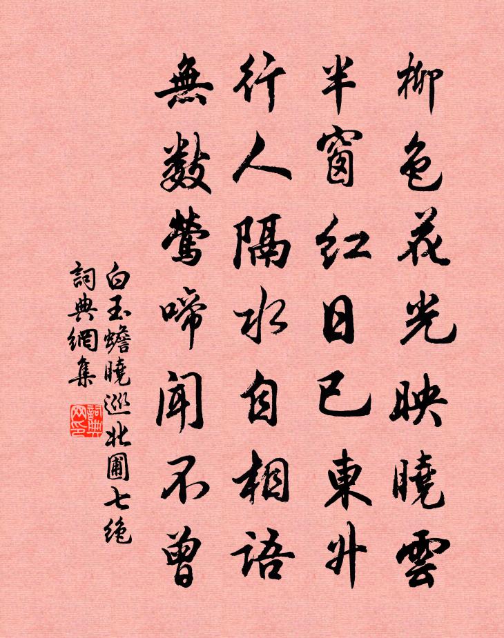 詩詞名句歷史字典書法欣賞書法字典國語詞典說文解字康熙字典古漢語字典標 題 作 者 詩 句 曉巡北圃七絕作者:白玉蟾 朝代:宋代曉巡北圃七絕原文柳色花光映曉雲,半窗紅日已東升。行人隔水自相語,無數鶯啼聞不曾。詩詞問答問:曉巡北圃七絕的作者是誰?答:白玉蟾問:曉巡北圃七絕寫於哪個朝代?答:宋代問:曉巡北圃七絕是什麼體裁?答:七絕白玉蟾曉巡北圃七絕書法欣賞曉巡北圃七絕書法作品詩詞推薦新澗亭白居易〔唐代〕煙蘿初合澗新開,閒上西亭日幾回。老病歸山應未得,且移泉石就身來。次韻袁起岩送示郡沼雙蓮圖范成大〔宋代〕珠淵玉水折方員,湧出雙蓮照酒邊。壓倒小湖 * 草,增光後沼兩重蓮。苕華名字元相併,桃葉根株本自連。好把俞公岩陳摶〔宋代〕萬事若在手,百年聊稱情。他時南嶽去,記得此岩名。西江月 重陽全真集卷九王哲〔元代〕堪嘆青霄碧漢。高空景致尤寬。今朝清爽有餘歡。拈出我家公案。方顯平生手段。騰身便入雲端。西江月里跨祥鸞瑞鷓鴣王哲〔元代〕春季裁量十四郎。風流玉貌好輕狂。每夜房中憐美婦,常時腹內痛飢腸。以此街前來背箱。利多撲入采帛行。刀尺春行南山訪友不遇趙必象〔宋代〕瘦筇支我上南山,才到山中分外閒。九十日春將解印,百年心事幾憑欄。燕營一壘雛相慶,鶴舞三台仙未還。松菊題清虛庵三首曹勛〔宋代〕清虛指出翠微旁,便涌流泉溉一方。更拜璇題作神力,源源千古出甘涼。寄洪州楊太博陳堯佐〔宋代〕南昌為郡好,樓閣沈江湄。地暖春生早,山寒日下遲。訟庭唯鶴立,吟樹獨僧期。安得通官政,煙霞共一司。喜入杉嶺李呂〔宋代〕行盡山嶺頭,歡喜入鄉關。憶昨冒雨去,寒澀亦多端。處登糧綱船,出入狗竇寬。水漲泊無岸,水落淺湊灘。直待郊祀慶成詩程珌〔宋代〕牙籤猶未進,玉冕已先須。峻級飛平步,端圭卻掖扶。祥光匝霄極,和氣滃天區。福飲煙升已,儐神靄瑞符。頌古一百二十一首釋宗杲〔宋代〕電光石火尚猶遲,猗死禪和那得知。轉面回頭擬尋討,夕陽已過綠櫸西。和錢適德循寓懷二首賀鑄〔宋代〕悠悠北山雲,苒苒東門草。紛吾起故居,與爾即遠道。巔崖博錙銖,得不償所耗。寄語鄰牆翁,歲晚從吾好。魯酒送范寺丞林逋〔宋代〕林中蕭寂款吾廬,亹亹猶欣接緒餘。去棹看當辨江樹,離尊聊為摘園蔬。馬卿才大常能賦,梅福官卑數上書。黼座占貯橘子葉簡〔宋代〕圓如珠,赤如丹,倘能擘破分喫了,爭不慚愧洞庭山。滿庭芳 戰公求問王哲〔元代〕逸志清虛,放心坦蕩,莫令煩冗縈牽。修身養性,隨分樂因緣。便是崇真奉道,甲丹內、長*靈煙。通閒趣,恬應英宗皇帝輓詞二首陳襄〔宋代〕玉幾言猶在,雲天去莫攀。久長期享國,咫尺忽違顏。信默歸元子,遺留暨百蠻。孤臣方仗節,無計哭橋山。辛卯除夜戴表元〔宋代〕臘月今年只今夕,春風明日是明年。狂歌把酒屠蘇地,醉眼看梅霧淞天。碧玉千壺喧坐次,紅牙六博斗飛錢。頭顧□書院劉仲堪〔宋代〕鑿石導行徑,刊木羅居室。微雲□總戶,青嵐照緗帙。潔士□□堵,志人輕尺璧。況近□山水,勉旃此游息。寄前黃州竇使君趙嘏〔唐代〕池上笙歌寂不聞,樓中愁殺碧虛雲。玉壺凝盡重重淚,寄與風流舊使君。池陽報恩寺新成輪藏應公出示鮑仲山詩因贈喻良能〔宋代〕招提雄冠浦邊州,寶藏琅函眩電眸。更出故人奇絕句,相看知是贊公流。名句推薦行善濟人,人遂得以安全,即在我亦為快意王永彬《圍爐夜話·第五一則》 在天願作比翼鳥,在地願為連理枝。白居易《長恨歌》 人生不可安閒,有恆業,才足收放心王永彬《圍爐夜話·第八三則》 閣中帝子今何在?檻外長江空自流。王勃《滕王閣序》 見人初解語嘔啞,不肯歸眠戀小車。韋莊《與小女》 誠有功,則雖疏賤必賞;誠有過,則雖近愛必誅。韓非及後人《韓非子·主道》 看來豈是尋常色,濃淡由他冰雪中。曹雪芹《詠紅梅花得“紅”字》 與肩挑貿易,毋占便宜;見貧苦親鄰,須加溫恤。朱柏廬《朱子家訓·全文》 輕衫未攬,猶將淚點偷藏史達祖《夜合花·柳鎖鶯魂》 東船西舫悄無言,唯見江心秋月白。白居易《琵琶行 / 琵琶引》