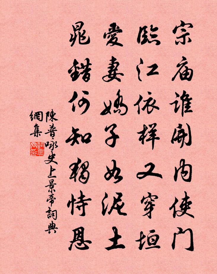 詩詞名句歷史字典書法欣賞書法字典國語詞典說文解字康熙字典古漢語字典標 題 作 者 詩 句 詠史上景帝作者:陳普 朝代:宋代詠史上景帝原文宗廟誰開內使門,臨江依樣又穿垣。愛妻嬌子如泥土,晁錯何知獨恃恩。詩詞問答問:詠史上景帝的作者是誰?答:陳普問:詠史上景帝寫於哪個朝代?答:宋代陳普詠史上景帝書法欣賞詠史上景帝書法作品詩詞推薦酬和元九東川路詩十二首。嘉陵夜有懷二首白居易〔唐代〕露濕牆花春意深,西廊月上半床陰。憐君獨臥無言語,惟我知君此夜心。不明不暗朧朧月,非暖非寒慢慢風。獨臥隨州聞劉易入終南山尹洙〔宋代〕神驥渴死追無蹤,離婁眩目迷虛空。九衢懽游尚故處,一日忽在終南峰。附勢趨權徒擾擾,生歌死哭何匆匆。人間送夫從軍楊氏婦〔宋代〕海壇門外浪滔天,妾上城樓君上船。回首西風深巷底,梅花霜月夜如年。奉和天樞成宴夷夏群僚應制李嶠〔唐代〕轍跡光西崦,勛庸紀北燕。何如萬方會,頌德九門前。灼灼臨黃道,迢迢入紫煙。仙盤正下露,高柱欲承天。山類送趙清臣宰姚江樓鑰〔宋代〕玉立君家好弟兄,藍田風采照花城。版輿壽母人間盛,千里何曾去送迎。題程氏麟嘉壽域方回〔宋代〕當年此地瑞麒麟,預卜佳城壽檟春。早把一官為長物,永期千歲作全人。盈消虛息知時命,戰履兢臨保性真。馬革上元高登〔宋代〕情感此宵元切恨,遣懷高唱一聲歌。清澄月滿鋪逵路,烜赫蓮開未綠荷。觥酒滯時追伴侶,袖香凝處想紈羅。更深病起書院偶成盛世忠〔宋代〕蓄水滋蘭畹,開窗近竹林。敗糊黃蟣閧,斷簡老蟲侵。酒尚欺人病,詩能對客吟。晨昏一飲足,此外不關心。余得石山二座西南道李監場索之附海船歸三山曾豐〔宋代〕圓嶠方壺共五山,上隨潮往下隨還。二山流落初何在,新喜歸吾几案間。吳府君輓詩魏了翁〔宋代〕篤信寧違俗,徐行不競時。與人交樂易,處世事平夷。甚矣古常者,傷哉今已而。龍山春夜月,長照鳳皇枝。無策戴復古〔宋代〕老覺登樓懶,心知涉世疏。夢蕉還得鹿,緣木可求魚。晚歲未聞道,平生欠讀書。行藏兩無策,究竟果何如。次韻范機宜感懷蘇籀〔宋代〕珪組紛紛蟻慕羶,徇人可否冀超遷。傷哉遠略疲中國,慟矣長星出互天。晉楚春秋書失國,惠昭徒馭竟言旋。朝廷夜吟釋贊寧〔宋代〕獨坐間吟野思清,秋庭蕭索暮煙輕。孤相欲灺月未上,萬籟寂然蛩一聲。送張秀才之長沙戎昱〔唐代〕君向長沙去,長沙仆舊諳。雖之桂嶺北,終是闕庭南。山靄生朝雨,江煙作夕嵐。松醪能醉客,慎勿滯湘潭。登越王樓即事牛徵〔唐代〕危樓送遠目,信美奈鄉情。轉岸孤舟疾,銜山落照明。蕭條看草色,惆悵認江聲。誰會登臨恨,從軍白髮生。舉子蘇泂〔宋代〕先親去無歸,家有十男子。春秋此堂上,拜起共祭祀。一貧乃青氈,書種幸未已。人言抱子晚,君已三十四。何時從叔將軍宅薔薇花開太府韋卿有題壁長句因以和作權德輿〔唐代〕環列從容蹀躞歸,光風駘蕩發紅薇。鶯藏密葉宜新霽,蹀繞低枝愛晚暉。艷色當軒迷舞袖,繁香滿徑拂朝衣。名卿別雲門高似孫〔宋代〕回首雲邊更看松,風流王謝舊行蹤。不知誰繼諸賢后,夜半來聽六寺鐘。剡源山房釋文珦〔宋代〕茅屋小於船,寒宵此會偏。苦吟因青得,幽思與閒便。斷壁棲雲氣,虛窗閉篆煙。帖殘重補畫,琴老不勝弦。畫軸金馬楊億〔宋代〕茂異紛綸集漢庭,求賢詔在竹書青。共趨金馬門前路,誰識東方是歲星。名句推薦一杯酒,問何似,身後名?辛棄疾《水調歌頭·壬子三山被召陳端仁給事飲餞席上作》 上有愁思婦,悲嘆有餘哀。曹植《明月上高樓》 牆外行人,牆裡佳人笑。蘇軾《蝶戀花·春景》 絕頂茅庵里,老衲正孤吟。納蘭性德《水調歌頭·題西山秋爽圖》 怪人不知理,知理不怪人。佚名《增廣賢文·下集》 冰合井泉月入閨,金缸青凝照悲啼。李白《夜坐吟》 憑誰問,廉頗老矣,尚能飯否?辛棄疾《永遇樂·京口北固亭懷古》 虎狼也有父子之情。馮夢龍《喻世明言·卷二十一》 晨起開門雪滿山,雪晴雲淡日光寒。鄭燮《山中雪後》 來時父母知隔生,重著衣裳如送死。王建《渡遼水》