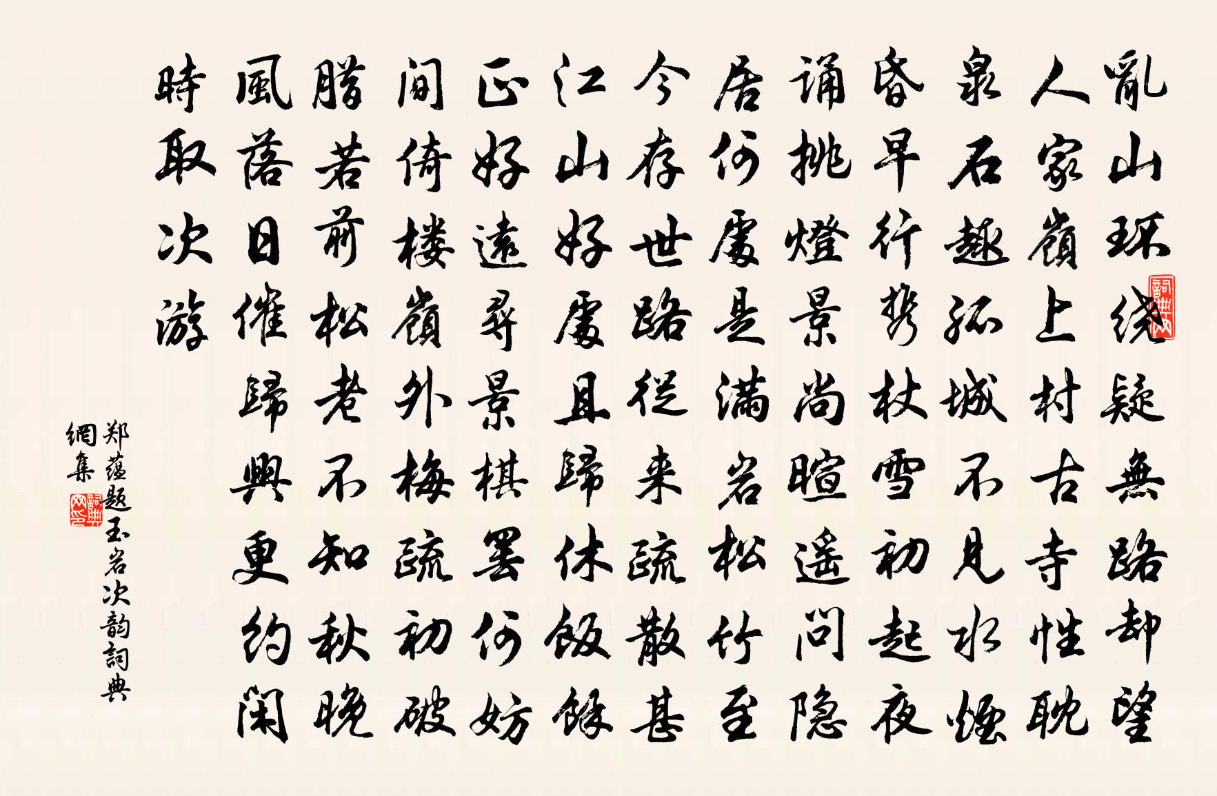 詩詞名句歷史字典書法欣賞書法字典國語詞典說文解字康熙字典古漢語字典標 題 作 者 詩 句 題玉岩次韻作者:鄭蘊 朝代:宋代題玉岩次韻原文亂山環繞疑無路,卻望人家嶺上村。古寺性耽泉石趣,孤城不見水煙昏。早行攜杖雪初起,夜誦挑燈景尚暄。遙問隱居何處是,滿岩松竹至今存。世路從來疏散甚,江山好處且歸休。飯餘正好遠尋景,棋罷何妨間倚樓。嶺外梅疏初破臘,若前松老不知秋。晚風落日催歸興,更約閒時取次游。詩詞問答問:題玉岩次韻的作者是誰?答:鄭蘊問:題玉岩次韻寫於哪個朝代?答:宋代鄭蘊題玉岩次韻書法欣賞題玉岩次韻書法作品詩詞推薦再和勸學韻鄭清之〔宋代〕仕學優於服田力,公儀之家廢葵織。詩書為府道德林,樂在藏修洎游息。濃薰班馬有餘香,暗摸曹劉豈難識。插架山居秋思周賀〔唐代〕一從雲水住,曾不下西岑。落木孤猿在,秋庭積霧深。泉流通井脈,蟲響出牆陰。夜靜溪聲徹,寒燈尚獨吟。鷓鴣天 客雄,為樂府王英賦張可久〔元代〕一點芳春近破瓜。生香小朵瑩無瑕。水曹梅萼初擎蕾,石土瓊苞未放花。眉刷翠,鬢堆鴉。淡妝何必尚鉛華。御溝沁園春(廖總乾席上)黃機〔宋代〕暑風清微,梅腮漸紅,麥須未黃。恨牡丹多病,醫治費巧,酴醿易老,點綴無方。客里光陰,愁中意緒,想美人兮頌古十一首釋有權〔宋代〕衣錦還鄉人盡見,長時富貴許誰知。無言童子呵呵笑,望得風光滿面歸。失題盧頻〔唐代〕春淚爛羅綺,泣聲抽恨多。莫滴芙蓉池,愁傷連蒂荷。一朵花葉飛,一枝花光彩。美人惜花心,但願春長在。減字木蘭花(好惡)沈瀛〔宋代〕瞻烏愛止。不是檐前聞鵲喜。上下鳴風。以類相從自感通。嫌茶愛酒。惡彼芝焚夸柏壽。說汝言何。一切人言口眾與腖禪人釋正覺〔宋代〕白苹風作江頭秋,青鳥夢隨沙水流。清興十分蓬上月,滿船載入蘆華洲。斯適意,去來休。六鰲合負歸來也,煙浪蓬萊閣秦觀〔宋代〕雄檐傑檻跨崢嶸,席上風雲指顧生。千里勝形歸俎豆,七州和氣入簫笙。人游晚岸朱樓遠,鳥度晴空碧嶂橫。今夜菩薩蠻·春風試手先梅蕊趙令畤〔宋代〕春風試手先梅蕊,頩姿冷艷明沙水。不客群芳知,端須月與期。清香閒自遠,先向釵頭見。雪後燕瑤池,人間第一次早再出虞儔〔宋代〕晨起候雞鳴,我車催發軔。列炬犯星微,衣襟濛霧潤。將迎恐後期,奔走追前進。拭面愧緇塵,墊巾憐雪鬢。吾年用餘子畏韻其詩有警句雲若知瓦礫真成道便覺陳藻〔宋代〕少長城闉老一村,平生好語不曾聞。百年馬鬣空埋我,三載鰲頭更祝君。幸有鄰僧分隙地,豈無座主識雄文。須臾和劉卿材十詠水鴨黃庶〔宋代〕憶在山中日,溪邊把釣鉤。相逢恐驚起,招手卻回舟。用厚後弟強甫韻劉克莊〔宋代〕老禪和築退居庵,識路何須待指南。野叟得年今九九,星翁布算更三三。有詩入夢撩靈運,無藁藏山愧史談。愚智冬晴行園中陸游〔宋代〕桔槔灌蔬固已非,竹筧澆花宜見譏。杏繁梅瘦種性別,一氣生殺均天機。細推物理孰不爾,摶風未可嘲卑飛。君其枕上聞櫓聲李流謙〔宋代〕勸君不須下瞿唐,順流從此道路長。勸君早上瞿唐去,溯流雖艱近家鄉。我今出蜀幾寒暑,催歸苦念家人語。更煩桂隱紀詠殊勝軒張鎡〔宋代〕杜老詩中佛,能言竹有香。欲知殊勝處,說著早清涼。和錢安道寄惠建茶蘇軾〔宋代〕我官於南今幾時,嘗盡溪茶與山茗。胸中似記故人面,口不能言心自省。為君細說我未暇,試評其略差可聽。建溪烏夜啼(夜坐)張鎡〔宋代〕月兒猶未全明。乞憐生。幾片彩雲來去、更風輕。應見我。行又坐。苦凝情。捲起簾兒不睡、到三更。行香子 李會首問道劉志淵〔元代〕大道無形。強立其名。判五氣融攝生成。貫通六合,總括群靈。本無情,亦無臭,又無聲。人悟勤行。造化無生。名句推薦側見雙翠鳥,巢在三珠樹張九齡《感遇十二首·其四》 我醉欲眠卿且去,明朝有意抱琴來。李白《山中與幽人對酌》 同為懶慢園林客,共對蕭條雨雪天。白居易《雪夜小飲贈夢得》 起舞徘徊風露下,今夕不知何夕。蘇軾《念奴嬌·中秋》 千嬌面、盈盈佇立,無言有淚,斷腸爭忍回顧。柳永《採蓮令·月華收》 性靈熔匠,文章奧府。淵哉鑠乎,群言之祖。劉勰《文心雕龍·宗經》 窮猿投林,豈暇擇木!房玄齡《晉書·列傳·第六十二章》 不在其位,不謀其政。孔子弟子《論語·泰伯篇》 君子以鐘鼓道志,以琴瑟樂心。荀子《荀子·樂論》 人行明鏡中,鳥度屏風裡。李白《清溪行 / 宣州清溪》