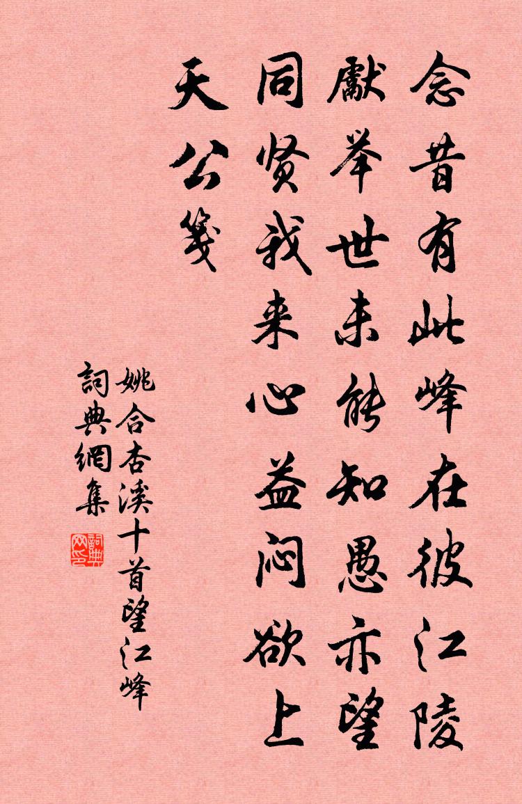 詩詞名句歷史字典書法欣賞書法字典國語詞典說文解字康熙字典古漢語字典標 題 作 者 詩 句 杏溪十首望江峰作者:姚合 朝代:唐代杏溪十首望江峰原文念昔有此峰,在彼江陵先。舉世未能知,愚亦望同賢。我來心益悶,欲上天公箋。詩詞問答問:杏溪十首望江峰的作者是誰?答:姚合問:杏溪十首望江峰寫於哪個朝代?答:唐代姚合杏溪十首望江峰書法欣賞杏溪十首望江峰書法作品注釋全唐詩:卷499-16詩詞推薦和吳侍郎龍門寶應寺設齋宋庠〔宋代〕闕塞千岩入畫圖,八關修供柅徵車。半斤運泰賢將用,不二門深疾始除。香缽淨羞熏寶席,法螺仙曲逗晴虛。從茲相和歌辭。銅雀妓李賀〔唐代〕佳人一壺酒,秋容滿千里。石馬臥新煙,憂來何所似?歌聲且潛弄,陵樹風自起。長裾壓高台,淚眼看花機。次韻黃貳車三絕句史彌寧〔宋代〕了卻文書可是痴,幅巾行散任風吹。揮毫颯颯詩驚雨,灑面蕭蕭雨送詩。題淮南惠照寺律師院貫休〔唐代〕儀冠凝寒玉,端居似沃州。學徒梧有鳳,律藏目無牛。茗滑香粘齒,鍾清雪滴樓。還須結西社,來往悉諸侯。楊柳枝方岳〔宋代〕晴日遊絲亂入簾,夕陽更添酒家簾。粥香飭白清明近,斗挽柔條插畫檐。題獨鹿圖方回〔宋代〕誰嘗失之,群起競逐。不見泰山,一得百覆。文王之囿,草羨泉足。生逢茲辰,呦呦攸伏。夏日書事寄丘亢處士姚合〔唐代〕暑天難可度,豈復更持觴。樹里鳴蟬咽,宮中午漏長。病夫心益躁,靜者室應涼。幾欲相尋去,紅塵滿路旁。睡起釋曇瑩〔宋代〕蕙帳煙凝晝掩關,落花時節雨闌珊。客來驚起還鄉夢,繞屋春風綠樹寒。述德上太原嚴尚書綬(一作王尚書,無綬字)鮑溶〔唐代〕帝命河嶽神,降靈翼軒轅。天王委管籥,開閉秦北門。頂戴日月光,口宣雨露言。甲馬不及汗,天驕自亡魂。清冢次韻周守二首張嵲〔宋代〕西川方用武,憂思惔如焚。秋興悲黃葉,閒情屬野雲。鳴鴻何日到,絡緯不堪聞。每憶盈尊酒,清談從使君。夢中作陸游〔宋代〕世事何由可控摶?故山歸臥有餘歡。澗泉見底藥根瘦,石室生雲丹灶寒。人遠忽聞清嘯起,山開頻得異書看。一朝瀼西亭即事鄧深〔宋代〕危亭曲檻俯溪流,去去來來渡口舟。微雨不妨人刈麥,輕煙正可客垂鉤。寄題徐郎中鄱陽高居望雲台蘇頌〔宋代〕子牟在江海,心存魏闕下。君居雖遠方,不忘朝廷者。築室負郊郭,虛堂連廣廈。浮梁江湖間,風物最蕭灑。官罷思歸引陸游〔宋代〕善泅不如穩乘舟,善騎不如謹持轡。妙於服食不如寡慾,工於揣摩不如省事。在天有命誰得逃,在我無求直差易。御覽所同顧君際檢書顧逢友〔宋代〕金鎖朱門次第開,萬簽黃冊絕塵埃。此中亦有先生稿,應是曾經御覽來。春晦送客(一作三月晦日郊外送客)雍裕之〔唐代〕野酌亂無巡,送君兼送春。明年春色至,莫作未歸人。流杯亭連文鳳〔宋代〕流杯亭下水無聲,滿地牛關野草腥。何事當時貪宴會,至今帝醉未能醒。至溫州文天祥〔宋代〕晏歲著腳來東甌,始覺坤軸東南浮。百川同歸無異脈,有如天子朝諸侯。何年飛落兩巨石,孤撐骯髒分江流。初疑句周邦彥〔宋代〕化行禹貢山川外,人在周公禮樂中。古風酬胡元之范成大〔宋代〕拂我膝上琴,當客清風襟。我琴無軫弦不和,願借之子調其音。美人一笑千黃金,彈作江岸花木深。下有同隊之游名句推薦天將暮,雪亂舞,半梅花半飄柳絮。馬致遠《壽陽曲·江天暮雪》 一年之計在於春,一日之計在於寅。佚名《增廣賢文·上集》 姑蘇城外寒山寺,夜半鐘聲到客船張繼《楓橋夜泊》 秋夜訪秋士,先聞水上音。袁枚《夜過借園見主人坐月下吹笛》 關西老將不勝愁,駐馬聽之雙淚流。王維《隴頭吟》 樹陰滿地日當午,夢覺流鶯時一聲。蘇舜欽《夏意》 鷦鷯尚存一枝,狡兔猶藏三窟羅貫中《三國演義·第六十回》 繁霜儘是心頭血,灑向千峰秋葉丹。戚繼光《望闕台》 大獵而後見善射,集議而後知能言宋濂、王褘《元史·列傳·卷五十》 望雲慚高鳥,臨水愧游魚。陶淵明《始作鎮軍參軍經曲阿作》