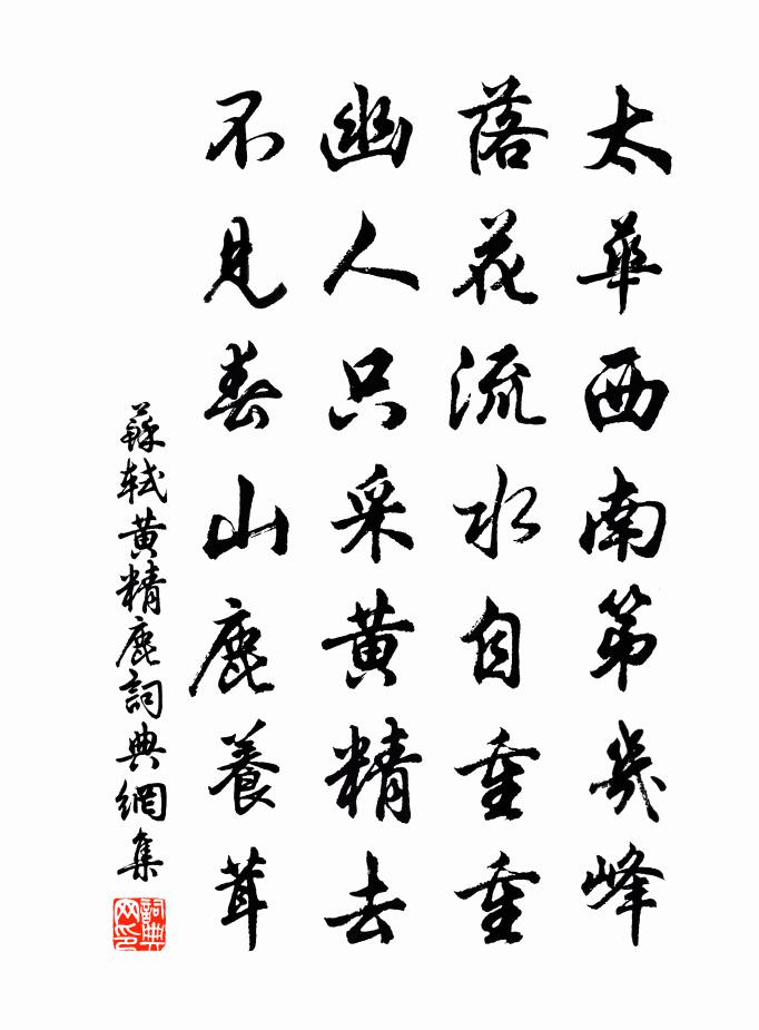 詩詞名句歷史字典書法欣賞書法字典國語詞典說文解字康熙字典古漢語字典標 題 作 者 詩 句 黃精鹿作者:蘇軾 朝代:宋代黃精鹿原文太華西南第幾峰,落花流水自重重。幽人只採黃精去,不見春山鹿養茸。詩詞問答問:黃精鹿的作者是誰?答:蘇軾問:黃精鹿寫於哪個朝代?答:宋代問:黃精鹿是什麼體裁?答:七絕問:蘇軾的名句有哪些?答:蘇軾名句大全蘇軾黃精鹿書法欣賞黃精鹿書法作品注釋蘇軾詩集 卷十七詩詞推薦同李五夕次香山精舍訪憲上人錢起〔唐代〕彼岸聞山鍾,仙舟過苕水。松門入幽映,石徑趨迤邐。初月開草堂,遠公方覯止。忘言在閒夜,凝念得微理。泠泠杜正獻與歐公書簡帖贊岳珂〔宋代〕厚德如祁公,黃鐘大鏞,和樂且雍。尊賢如六一,朱弦疏越,三漢廟瑟。道比志葉,不膠而漆。雇中外之雖異,猶減字木蘭花(仙呂調)柳永〔宋代〕花心柳眼。郎似遊絲常惹絆。慵困誰憐。繡線金針不喜穿。深房密宴。爭向好天多聚散。綠鎖窗前。幾日春愁廢管登樓顧非熊〔唐代〕登樓一南望,淮樹楚山連。見雁無書寄,歸吳定此年。懷舊第一百五文天祥〔宋代〕風塵淹白日,乾坤霾漲海。為我問故人,離別今誰在。白居易有望闕雲遮眼思鄉雨滴心之句用其韻為鄭剛中〔宋代〕西風催戶西,落葉動相思。柏香穿石鼎,孤起學遊絲。簾垂草亭靜,籬菊弄幽姿。萬物同一氣,榮悴只如斯。喔詩新安江舟中奉酬孫觀書記張伯玉〔宋代〕十年塞外憶江山,今日扁舟縱眼看。匝岸野花紅似簇,避人沙鳥起成團。放懷自古酒為得,老筆到今詩最難。君解看花回(和趙智夫韻)蔡伸〔宋代〕夜久涼生,庭院漏聲頻促。念昔勝游舊地,對畫閣層巒,雨餘煙簇。新詩暗藏小字,霜刀刊翠竹。攜素手、細繞回容州聞雁胡長卿〔宋代〕舊聞雁不到衡陽,今復南飛入瘴鄉。天闊隨陽皆可去,未應為界限瀟湘。古意崔國輔〔唐代〕紅荷楚水曲,彪炳爍晨霞。未得兩回摘,秋風吹卻花。時芳不待妾,玉佩無處夸。悔不盛年時,嫁與青樓家。又寄次前韻皮日休〔唐代〕病根冬養得,春到一時生。眼暗憐晨慘,心寒怯夜清。妻仍嫌酒癖,醫只禁詩情。應被高人笑,憂身不似名。送春廖行之〔宋代〕煮醖青梅且共嘗,游峰飛蝶為誰忙。鞦韆彩索迷青草,車馬紅橋銷綠楊。春事戰加蒲劍老,詩腸結盡柳絲長。韶光奉和聖制送張尚書巡邊王翰〔唐代〕紫綬尚書印,朱輧丞相車。登朝身許國,出閫將辭家。不憚炎蒸苦,親嘗走集賒。選徒軍有政,誓卒爾無嘩。帝樂別周軍事白居易〔唐代〕主人頭白官仍冷,去後憐君是底人?視謁會稽元相去,不妨相見卻殷勤。贈凌山人二首劉宰〔宋代〕星冠鶴氅賸威儀,新納官錢得歸。慚愧三茅老兄弟,一生木石草為衣。呈湖州趙再可舍人二首張嵲〔宋代〕五雲螭陛舊仙翁,來往琉璃一色宮。未到行人已能說,使君清與霅溪同。次韻張子喬來見陳著〔宋代〕人生自多事,本是一蘧廬。忽忽夢柯外,累累炊劍余。清吟投病枕,細讀當醫書。此去更何日,相過話索居。浣溪沙 至元九年秋九月,登秋風亭觀雨,賦王惲〔元代〕雨勢蒼山共一雲。雨聲作氣張三軍。秋風亭下葉繽紛。官事何憂嚴限促,天心不負老農勤。夜窗孤客儘先聞。送錢子入京李頎〔唐代〕夜夢還京北,鄉心恨搗衣。朝逢入秦使,走馬喚君歸。驛路清霜下,關門黃葉稀。還家應信宿,看子速如飛。和康節三詩晨起劉黻〔宋代〕一日事在寅,晨興宜自今。天澄萬古氣,人醒半生心。殘月留僧閣,寒煙度石林。營營何所得,白髮易相尋。名句推薦相思本是無憑語,莫向花箋費淚行。晏幾道《鷓鴣天·醉拍春衫惜舊香》 清水出芙蓉,天然去雕飾。李白《經亂離後天恩流夜郎憶舊遊書懷贈江夏韋太守良宰》 客從遠方來,遺我雙鯉魚。佚名《飲馬長城窟行》 東風動百物,草木盡欲言。李白《長歌行》 何期小會幽歡,變作離情別緒。柳永《晝夜樂·洞房記得初相遇》 亂點碎紅山杏發,平鋪新綠水蘋生。白居易《南湖早春》 夜吟敲落霜紅,船傍楓橋系。吳文英《荔枝香近·送人游南徐》 入苑白泱泱,宮人正靨黃。李賀《同沈駙馬賦得御溝水》 帝王之道,以寬仁為大。令狐德棻《周書·本紀·卷四》 冰,水為之,而寒於水。荀子《勸學》