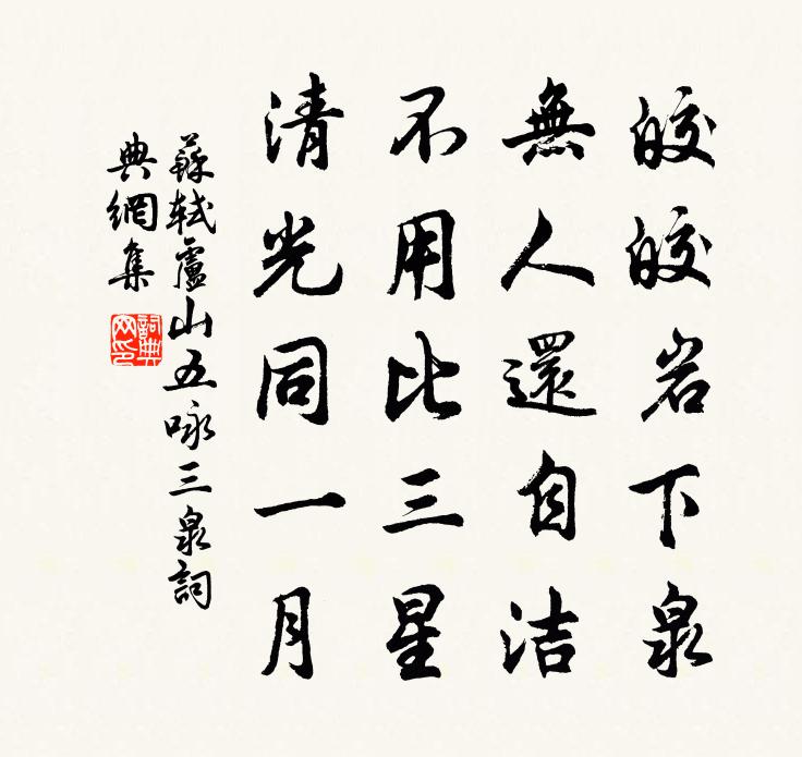 詩詞名句歷史字典書法欣賞書法字典國語詞典說文解字康熙字典古漢語字典標 題 作 者 詩 句 盧山五詠 三泉作者:蘇軾 朝代:宋代盧山五詠 三泉原文皎皎岩下泉,無人還自潔。不用比三星,清光同一月。詩詞問答問:盧山五詠 三泉的作者是誰?答:蘇軾問:盧山五詠 三泉寫於哪個朝代?答:宋代問:蘇軾的名句有哪些?答:蘇軾名句大全蘇軾盧山五詠 三泉書法欣賞盧山五詠 三泉書法作品注釋蘇軾詩集 卷六詩詞推薦霜天曉角高觀國〔宋代〕春雲粉色。春水和雲濕。試問西湖楊柳,東風外、幾絲碧。望極。連翠陌。蘭橈雙槳急。欲訪莫愁何處,旗亭在、減字木蘭花(薛肇明同二侍姬至葛山觀梅,薛公會作)葛勝仲〔宋代〕葛山仙隱。尚有餘膏留舊鼎。十里梅花。夾道爭看袞繡華。人間妙麗。並侍黃扉開國貴。僻壤孤芳。羞澀尊前不敢女色無定美贈卿材李覯〔宋代〕女色無定美,寵至美則多。士才無定稱,用顯稱已過。長字小家子,粲粲秋池荷。性慧不覺恥,母憐不加訶。出戶喜公擇之歸兼懷子崧三首趙蕃〔宋代〕子去吾誰與,諸孫共此悲。幾經行役苦,還讀寄來詩。事要規摹立,寧憂寒餓為。安知造物意,於爾不吾私。秋懷元好問〔金代〕涼葉蕭蕭散雨生,虛堂淅淅掩霜清。黃華自與西風約,白髮先從遠客生。吟似候蟲秋更苦,夢和寒鵲夜頻驚。何時長相思令·煙霏霏吳淑姬〔宋代〕煙霏霏,雪霏霏。雪向梅花枝上堆,春從何處回?醉眼開,睡眼開,疏影橫斜安在哉?從教塞管催。攤破浣溪沙趙雍〔元代〕春草萋萋綠漸濃。梨花落盡晚來風。試問相逢何處好,小樓東。朱箔影移無限恨,玉簫聲轉曲將終。獨倚闌乾誰是鏡湖有鳥名水鳧於春夏間若日打麥作飯偶有所陸游〔宋代〕人生天地中,賦予各有限。所享過所賦,鮮不貽後患。玉食害而家,此語禹所難。麥飯勿謂薄,耕時泥及骭。土塯河橋春別司馬光〔宋代〕河橋春盡送君歸,又惜無歡度此時。亂花滿眼遮人望,不見行塵空酒旗。沁園春(中秋約僚佐觀擊圓,登懷遠,用前韻)李曾伯〔宋代〕喚麴生來,與常娥約,從太守游。把玉簫聲寄,蕭關短笛,霓裳曲換,清塞重裘。桂影飄搖,桐陰立盡,多少征人水龍吟 西閣丘處機〔元代〕鳳鳴南邑清佳,大仙降跡行鸞地。琳宮寶*,星壇月館,槐陰竹翠。煙蓋雲幢,影搖寒殿,往來呈瑞。向虛亭東望瑤池燕蘇軾〔宋代〕飛花成陣。春心困。寸寸。別腸多少愁悶。無人問。偷啼自搵。殘妝粉。抱瑤琴、尋出新韻。玉纖趁。南風來解幽送疊山先生北行張子惠〔宋代〕打硬修行三十年,如今訂驗是儒仙。人皆屈膝甘為下,公獨高聲罵向前。此去好憑三寸舌,再來不值一文錢。到頭方寺丞除雲台觀劉克莊〔宋代〕河嶽腥膻憤朱忘,羨公遙領舊靈光。草荒太白騎驢跡,雲冷希夷委蛻裳。定有遺民來獻土,可無散吏去焚香。吾聞吳大帝廟楊備〔宋代〕古木陰森廟巋然,龍蟠虎踞舊山川。當時鼎足一場夢,空里旋風飛紙錢。雜曲歌辭。濮陽女佚名〔唐代〕雁來書不至,月照獨眠房。賤妾多愁思,不堪秋夜長。次周開祖游鶴林韻吳則禮〔宋代〕消渴茂陵端倦遊,穿雲踏石良未休。諸天辦供林谷曉,一寺鳴鐘江海秋。吾曹大是許詢輩,道人豈非支遁流。莫因偈三首釋慧方〔宋代〕臨老方稱住持,全無些子玄機。開口十字九乖,問東便乃答西。如斯出世,討甚玄微。有時拈三放兩,有時就令而出遊郊外七絕王炎〔宋代〕孤煙近見數椽屋,急水時行獨木橋。入眼異鄉風景別,修眉一抹暮山遙。頌古十二首釋智深〔宋代〕興化逐克賓,觀音戴鬼面。靴里動指頭,未免傍人見。名句推薦池上憑闌愁無侶。奈此個、單棲情緒。柳永《甘草子·秋暮》 來歲長安春事早,勸杏花、斷莫相思死。龔自珍《金縷曲·癸酉秋出都述懷有賦》 盡無言、閒品秦箏,淚滿參差雁呂渭老《薄倖·青樓春晚》 蚤是傷春夢雨天,可堪芳草更芊芊。韋莊《長安清明》 君子之所貴者,遷善懼其不及,改惡恐其有餘。徐幹《中論·上卷·虛道》 曾把梨花,寂寞淚闌乾朱淑真《江城子·賞春》 臨砌影,寒香亂、凍梅藏韻。吳文英《花犯·郭希道送水仙索賦》 非信無以使民,非民無以守國。司馬光《資治通鑑·周紀·周紀二》 華表月明歸夜鶴,嘆當時、花竹今如此吳文英《金縷歌·陪履齋先生滄浪看梅》 落花人獨立,微雨燕雙飛。晏幾道《臨江仙·夢後樓台高鎖》