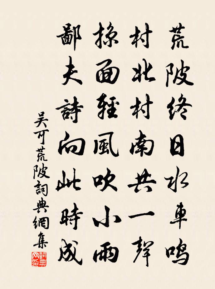 詩詞名句歷史字典書法欣賞書法字典國語詞典說文解字康熙字典古漢語字典標 題 作 者 詩 句 荒陂作者:吳可 朝代:宋代荒陂原文荒陂終日水車鳴,村北村南共一聲。掠面輕風吹小雨,鄙夫詩向此時成。詩詞問答問:荒陂的作者是誰?答:吳可問:荒陂寫於哪個朝代?答:宋代吳可荒陂書法欣賞荒陂書法作品詩詞推薦三月三日雨作遣悶十絕句楊萬里〔宋代〕歸得茅齋松竹邊,看風看雨亦欣然。空檐知與階何故,須把青苔滴似穿。冬夜書懷王維〔唐代〕冬宵寒且永。夜漏宮中發。草白靄繁霜。木衰澄清月。麗服映頹顏。朱燈照華發。漢家方尚少。顧影慚朝謁。雨復作陸游〔宋代〕今日雲歸恰喜晴,小池忽見水紋生。窗昏又輟讎書課,臥聽蕭蕭打葉聲。病中夜讀朱博士詩蘇軾〔宋代〕病眼亂燈火,細書數塵沙。君詩如秋露,淨我空中花。古語多妙寄,可識不可夸。巧笑在瓶頰,哀音如摻撾。曾坑南歌子李太古〔宋代〕月下秦淮海,花前晏小山。二仙仙去幾時還。留得月魂花魄、在人間。河漢流旌節,天風裊珮環。滿空香霧濕雲鬟高南仲自雲間歸退軒蓋明府以四詩送之末章專孫應時〔宋代〕清鏡朝容減,寒燈夜影孤。身曾諳作客,情亦念攜孥。寶劍千金重,晴虹萬丈舒。功名生感慨,有路莫辭迂。和僉事夾谷之寄韻方逢辰〔宋代〕夫子說周易,肇開太極分。及乎作春秋,下逮西狩麟。混辟至決裂,堅冰致習馴。三皇何皞皞,五帝何紛紛。卓哉送楊廷芳三首張栻〔宋代〕平生風雨夕,每念名節難。窮冬百草歇,手自種琅玕。吾子三十策,字字起三嘆。豈欲求人知,正自一心丹。請喔偈頌一百二十三首釋祖欽〔宋代〕插一莖草建梵剎,捏雙空手豎僧堂。古今相去知多少,七尺單前自較量。採桑子 五月六日朱彝尊〔清代〕攜來九子同心粽,蒲酒猶深。夜帳輕容,續命絲長針再縫。須知後會渾無據,難道相逢。十二巫峰,峽雨輕回第四攤破浣溪沙(湯詞)周紫芝〔宋代〕門外青驄月下嘶。映階籠燭畫簾垂。一曲陽關聲欲盡,不多時。鳳餅未殘雲腳乳,水沈催注玉花瓷。忍看捧甌春筍題西四明趙氏書院陳著〔宋代〕他鄉久客不堪懷,風雨書窗又獨來。夢惡喜聞鶯喚醒,歸途羞見雁聲回。望春山色今須好,年少時光老易催。坎止奉和御製讀後周書夏竦〔宋代〕遷哲承華緒,深謀事戰征。艱危思大節,慷慨得群情。惠愛均戎旅,威名震敵城。江陵摧寇勢,宵遁賴奇兵。大中祥符封禪十首真宗〔宋代〕祗若封祀,神宗配天。禮樂明備,奠獻精虔。景靈來格,休祥藹然。於昭垂慶,億萬斯年。皇太妃閣五首蘇軾〔宋代〕良辰樂事古難同,繡繭朱絲奉兩宮。仁孝自應禳百沴,艾人桃印本無功。與樂天同葬杓直元稹〔唐代〕元伯來相葬,山濤誓撫孤。不知他日事,兼得似君無。姑蘇泛月一首王阮〔宋代〕夜來誰共泛靈槎,飛上牽牛織女家。但覺滿身天雨露,絕無一點世塵沙。秋將寒玉清風陣,月借鎔銀潑浪花。投曉書懷絕句陸游〔宋代〕不到天台三十年,草庵猶記宿雲邊。老僧曉出松門去,手挈軍持取澗泉。次鄒希賢買魚不得三首衍為漁翁問答六詩漁姚勉〔宋代〕游魚驚餌總沉淵,一任攜竿晚立船。今世有錢人總愛,漁翁豈獨不貪錢。清溪江令公宅羅隱〔唐代〕蠻箋象管夜深時,曾賦陳宮第一詩。宴罷風流人不見,廢來蹤跡草應知。鶯憐勝事啼空巷,蝶戀餘香舞好枝。還有名句推薦凡兵之道四:曰陣,曰勢,曰變,曰權。察此四者,所以破強敵,取猛將也。孫臏《孫臏兵法·勢備》 大鵬飛兮振八裔,中天摧兮力不濟。李白《臨路歌》 遺民忍死望恢復,幾處今宵垂淚痕。陸游《關山月》 黃河曲里沙為岸,白馬津邊柳向城。高適《夜別韋司士》 戎馬關山北,憑軒涕泗流。杜甫《登岳陽樓》 蔡女菱歌移錦纜,燕姬春望上瓊鉤。上官儀《詠畫障》 來如春夢幾多時?去似朝雲無覓處。白居易《花非花》 春透水波明,寒峭花枝瘦。秦湛《卜運算元·春情》 無情明月,有情歸夢,同到幽閨。劉基《眼兒媚·秋思》 燕子不來花又老,一春瘦的腰兒小。施耐庵《蝶戀花·一別家山音信杳》