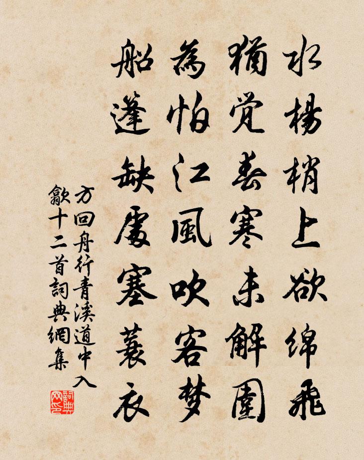 詩詞名句歷史字典書法欣賞書法字典國語詞典說文解字康熙字典古漢語字典標 題 作 者 詩 句 舟行青溪道中入歙十二首作者:方回 朝代:宋代舟行青溪道中入歙十二首原文水楊梢上欲綿飛,猶覺春寒未解圍。為怕江風吹客夢,船篷缺處塞蓑衣。詩詞問答問:舟行青溪道中入歙十二首的作者是誰?答:方回問:舟行青溪道中入歙十二首寫於哪個朝代?答:宋代方回舟行青溪道中入歙十二首書法欣賞舟行青溪道中入歙十二首書法作品詩詞推薦河復(並敘)蘇軾〔宋代〕熙寧十年秋,河決澶淵,注鉅野,入淮泗。自澶、魏以北皆絕流,而濟、楚大被其害,彭門城下水二丈八尺,七十句吳覺〔宋代〕燕頷英姿宜食肉,羊腸險韻宜剪茶。再用韻汪莘〔宋代〕接得南枝即按杯,似和霜月帶將來。自從驛使相逢後,千載無人解寄梅。江心長句葛紹體〔宋代〕問津城西市,呼渡江南岸。棹穩當潮生,帆輕趁風便。龍翔古招提,鳥革今輪奐。回合列翠屏,周遭鋪素練。邀行留別賈閣老胡寅〔宋代〕熙朝侍從老堂堂,和氣如春與物昌。未見峨冠真楚越,思逢傾蓋在瀟湘。放懷繾綣情何厚,憂世艱難話更長。果有題陽關圖二首黃庭堅〔宋代〕人事好乖當語離,龍眠貌出斷腸詩。渭城柳色關何事,自是離人作許悲。夜登千峰榭陸游〔宋代〕夷甫諸人骨作塵,至今黃屋尚東巡。度兵大峴非無策,收泣新亭要有人。薄釀不澆胸壘塊,壯圖空負膽輪囷。危樓重傷小女子白居易〔唐代〕學人言語憑床行,嫩似花房脆似瓊。才知恩愛迎三歲,未辨東西過一生。汝異下殤應殺禮,吾非上聖詎忘情。傷心醉別盧頭陀元稹〔唐代〕醉迷狂象別吾師,夢覺觀空始自悲。盡日笙歌人散後,滿江風雨獨醒時。心超幾地行無處,雲到何天住有期。頓見十三晨起雪晴前言果驗用定王台韻賦詩林用中〔宋代〕今朝風日好,抱病起登台。山色愁無盡,江波去不回。客懷無老草,節物又疏梅。且莫催歸騎,憑欄理一杯。水調歌頭(次韻別張夢卿)袁去華〔宋代〕一葉墮金井,秋色滿蟾宮。嬋娟影里,玉簫吹斷碧芙蓉。繚繞宮牆千雉,森聳觚稜雙闕,縹緲五雲中。鬱鬱蔥蔥處曉乘大霧訪仲固胡寅〔宋代〕稚金不耐老火鑄,有烈秋陽尚驕倨。汗流亭午憶淒風,氣應佳辰欣白露。朝來開窗迷眼界,霧色無邊莽回互。誰為幽居書事陸游〔宋代〕老人初起厭囂喧,塵幾從教鼠跡存。赤腳平頭俱遣去,倚牆危坐咽朝暾。折桂令盧摯〔元代〕想人生七十猶稀,百歲光陰,先過了三十。七十年間,十歲頑童,十載狂嬴。五十年除兮晝黑,剛兮得一半兒白日大衍易吟四十首方回〔宋代〕午月至子復,書雲七日來。六日七分說,觀天何隘哉。句朱浚〔宋代〕西風落葉長安夢,晚節寒華老圃心。巴南舟中夜市岑參〔唐代〕渡口欲黃昏,歸人爭流喧。近鍾清野寺,遠火點江村。見雁思鄉信,聞猿積淚痕。孤舟萬里外,秋月不堪論。和蕭蔘議游嶽麓八絕王炎〔宋代〕逐客當年出帝鄉,不容蹤跡到黃堂。蒼崖屐齒今安在,公獨懷思未忍忘。資陽郡中詠懷羊士諤〔唐代〕腰章非達士,閉閣是潛夫。匣劍寧求試,籠禽但自拘。江清牛渚鎮,酒熟步兵廚。唯此前賢意,風流似不孤。菩薩蠻·玉纖彈處真珠落溫庭筠〔唐代〕玉纖彈處真珠落,流多暗濕鉛華薄。春露浥朝華,秋波浸晚霞。風流心上物,本為風流出。看取薄情人,羅衣無此名句推薦淇園春竹美,軍宴日椎牛。司馬光《送龔章判官之衛州·新及第》 命將征西極,橫行陰山側。李白《塞上曲》 庫無備兵,雖有義,不能征無義。墨子《墨子·05章 七患》 蘭溪三日桃花雨,半夜鯉魚來上灘。戴叔倫《蘭溪棹歌》 立身之道何窮,只得一敬字,便事事皆整。王永彬《圍爐夜話·第一六三則》 不用訴離觴,痛飲從來別有腸。蘇軾《南鄉子·和楊元素時移守密州》 輕陰池館水平橋,一番弄雨花梢。陳子龍《畫堂春·雨中杏花》 情共天涯秋黯,朱橋鎖深巷。吳文英《解蹀躞·醉雲又兼醒雨》 至道深微,惟人是弘李大師、李延壽《南史·本紀·卷四》 春山暖日和風,闌乾樓閣簾櫳,楊柳鞦韆院中。白樸《天淨沙·春》