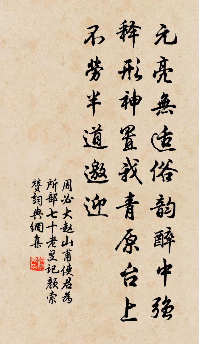 詩詞名句歷史字典書法欣賞書法字典國語詞典說文解字康熙字典古漢語字典標 題 作 者 詩 句 趙山甫使君為所部七十老叟記顏索贊作者:周必大 朝代:宋代原文元亮無適俗韻,醉中強釋形神。置我青原台上,不勞半道邀迎。詩詞問答問:《趙山甫使君為所部七十老叟記顏索贊》的作者是誰?答:周必大問:該詩寫於哪個朝代?答:宋代書法欣賞趙山甫使君為所部七十老叟記顏索贊書法作品詩詞推薦和陶淵明飲酒二十首方回〔宋代〕羊車一失馭,天地兵甲喧。中國不自正,王業東南偏。運甓有貽厥,臥龍康廬山。使處王謝位,大物豈不還。曉從任大夫祖行過石橋寄粹甫黃庭堅〔宋代〕令尹鳴騶過石橋,想君寒夢正飄搖。追思轉覺年來劇,亂似春風柳萬條。漁家傲(彭門道中早起)程垓〔宋代〕野店無人霜似水。清燈照影寒侵被。門外行人催客起。因個事。老來方有思家淚。寄問梅花開也未。愛花只有歸來送玉海宗師還茅山褚伯秀〔宋代〕湖澥天教十載閒,玉經功就勝居壇。驚塵天目妨龍臥,晚歲華陽望鶴還。入詠五噫丹闕近,會心三笑畫溪寒。世緣寒食清明十首劉克莊〔宋代〕輕薄墜鞭子,清狂謁水生。如何唐老杜,也作麗入行。芙蓉池作曹丕〔魏晉〕乘輦夜行游,逍遙步西園。雙渠相溉灌,嘉木繞通川。卑枝拂羽蓋,修條摩蒼天。驚風扶輪轂,飛鳥翔我前。丹霞春晝李賀〔唐代〕朱城報春更漏轉,光風催蘭吹小殿。草細堪梳,柳長如線。卷衣秦帝,掃粉趙燕。日含畫幕,蜂上羅薦。平陽花塢答二郭詩 其三嵇康〔兩漢〕詳觀凌世務。屯險多憂虞。施報更相市。大道匿不舒。夷路值枳棘。安步將焉如。權智相傾奪。名位不可居。鸞鳳朝中措李呂〔宋代〕展屏山色翠連空。瀟灑冠閩中。背郭元無塵事,披襟時有清風。君侯雅致,臨流句麗,愛月情鍾。樂府直追歐老,句諶祜〔宋代〕晉墅風流棋局散,江東柱石酒壺傾。十絕句呈章茂深安撫陳造〔宋代〕追尋名勝剩留年,白首猶參五字禪。寄語蜚廉亟回馭,擬凌風去訪詩仙。游悟貞寺回山下別張殷衡白居易〔唐代〕世緣未了治不得,孤負青山心共知。愁君又入都門去,即是紅塵滿眼時。禪人並化主寫真求贊釋正覺〔宋代〕一相無相,虛空等量。一身多身,物像俱春。動也出岫之雲,靜也居谷之神。現形說法也,剎剎塵塵。錢園小隱衛宗武〔宋代〕林園依岸曲,小隱是誰家。畫閣虛臨水,綠先深護花。晴川流皓月,落景襯明霞。幻境無多地,幽情未易涯。避地白岩山中書懷吳說〔宋代〕胡虜憑陵甚,長驅青海邊。攜家遭困頓,憂國憤迍邅。不省歲月換,徒驚花草鮮。到頭蘇息否,灑淚問蒼天。宿簡寂觀白居易〔唐代〕岩白雲尚屯,林紅葉初隕。秋光引閒步,不知身遠近。夕投靈洞宿,臥覺塵機泯。名利心既忘,市朝夢亦盡。暫來贈鑒上人(一作贈別筌公)皇甫曾〔唐代〕律儀傳教誘,僧臘老煙霄。樹色依禪誦,泉聲入寂寥。寶龕經末劫,畫壁見南朝。深竹風開合,寒潭月動搖。息心畫楊妃扇李軏〔宋代〕頗憶前身是謫仙,硯煩親捧玉堂前。如今再閱嬋娟面,不覺人間五百年。漁隱為周仲明賦黃庚〔宋代〕一笠戴春雨,扁舟寄此情。世間塵網密,江上釣絲輕,不羨魚暇利,惟尋鷗鷺盟。狂奴台下水,猶作漢時清。宮詞一百首岳珂〔宋代〕仙源瓜瓞慶綿綿,玉葉金枝億萬年。天意睦親流聖澤,已增宮院講書員。名句推薦依舊,依舊,人與綠楊俱瘦。秦觀《如夢令·春景》 開花必早落,桃李不如松。李白《箜篌謠》 悲莫悲生離別,樂莫樂新相識,兒女古今情。辛棄疾《水調歌頭·壬子三山被召陳端仁給事飲餞席上作》 十年花骨東風淚,幾點螺香素壁塵。史達祖《鷓鴣天·搭柳欄乾倚佇頻》 荷盡已無擎雨蓋,菊殘猶有傲霜枝。蘇軾《贈劉景文 / 冬景》 君寵益嬌態,君憐無是非。王維《西施詠》 風回雲斷雨初晴,返照湖邊暖復明。白居易《南湖早春》 下馬登鄴城,城空復何見。岑參《登古鄴城》 恭敬不如從命。曹雪芹《紅樓夢·第六十二回》 無事如有事時堤防,可以弭意外之變;有事如無事時鎮定,可以銷局中之危。陳繼儒《小窗幽記·集峭篇》
