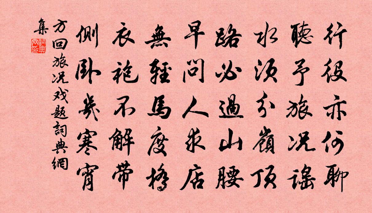 詩詞名句歷史字典書法欣賞書法字典國語詞典說文解字康熙字典古漢語字典標 題 作 者 詩 句 旅況戲題作者:方回 朝代:宋代旅況戲題原文行役亦何聊,聽予旅況謠。水須分嶺頂,路必過山腰。早問人求店,無輕馬度橋。衣袍不解帶,側臥幾寒宵。詩詞問答問:旅況戲題的作者是誰?答:方回問:旅況戲題寫於哪個朝代?答:宋代方回旅況戲題書法欣賞旅況戲題書法作品詩詞推薦涌金池董嗣杲〔宋代〕一道香溝壓郭西,粉牆低護石階危。短碑數尺鐫何字,清泰三年鑿此池。橋市浣衣無空處,廟門賣卜有靈時。碧桃菩薩蠻(永州故人亭和聖徒季行韻)趙師俠〔宋代〕故人話別情難已。故人此別何時會。江上駐危亭。離懷牽故情。悠悠東去水。簇簇漁村市。應記合江濱。瀟湘別故浣溪沙(鄭尚書席上再作)林淳〔宋代〕冒雪休尋訪戴船。紅爐剩爇寶香然。閣兒煨暖兩三椽。更有玉杯傳素手,梅花相對兩爭妍。停杯聽唱月娟娟。龍洞二首張嵲〔宋代〕岩樹交柯如有意,欲將密葉蔽溪門。紫府沿源應不遠,未知相去幾程雲。秋思陸游〔宋代〕老懷不慣著閒愁,信腳時為野外游。過雁未驚殘月曉,片雲先借一天秋。村醅似粥家家醉,社肉如林處處留。七十霜天曉月(慶高尉)李廷忠〔宋代〕洞天仙伯。總是梅標格。來索東風一笑,香浮動、潛溪月。壽尊誰共酌。少年花縣客。試問日邊春信,梁園上、正第一山顏師魯〔宋代〕聞說淮南第一山,老來方此憑欄乾。孤城不隔長安望,落日空悲汴水寒。上元思京輦舊遊三首張耒〔宋代〕隨計當年寄玉京,一時交結盡豪英。倒觥凌亂迷籌飲,醉帽敧斜並轡行。仕路飛騰輸俊傑,山城憔悴感功名。佳晨夜半樂(中呂調)柳永〔宋代〕艷陽天氣,煙細風暖,芳郊澄朗閒凝佇。漸妝點亭台,參差佳樹。舞腰困力,垂楊綠映,淺桃穠李夭夭,嫩紅無數漁家傲(壽白石)盧祖皋〔宋代〕白石山中風景異。先生日日懷歸計。何事黃岡飛雪地。偏著意。畫堂卻為東坡起。人說前身坡老是。文章氣節渾相題卍庵墨跡釋法薰〔宋代〕卍庵空裹採花,諸人石上種藕。三點前三點後,動南星蹉北斗。山僧口似磉盤,舜若多神失笑。送文甫兄歸番陽二首馬廷鸞〔宋代〕白髮蒼顏老弟兄,累年隔闊話情親。杭京一訪且千里,盤祖諸孫才九人。掃榻少留深雨夜,著鞭又趁早霜晨。曾門次韻張唐卿張鎡〔宋代〕邇來衰鬢漸當箝,杖策投繻感壯年。得失暮三朝必四,才能人百已難千。顧形真是臞仙薄,琢句何堪大手騰。紈袴省中即事岑參〔唐代〕華省謬為郎,蹉跎鬢已蒼。到來恆襆被,隨例且含香。竹影遮窗暗,花陰拂簟涼。君王新賜筆,草奏向明光。杭頭晚興嚴州陸游〔宋代〕落葉孤村晚下程,痴雲殘日半陰晴。篝爐火暖床敷穩,臥聽黃鴉穀穀聲。偶成二絕蘇籀〔宋代〕延陵乃有能詩鑒,子路猶為少讀書。習氣未忘番簡冊,白頭稽古不應愚。福海院陳岩〔宋代〕風送香來草木靈,壽松何事不重青。日當亭午禪扉靜,藥杵聲中鶴夢醒。渾家門客聯句佚名〔唐代〕自與渾家鄰,馨香遂滿身。無心好清靜,人用去灰塵。 ——麻大終朝每去依煙火,春至還歸養子隔浦蓮 水檻晚晴 以上四印齊本術詞選卷之二邵亨貞〔元代〕冰紈光映素手。竹簟醒殘酒,滿院梅風起,疏雲薄、斜陽漏。蘭棹歸去後,詩人瘦。夢繞瀟湘柳。屢回首。開簾傍登北原望京城有作李復〔宋代〕五季兵銷帝業新,霏煙雙闕照夷門。地盤王氣千齡會,勢據中天萬國尊。劍佩輝光新日月,風雷鼓舞雙寒溫。開先名句推薦霜草蒼蒼蟲切切,村南村北行人絕。白居易《村夜》 居必擇鄉,游必就士。荀子《荀子·勸學》 遊說萬乘苦不早,著鞭跨馬涉遠道。李白《南陵別兒童入京》 濃霧知秋晨氣潤,薄雲遮日午陰涼,不須飛蓋護戎裝。范成大《浣溪沙·江村道中》 深知身在情長在,悵望江頭江水聲。李商隱《暮秋獨游曲江》 在善用,不在眾。宋祁、歐陽修、范鎮、呂夏卿等《新唐書·列傳·卷三十六》 眾生必死,死必歸土:此之謂鬼。戴聖《禮記·祭義》 冰合井泉月入閨,金缸青凝照悲啼。李白《夜坐吟》 此處不留人,自有留人處。馮夢龍《喻世明言·卷三》 鳥飛反故鄉兮,狐死必首丘。屈原《九章》