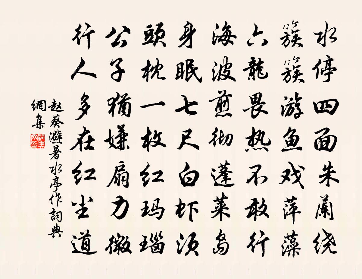 詩詞名句歷史字典書法欣賞書法字典國語詞典說文解字康熙字典古漢語字典標 題 作 者 詩 句 避暑水亭作作者:趙葵 朝代:宋代避暑水亭作原文水停四面朱蘭繞,簇簇游魚戲萍藻。六龍畏熱不敢行,海波煎徹蓬萊島。身眠七尺白蝦須,頭枕一枚紅瑪瑙。公子猶嫌扇力微,行人多在紅塵道。詩詞問答問:避暑水亭作的作者是誰?答:趙葵問:避暑水亭作寫於哪個朝代?答:宋代趙葵避暑水亭作書法欣賞避暑水亭作書法作品詩詞推薦奉寄朱昌叔王令〔宋代〕勞勞忽忽欲誰從,要有田園去自終,衰俗未佑誰得失,古風期與子窮通。三年客興看秋葉,萬里歸心寄斷蓬。知有偈頌十二首釋道璨〔宋代〕無個入處,奔走 * 。有個入處,礙塞 * 。無題朱元璋〔明代〕雞叫一聲撅一撅,雞叫二聲撅二撅。三聲四聲天下白,褪盡殘星與曉月。題郭信可琴中趣軒馮時行〔宋代〕泠泠瓦接吾耳,瓦塵爾非真瓦精。大音瓦寂無響,瓦礫如雷鳴。古今滯迷妄,溜溜塵所縈。落葉隨水去,顛風吹殘大言雍裕之〔唐代〕四溟杯淥醑,五嶽髻青螺。揮汗曾成雨,畫地亦成河。送潘德久之官建康陳傅良〔宋代〕平生不解通毛刺,萬事無能改鬢華。豈是襟懷堪逆旅,直須詩句可名家。老為賓客從戎幙,強使妻孥理帽紗。不有論玉蜂形賈似道〔宋代〕尖翅名呼是玉蜂,千中難遇實難逢。如君遇著須不避,不比尋常是毒蟲。補樂歌十首。雲門元結〔唐代〕(《雲門》,軒轅氏之樂歌也,其義蓋言云之出,潤益萬物,如帝之德,無所不施。凡二章,章四句)玄雲溶溶兮清平樂孫惟信〔宋代〕秋娘窗戶。夢入陽台雨。小別殷勤留不住。恨滿飛花落絮。一天曉月檐西。馬嘶風拂羅衣。分付許多風致,送人行和毛國鎮白雲莊五詠其四濯纓庵蘇轍〔宋代〕臨池濯足惜泉清,纓上無塵且強名。橫木為橋便獨往,結茅依島類天成。往還漸少人誰識,寢食無為身轉輕。有似杭州望湖樓李建中〔宋代〕小艇閒撐處,湖天景物微。春波無限綠,白鳥自由飛。落日孤汀遠,輕煙古寺稀。時攜一壺酒,戀到晚涼歸。和玉汝弟感秋偶書韓維〔宋代〕園林雨余清,碧色遍秋草。露葉委閒階,風荷亂幽沼。晨昏爽氣嘉,吾意欲輕矯。古來達道者,冥冥獨見曉。四序和程閣學送小春茶韻四首袁說友〔宋代〕眼看節物去重來,又見寒梢數點梅。草木已隨新歲好,冬芽豫占一年魁。頌石頭和尚草庵歌釋印肅〔宋代〕迴光返照便歸來,鼻孔遼天眼豁開。元來佛法無多子,連祝三拳打自呆。頌古三十一首釋梵琮〔宋代〕怪雨狂風勢欲傾,陰垂六合見雲騰。一條瀑布岩前落,界破青山千萬層。送蔡駰守天台蔡肇〔宋代〕天召四萬八千丈,玉京五城十二樓。欲乘西風跨獨鶴,直渡南斗騎牽牛。 * 長爪快搔背,巢父投竿應掉頭。廣文紹興乙□中秋後五日乘休沐之□□舟□家為藏朱某〔宋代〕白首扁舟□□訪尋,江山□□□登臨。□□□是□□藏處,□□平生賞愛心。一百八盤范成大〔宋代〕疇昔辭桂林,自謂已出嶺。蛻蟬蠻煙中,恍若醉夢醒。今來峽山路,步步躡雲頂。仍聞蚯蚓瘴,顧與嶠南等。平生奉和浚池初成清晨臨泛詩庾信〔南北朝〕千金高堰合。百頃浚源開。翻逢積翠浪。更識昆明灰。猿嘯風還急。雞鳴潮即來。時看青雀舫。遙逐桂舟回。悼翁仲立達州陳傅良〔宋代〕憶昔看封事,令人激懦衷。邊籌皆破的,硬語更盤空。晚亦通家好,居然與眾同。行藏嘗論定,誰假一帆風。名句推薦秋風吹地百草乾,華容碧影生晚寒。李賀《開愁歌》 願得一心人,白頭不相離。卓文君《白頭吟》 才道莫傷神,青衫濕一痕。納蘭性德《菩薩蠻·新寒中酒敲窗雨》 愁雲淡淡雨瀟瀟。暮暮復朝朝。石孝友《眼兒媚·愁雲淡淡雨蕭蕭》 紫萸一枝傳賜,夢誰到、漢家陵。姚雲文《紫萸香慢·近重陽》 行雲卻在行舟下,空水澄鮮,俯仰留連,疑是湖中別有天。歐陽修《採桑子·畫船載酒西湖好》 借得山東煙水寨,來買鳳城春色施耐庵《念奴嬌·天南地北》 常將有日思無日,莫把無時當有時。佚名《增廣賢文·上集》 竹樹帶飛嵐,荇藻俱明麗。劉道著《湘江秋曉》 念往昔,繁華競逐,嘆門外樓頭,悲恨相續。王安石《桂枝香·登臨送目》