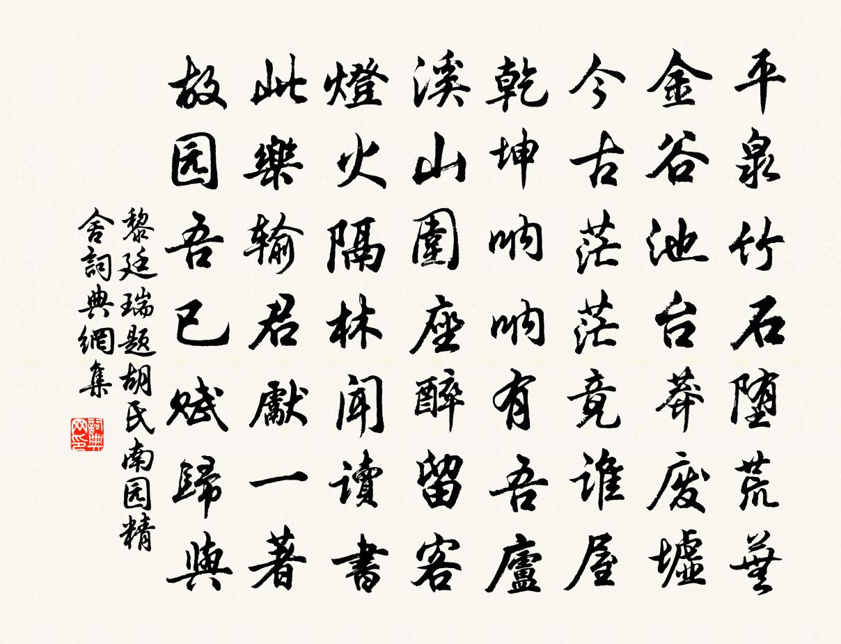 詩詞名句歷史字典書法欣賞書法字典國語詞典說文解字康熙字典古漢語字典標 題 作 者 詩 句 題胡氏南園精舍作者:黎廷瑞 朝代:宋代題胡氏南園精舍原文平泉竹石墮荒蕪,金谷池台莽廢墟。今古茫茫竟誰屋,乾坤吶吶有吾廬。溪山圍座醉留客,燈火隔林聞讀書。此樂輸君先一著,故園吾已賦歸與。詩詞問答問:題胡氏南園精舍的作者是誰?答:黎廷瑞問:題胡氏南園精舍寫於哪個朝代?答:宋代黎廷瑞題胡氏南園精舍書法欣賞題胡氏南園精舍書法作品詩詞推薦答子有洪咨夔〔宋代〕高吟梁甫臥隆中,眼底駑駘不足空。清白自將千古月,溫涼不定六明風。交梨火棗根苗長,翠竹黃花信息通。樓外示俞秀老王安石〔宋代〕繚繞山如涌翠波,人家一半在煙蘿。時豐笑語春聲早,地僻追尋野興多。窣堵朱甍開北向,招提素脊隱西阿。暮年馬升庵惠鞠苗張至龍〔宋代〕稅得隣東地一方,旋栽黃鞠等重陽。春晨摘落青苗葉,挼作秋花氣味香。綺羅香 紅葉王沂孫〔宋代〕玉杵餘丹,金刀剩彩,重染吳江孤樹。幾點朱鉛,幾度怨啼秋暮。驚舊夢、綠鬢輕凋,訴新恨、絳唇微注。最堪憐送路少府使京兼覲侍御兄皎然〔唐代〕國賦推能吏,今朝發貢湖。佇瞻雙闕鳳,思見柏台烏。樹向秦關遠,江分楚驛孤。榮君有兄弟,相繼騁長途。櫻桃答李商隱〔唐代〕眾果莫相誚,天生名品高。何因古樂府,惟有鄭櫻桃。和季成弟中秋不見月潘良貴〔宋代〕經年等待中秋月,一夕陽雲掃不開。高樹時驚疏雨過,空山那復故人來。夢回誰憶霓裳戲,老去愁聞水調哀。與子湖州舟中趙蕃〔宋代〕平生苕霅又扁舟,尚喜深盟不負鷗。憶昔詩篇渾漫興,只今翻覺費冥搜。七月望日避地省坑存思庵留題時章林出白石可舒岳祥〔宋代〕去家無十里,過嶺即他鄉。避地身三到,傷時淚數行。高檐齊古樹,新屋背斜陽。我欲相鄰住,青山志未償。挽處士吳德載二首陳棣〔宋代〕憶昔知公日,東嘉逆旅中。游從三月久,談笑一樽同。卻暑瓜盤綠,亨鮮膾箸紅。傷心棲止地,萬事轉頭空。小雪前三日鍾冠之約余侍老人行山舟發後洪入洪咨夔〔宋代〕無雨又無日,此行天相之。荒園遺木老,古隧得峰奇。霜晚蔬猶劍,風溫茗已旗。行廚何用許,勝處可忘飢。題周茂叔拙賦何平仲〔宋代〕偽者勞其心,關機有時闕。誠者任其真,安知拙為拙。舍偽以存誠,何須俟詞說。臨江仙佚名〔宋代〕魯觀書雲方在候,潁川家慶非常。望前四日上椒觴。北堂人未老,南極夜增光。借問遐齡今幾許,希年恰喜相當。木蘭花慢佚名〔宋代〕看纖雲雙月,湛河漢,夜聲收。正玉塵生風,銀床墜露,涼葉颼颼。襟懷靜吞八表,莫登山臨水易驚秋。閒想多情之馮翊祖道詩孫楚〔魏晉〕舉翮撫三秦。抗我千里目。念當隔山河。執觴懷慘毒。妾薄命六首林景熙〔宋代〕陌上桑欲稀,室中蠶正飢。妾心知採桑,安知使君誰。結髮為人婦,幾年守空幃。婦義不移天,相邀何乃痴。老姑丈亭陳造〔宋代〕小江隨山巧回互,轉首碧流分兩股。丈亭系纜待潮生,徙倚才容一炊許。潮信曾何差頃刻,固應作意憐行客。為誰牛酥行江端友〔宋代〕有客有客官長安,牛酥百斤親自煎。倍道賓士少師府,望塵且欲迎歸軒。守閽呼語“不必出,已有人居第一先。其菩薩蠻(杏花)劉學箕〔宋代〕昨日杏花春滿樹。今晨雨過香填路。零落軟胭脂。濕紅無力飛。轉頭春易去。春色歸何處。待密與春期。春歸人也離思五首·其四元稹〔唐代〕曾經滄海難為水,除卻巫山不是雲。取次花叢懶回顧,半緣修道半緣君。名句推薦突營射殺呼延將,獨領殘兵千騎歸。李白《從軍行》 記得別伊時,桃花柳萬絲。納蘭性德《菩薩蠻·新寒中酒敲窗雨》 九月九日望鄉台,他席他鄉送客杯。王勃《蜀中九日 / 九日登高》 獵人箭底求傷雁,釣戶竿頭乞活魚。王建《寄舊山僧》 城頭一片西山月,多少征人馬上看。李攀龍《塞上曲送元美》 慎終如始,則無敗事。老子《老子·德經·第六十四章》 碧水驚秋,黃雲凝暮,敗葉零亂空階。秦觀《滿庭芳·碧水驚秋》 孤鴻號外野,翔鳥鳴北林。阮籍《詠懷八十二首·其一》 蓬門未識綺羅香,擬托良媒益自傷。秦韜玉《貧女》 天地之大也,人猶有所憾。故君子語大,天下莫能載焉,語小,天下莫能破焉。子思《中庸·第十二章》