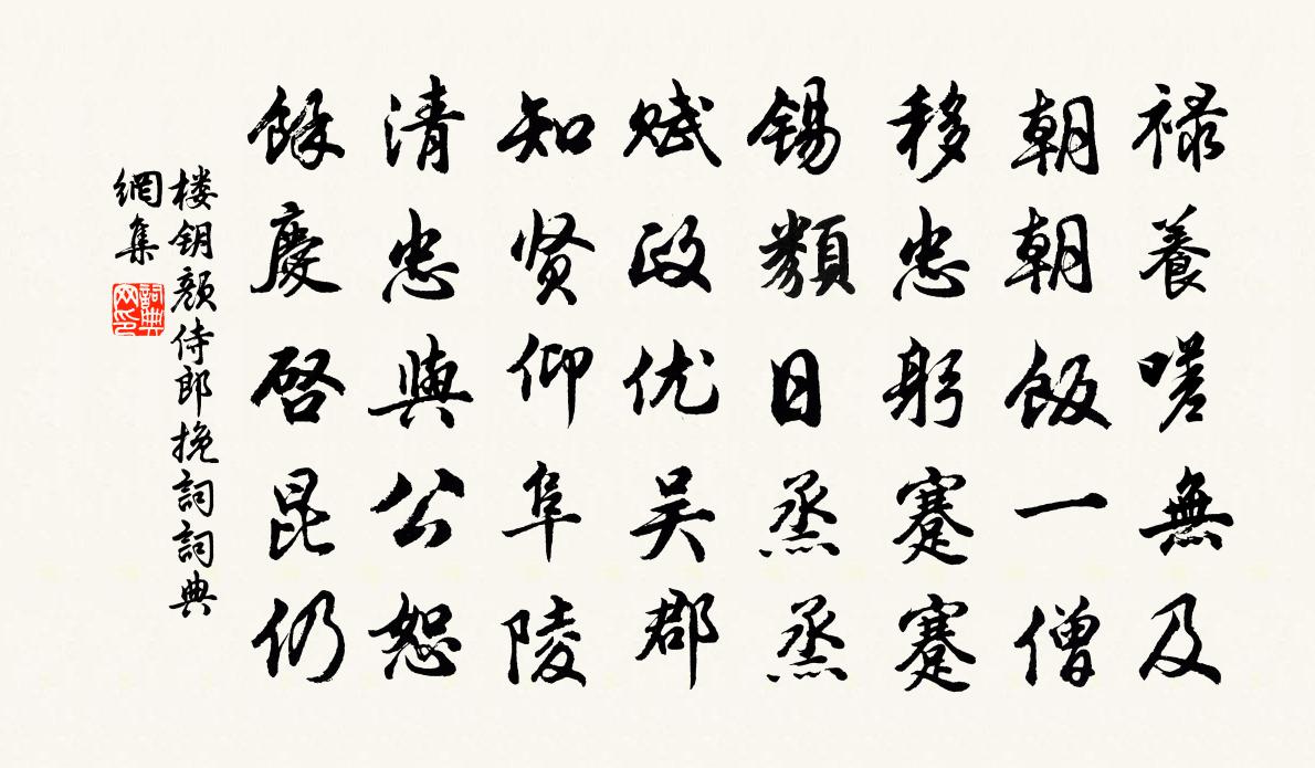 詩詞名句歷史字典書法欣賞書法字典國語詞典說文解字康熙字典古漢語字典標 題 作 者 詩 句 顏侍郎輓詞作者:樓鑰 朝代:宋代顏侍郎輓詞原文祿養嗟無及,朝朝飯一僧。移忠躬蹇蹇,錫類日烝烝。賦政優吳郡,知賢仰阜陵。清忠與公恕,餘慶啟昆仍。詩詞問答問:顏侍郎輓詞的作者是誰?答:樓鑰問:顏侍郎輓詞寫於哪個朝代?答:宋代樓鑰顏侍郎輓詞書法欣賞顏侍郎輓詞書法作品詩詞推薦同劉貢甫學士登石鼓合江亭一首張舜民〔宋代〕乘興俄成石鼓游,可堪搖落楚江秋。岩中名字今何在,亭下瀟湘古亦愁。萬里再驚金馬客,一家重上木蘭舟。卻令題申之寄示春郊畫軸樓鑰〔宋代〕郊原膴春好意足,細草淒迷芳樹綠。雁鶩無數泛陂塘,羊牛相與隨芻牧。幾年不泛浙西船,恍如蘇台俯平川。閒人送夏侯正言奉使江南王禹偁〔宋代〕百舌關關麥壠青,遠山迎馬翠如屏。禁中已誦相如賦,江外猶看使者星。衣拂茶煙尋水寺,枕欹梅雨泊沙汀。歸期感事晁說之〔宋代〕長江無月令,氛祲日胚胎。北闕望不見,東風呼弗來。後皇本圖治,上帝肯遺才。為問縉紳士,何容賦七哀。江南行張潮〔唐代〕茨菰葉爛別西灣,蓮子花開猶未還。妾夢不離江水上,人傳郎在鳳凰山。江湖偉觀傅夢得〔宋代〕倚遍闌乾指顧間,吟身恨不早生翰。幾多風月閒中占,一望江湖眼界寬。胥浪掀天秋際闊,逋梅得月夜深寒。有時別妻家孟郊〔唐代〕芙蓉濕曉露,秋別南浦中。鴛鴦卷新贈,遙戀東床空。碧水不息浪,清溪易生風。參差坐成阻,飄颻去無窮。孤雲賀友山新建成東皋接待釋紹曇〔宋代〕分袂南湖十數春,近聞華搆策奇勳。缽從金粟摶香飯,僧自東皋接水雲。柔玉新拳春塢蕨,懶黃新縷曉溪芹。定應六十五春寒吟七首方回〔宋代〕當是平生取數多,窮途無力戰群魔。二千石濫知州事,三十年羞進士科。人老決難重少壯,春寒畢竟漸晴和。籌來三月二日被命祈晴上天竺舟中得六絕句劉克莊〔宋代〕手寫八詩寄,耳聾三日驚。何須論句法,年自讓吾兄。北歸次秋浦界清溪館劉長卿〔唐代〕萬里猿啼斷,孤村客暫依。雁過彭蠡暮,人向宛陵稀。舊路青山在,餘生白首歸。漸知行近北,不見鷓鴣飛。題豐穎樓陳宓〔宋代〕壽溪百里薦寒流,來護楊君少尹丘。三復先公當日翰,重修處士舊時樓。高山不減八千仞,往事空餘五十秋。闢作霜天曉角范成大〔宋代〕晚晴風歇。一夜春折威。脈脈花疏天淡,雲來去、數枝雪。勝絕。愁亦絕。此情誰共說。惟有兩行低雁,知人倚、女冠子·春山夜靜李珣〔五代〕春山夜靜,愁聞洞天疏磬。玉堂虛,細霧垂珠佩,輕煙曳翠裾。對花情脈脈,望月步徐徐。劉阮今何處?絕來書!行次下渚湖二首張鎡〔宋代〕野童綠草牧鵝群,詩料今朝得幾分。俯仰縱橫皆合律,雲如層樹樹如雲。偈頌一百二十三首釋普度〔宋代〕徑山一椀上元燈,不是攢花剪簇成。等閒拈起當陽掛,爍破諸方鬼眼睛。治安疏海瑞〔明代〕戶部雲南清吏司主事臣海瑞謹奏;為直言天下第一事,以正君道、明臣職,求萬世治安事: 君者,天下臣民萬哭崖山文天祥〔宋代〕寶藏如山席六宗,樓船千疊水晶宮。吳兒進退尋常事,漢氏存亡頃刻中。諸老丹心付流水,孤臣血淚灑南風。早來軍中雜歌陸游〔宋代〕北面行台號令新,繡旗豹尾渡河津。檄書才下降書至,不用兒郎打女真。代小子廣孫寄翁翁孔平仲〔宋代〕爹爹來密州,再歲得兩子。牙兒秀且厚,鄭鄭已生齒。翁翁尚未見,既見想歡喜。廣孫讀書多,寫字輒兩紙。三三名句推薦話不在多說,有理不在高聲!佚名《增廣賢文·下集》 謾道愁須殢酒,酒未醒、愁已先回秦觀《滿庭芳·碧水驚秋》 勿言草卉賤,幸宅天池中沈約《詠新荷應詔》 訪戴歸來,尋梅懶去,獨釣無聊。薛昂夫《蟾宮曲·雪》 雨後輕寒猶未放。春愁酒病成惆悵。歐陽修《蝶戀花·面旋落花風蕩漾》 平林漠漠煙如織,寒山一帶傷心碧。李白《菩薩蠻·平林漠漠煙如織》 相思處、青年如夢,乘鸞仙闕。文天祥《滿江紅·和王夫人滿江紅韻以庶幾後山妾薄命之意》 此身如傳舍,何處是吾鄉。蘇軾《臨江仙·送王緘》 蝴蝶不傳千里夢,子規叫斷三更月。辛棄疾《滿江紅·點火櫻桃》 盡道有些堪恨處,無情,任是無情也動人。秦觀《南鄉子·妙手寫徽真》