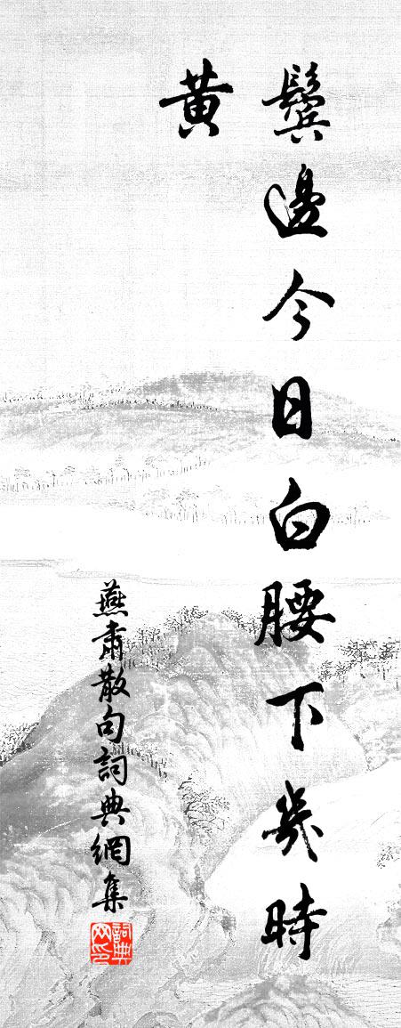 詩詞名句歷史字典書法欣賞書法字典國語詞典說文解字康熙字典古漢語字典標 題 作 者 詩 句 句作者:燕肅 朝代:宋代句原文鬢邊今日白,腰下幾時黃。詩詞問答問:句的作者是誰?答:燕肅問:句寫於哪個朝代?答:宋代燕肅句書法欣賞句書法作品詩詞推薦予客三池王正卿以四絕見寄姿其韻李流謙〔宋代〕夢中行盡好山川,照水征鴻影自寒。若向紫岩樓上過,為傳片紙報平安。能仁仁長老寫師像求贊釋正覺〔宋代〕大圓鏡性,平等智心。老兔臥寒兮清炯炯明月之窟,長鯨{左馬右展}海兮光漾漾珊瑚之林。千里雪翻波渺渺,百六月二十三日立秋喜聞賊平鎮將凱回歸府官俱方回〔宋代〕亂起杏花落,賊平梧葉飛。頓忘三伏暑,竟解萬山圍。大將傷流矢,諸軍曳血衣。先登不如此,焉得凱歌歸。牧養監閱馬強至〔宋代〕骨瘦誰知驥騄名,駑群平視圉夫輕。夷塗好在重驤首,喜見今年春草生。山河嘆送劉左史歸簡州魏了翁〔宋代〕山河兩戒南北分,天地一氣華戎鈞。譬諸指搐非害事,往往西體為不信。惟今愧虜相噬吞,人言雪恥茲其辰。盍驅六月歸途徐璣〔宋代〕星明殘照數峰晴,夜靜惟聞水有聲。六月行人須早起,一天涼露濕衣輕。宦情每向途中薄,詩句多於馬上成。故里和二十二弟龜山寺三絕晁說之〔宋代〕海岸石龜恨未平,時時入海自馮陵。此山磐礡清淮上,寶塔分功更就曾。佛日山樓鑰〔宋代〕曉出都奪暮入山,杖藜蕭散易開顏。松風五里未行盡,隱隱疎鍾紫翠間。采菌方岳〔宋代〕溪行近里所,雪菌朵寒籜。久晴危欲枯,抱瓮日商略。可憐書生愚,為口不計腳。龜腸慣飢虛,雞肋忍饞嚼。獨奇送侄孫汝白往東嘉問訊陳叔方諸丈戴復古〔宋代〕子去尋名勝,何慚著布衣。出門知所鄉,在旅亦如歸。道誼無窮達,文章有是非。寄聲陳與趙,相賞莫相違。寄題連江陳氏拂石軒陸游〔宋代〕平生聞說西江水,百丈奫淪深見底,漁舟來去白鷗飛,上有綸巾隱君子。作詩自許輩陶謝,嘯傲煙雲弄清泚。紛紛踏莎行王以寧〔宋代〕我自山中,漁樵冷族。一丘一壑平生熟。朅來江海寄餘生,心兵語阱頻奔北。九里靈河,十分光燭。分輝借潤須鄰十報恩 贈李校尉馬鈺〔元代〕一身便做個丹丘。於內常常雲水游,離坎交宮真子午,甲庚易位沒春秋。五行四象皆無用,三島十洲卻有由。功行送僧之金陵釋重顯〔宋代〕勝游生末跡,杳自狎時群。卷衲消寒木,揚帆寄斷雲。曙瓶花外汲,午磬浪邊聞。別後石城月,依依遠共分。奉和御製聞早蟬徐鉉〔唐代〕綠樹陰陰愜豫游,早蟬清韻遠還收。喚回晝夢和宮漏,引起微冰助麥秋。禁柳煙中飛乍覺,御溝聲里聽偏幽。群生用東坡韻賀可山得子葉茵〔宋代〕祥光一夜照鄉閭,遲曉鄰翁毓鳳雛。舉坐已夸沾玉果,傳家應不負詩書。生時恰恰逢秋半,長日駸駸課夜余。自顧南歌子(送周機宜之益昌)陸游〔宋代〕異縣相逢晚,中年作別難。暮秋風雨客衣寒。又向朝天門外、話悲歡。瘦馬行霜棧,輕舟下雪灘。烏奴山下一林丹春暮佚名〔宋代〕三月湖天春晝長,東風飄暖草浮光。櫻桃熟後遊人倦,柳絮飛時燕子忙。又和載酒過竹澗韻陳文蔚〔宋代〕名園一水綠瀠洄,消得風流太守來。把酒喔詩真不惡,此時懷抱十分開。蔣丞相得男帖贊岳珂〔宋代〕仕遭時,相真主。材之充,澤斯普。以端逸,御妍嫵。諒予言,法當取。名句推薦十年生死兩茫茫,不思量,自難忘。蘇軾《江城子·乙卯正月二十日夜記夢》 小山重疊金明滅,鬢雲欲度香腮雪。溫庭筠《菩薩蠻·小山重疊金明滅》 心生而言立,言立而文明,自然之道也劉勰《文心雕龍·原道》 養心須淡泊,凡足以累吾心者勿為也。王永彬《圍爐夜話·第九八則》 古人不見今時月,今月曾經照古人。佚名《增廣賢文·上集》 命室攜童弱,良日登遠遊陶淵明《酬劉柴桑》 煙橫水際,映帶幾點歸鴉,東風銷盡龍沙雪。賀鑄《石州引·薄雨初寒》 無參驗而必之者,愚也;弗能必而據之者,誣也。韓非及後人《韓非子·顯學》 重幃深下莫愁堂,臥後清宵細細長。李商隱《無題·重幃深下莫愁堂》 系我一生心,負你千行淚。柳永《憶帝京·薄衾小枕涼天氣》