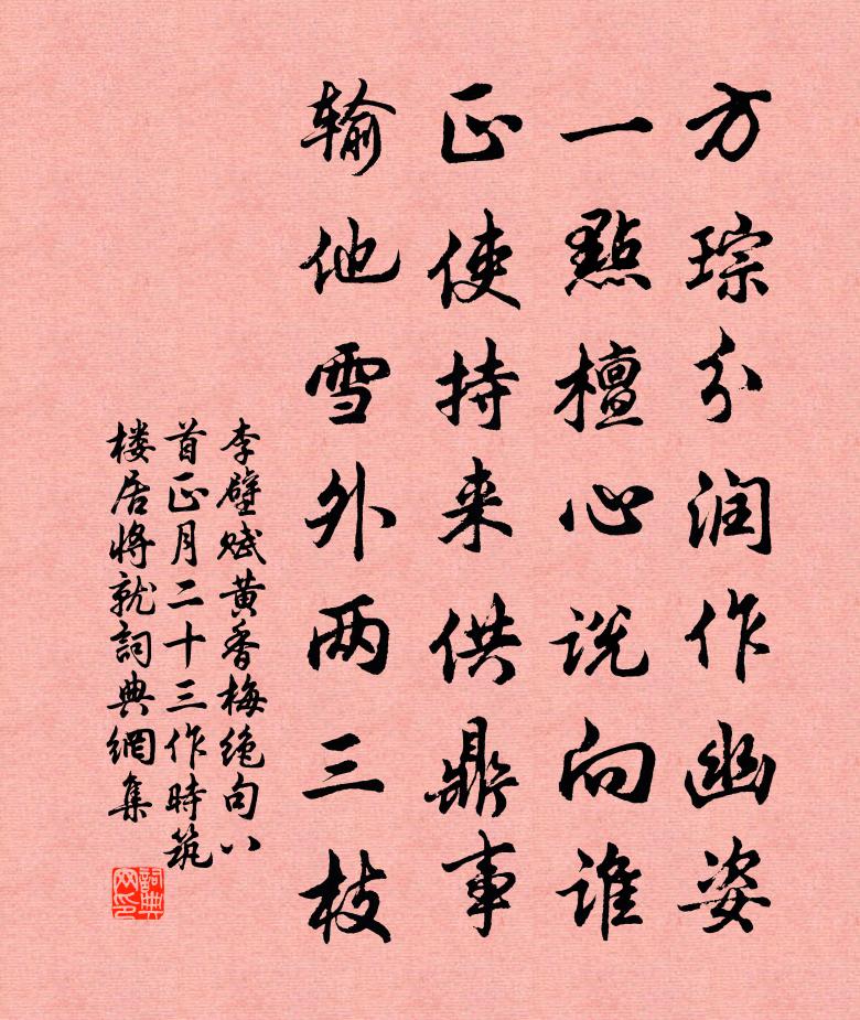 詩詞名句歷史字典書法欣賞書法字典國語詞典說文解字康熙字典古漢語字典標 題 作 者 詩 句 賦黃香梅絕句八首正月二十三作時築樓居將就作者:李壁 朝代:宋代原文方琮分潤作幽姿,一點檀心說向誰。正使持來供鼎事,輸他雪外兩三枝。詩詞問答問:《賦黃香梅絕句八首正月二十三作時築樓居將就》的作者是誰?答:李壁問:該詩寫於哪個朝代?答:宋代書法欣賞賦黃香梅絕句八首正月二十三作時築樓居將就書法作品詩詞推薦奉和御製藉田詩夏竦〔宋代〕紹休文祖盛儀陳,載耜東耕協忡春。冕服遠推逾古制,須知明主為生民。水調歌頭(張茶馬□□生日六日十八立)魏了翁〔宋代〕輕露淪殘暑,蟾影插高寒。團團只似前夕,持向老萊看。九帙元開父算,六甲更逢兒換,梧竹擁檀欒。都把方寸地江行遇王侍御黃滔〔唐代〕數年分散秦吳隔,暫泊官船浦柳中。新草軍書名更重,久辭山徑業應空。渡頭潮落將行客,天際風高未宿鴻。此日題明皇按樂圖黃庚〔宋代〕五鳳樓前沸管弦,春宵花暖月娟娟。纖腰舞到霓裳曲,驚起豬龍地上眠。赤松三詠二仙廟姜特立〔宋代〕自從兄弟得神仙,一去空山竟杳然。唯有華陰舒道士,好詩長與此山傳。導引佚名〔宋代〕深仁厚德,流澤自無窮。仙馭倏賓空。衣冠未返蒼梧遠,遙望鼎湖龍。人間仿佛認天容。縹緲五雲中。帝城猶有遺和丁丞相吳潛〔宋代〕夷狄為陰中國陽,豈容羊犬更鴟張。捷書一紙來從廣,凱奏連旗至自揚。盡瘁元臣食放箸,偷安老守寢凝香。但憐偈頌三十首釋印肅〔宋代〕圓應牛,經劫沒人收。若不遇人,虛度春秋。如今橫穿鼻孔,水草皆休。有時放,有時收,隨分納些些,自性優遊偈頌一百一十七首釋紹曇〔宋代〕五髻峰頭,怨憎會苦。熱血相噴,重重染污。個樣老妖魔,慚愧今朝死。粗茶一甌,粗香一炷,供養阿儂。秋峽杜甫〔唐代〕江濤萬古峽,肺氣久衰翁。不寐防巴虎,全生狎楚童。衣裳垂素髮,門巷落丹楓。常怪商山老,兼存翊贊功。建昌道上戴復古〔宋代〕凜凜北風勁,行行西路賒。人情甘淡薄,世事苦參差。酒易逢知己,詩難遇作家。林間數點雪,錯認是梅花。謹和老人蓮桂二絕洪咨夔〔宋代〕點破秋光數葉荷,水清時見小魚過。渟涵風露三更足,收拾江湖萬頃多。和端式上人十詠其七天外峰梅堯臣〔宋代〕天外一尺峰,國中千仞岳。重雲不掩蔽,萬里見頭角。世人看遠碧,誰識產美璞。潭畔芙蓉浣花女〔宋代〕芙蓉花發滿江紅,盡道芙蓉勝妾容。昨日妾從堤上過,如何人不看芙蓉。從軍行陸機〔魏晉〕苦哉遠征人。飄飄窮四遐。南陟五嶺巔。北戍長城阿。深谷邈無底。崇山郁嵯峨。奮臂攀喬木。振跡涉流沙。隆暑秘藏院丘葵〔宋代〕才入空門裹,塵心使欲拋。土花生石縫,野蔓上林梢。棟老蜂鑽穴,檐低雀結巢。僧中無賈島,得句自推敲。夏日覽物思古人三首陶潛韓維〔宋代〕眾鳥依嘉樹,想像先生居。日喔高簡篇,濁酒自為娛。世事不掛口,方且愛吾廬。又送馬氏兄弟歸彭門李石〔宋代〕山程趼足肯相從,未厭崎嶇易道東。二馬仙風還舊觀,六鰲香餌看新功。北田夜誦披蓮蕊,東閣春歸折桂叢。努力贈良坦侄知永嘉趙與辟〔宋代〕墨綬銅章拜命新,鳴琴之治在於今。花封佇見風流似,柳舍休教別人殷。南歸醉題家圃二首鄧肅〔宋代〕近輔暴迫狼虎,聖君德大乾坤。萬里去黃金闕,一杯得杏花村。名句推薦今年歡笑復明年,秋月春風等閒度。白居易《琵琶行 / 琵琶引》 猶傶則疏之,毋使人圖之,猶疏則數之,毋使人曲之管仲《管子·侈靡》 亂世用能,平則去患。來俊臣《羅織經·控權卷第四》 俱往矣,數風流人物,還看今朝。 * 《沁園春·雪》 愛民者強,不愛民者弱荀子《荀子·議兵》 春秋多佳日,登高賦新詩。陶淵明《移居二首》 千萬恨,恨極在天涯。溫庭筠《夢江南·千萬恨》 一道殘陽鋪水中,半江瑟瑟半江紅。白居易《暮江吟》 騷人可煞無情思,何事當年不見收。李清照《鷓鴣天·桂花》 處世不退一步處,如飛蛾投燭、羝羊觸藩,如何安樂?洪應明《菜根譚·概論》
