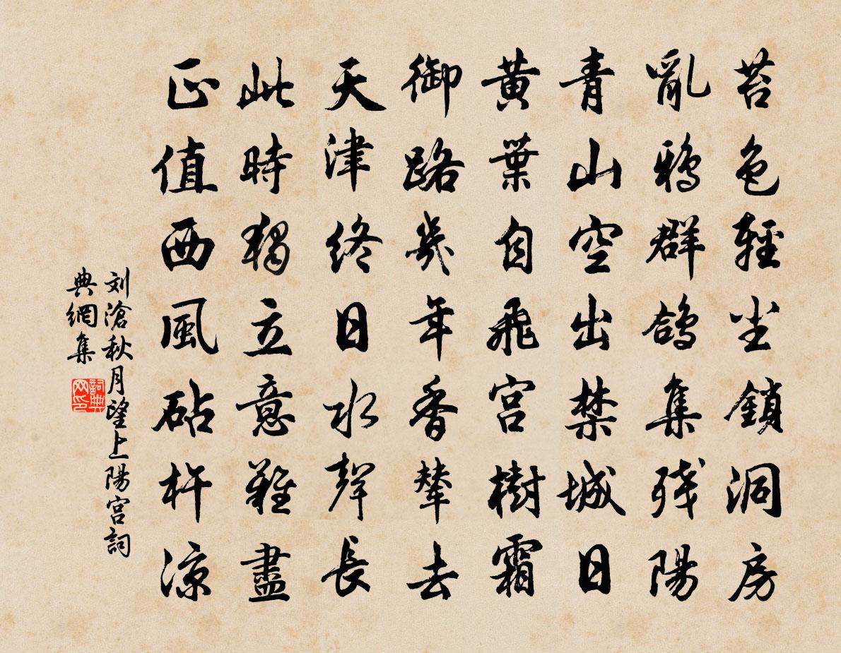 詩詞名句歷史字典書法欣賞書法字典國語詞典說文解字康熙字典古漢語字典標 題 作 者 詩 句 秋月望上陽宮作者:劉滄 朝代:唐代秋月望上陽宮原文苔色輕塵鎖洞房,亂鴉群鴿集殘陽。青山空出禁城日,黃葉自飛宮樹霜。御路幾年香輦去,天津終日水聲長。此時獨立意難盡,正值西風砧杵涼。詩詞問答問:秋月望上陽宮的作者是誰?答:劉滄問:秋月望上陽宮寫於哪個朝代?答:唐代問:秋月望上陽宮是什麼體裁?答:七律劉滄秋月望上陽宮書法欣賞秋月望上陽宮書法作品注釋全唐詩:卷586-82詩詞推薦病中大雪數日未嘗起觀虢令趙薦以詩相屬戲用蘇軾〔宋代〕經旬臥齋閣,終日親劑和。不知雪已深,但覺寒無奈。飄蕭窗紙鳴,堆壓檐板墮。(關中皆以板為檐。風飆助凝冽浣溪沙(己未元夕)吳潛〔宋代〕慶賞元宵只願晴。天公每事秤能平。管教檐溜便收聲。三市海巡那惜夜,九街社火亦爭名。權將歌酒作工程。示韓令人釋宗杲〔宋代〕說不到處著一句,風前截斷千差路。超佛越祖只如今,壁立萬仞無回互。頌古十一首釋鹹傑〔宋代〕百戰場中舞纛旗,將軍立處十分危。遊人只看錐頭利,失卻吹毛總不知。贈雲留道人張埴〔宋代〕鹹池沐發扶桑晞,只手橫捉鄧林枝。楚人六月請時雨,呼喚雷公似嬰兒。喜遷鶯吳潛〔宋代〕良辰佳節。問底事,十番九番為客。景物春妍,鶯花日鬧,自是情懷今別。只有思歸魂夢,卻怕杜鵑啼歇。消凝處裴司士、員司戶見尋(一題作裴司士見訪)孟浩然〔唐代〕府僚能枉駕,家醞復新開。落日池上酌,清風松下來。廚人具雞黍,稚子摘楊梅。誰道山公醉,猶能騎馬回。正月望夕供養大阿羅漢畫像作宋庠〔宋代〕端月戒熙陽,望舒秀圓極。洗心乘佳節,瞻像洗慈德。穆穆屋漏尊,虛堂與神寂。繪境紛自奇,法性非所得。人貌成都運司西園亭詩水閣許將〔宋代〕飛閣出方池,修竹見空莽。低臨花塢近,平覺春波長。返景澄餘暉,夕陰帶浮爽。從容觀魚樂,不減游濠上。秋夜梁七兵曹同宿二首錢起〔唐代〕一笑不可得,同心相見稀。摘菱頻貰酒,待月未扃扉。星影低驚鵲,蟲聲傍旅衣。卑棲歲已晚,共羨雁南飛。好欲記前輩語陸游〔宋代〕疇昔見諸老,從客聞至言。馬非求路寢,木豈願犧尊。臥起數椽屋,嘯歌三畝園。人生正應爾,雲夢不須吞。清平樂(詠雪)程垓〔宋代〕疏疏整整。風急花無定。紅燭照筵寒欲凝。時見篩簾玉影。夜深明月籠紗。醉歸涼麵香料。猶有惜梅心在,滿庭誤塗中晁說之〔宋代〕十年未就歸山計,一日翻為保障翁。無奈征衣中散虱,可堪行道庶人風。悠悠秦晉山河在,漠漠金張冢墓空。回首和廬陵士尹八俊投贈韻程公許〔宋代〕白苧裁春衫,京塵可得緇。一麾江海去,何成復何虧。馳驅兩輪朱,蕭騷雙鬢絲。所欣歲功就,千里春台熙。素念約潘瓜山劉學錄登高陳宓〔宋代〕三年八日登高集,喜趁衰年尚健身。不為黃華浮白酒,世間難得是閒人。御河舟中強至〔宋代〕浮舟不用力,一水靜於出。沙鳥晴相喚,河雲晚更閒。微吟窮有象,清思入無間。河策誰雲補,從公漫往還。挽程尚書詞項安世〔宋代〕人間一日履聲藏,天上文昌落在芒。直諒無朋今魏汲,師承有法古韋康。思陵冊府嚴招騁,孝廟經帷盛表章。歲晚翰長再有北門之拜宋祁〔宋代〕病褫荷囊避禁闈,彌年專氣養瓊枝。仙都去後桃尋熟,溫室重來樹更滋。宮月舊蟾涵靜滴,武泥前劄燥殘芝。寶釘從宋憲登萬景樓晁公溯〔宋代〕勝地熊開傑觀,熊大川壯重關。使者領我來,共此須臾閒。玉節照綠野,銀熊落青綸。酒酣望八極,氣豪吞百蠻。次韻酬鄧子儀二首王安石〔宋代〕金陵邂逅府東偏,手得新蒲每共編。採石偶耕垂百日,青溪並釣亦三年。君才有用方求祿,我志無成稍問田。一笑名句推薦欲尋芳草去,惜與故人違。孟浩然《留別王侍御維 / 留別王維》 春潮帶雨晚來急,野渡無人舟自橫。韋應物《滁州西澗》 離離原上草,一歲一枯榮。白居易《草 / 賦得古原草送別》 有鳥鷙立,羽翼張。柳宗元《唐鐃歌鼓吹曲十二首·其四》 願我如星君如月,夜夜流光相皎潔。范成大《車遙遙篇》 相思不管年華,喚酒吳娃市。吳文英《荔枝香近·送人游南徐》 別後不知君遠近。觸目淒涼多少悶。歐陽修《玉樓春·別後不知君遠近》 幽徑無人獨自芳,此恨憑誰訴。曹組《卜運算元·蘭》 故鄉歸去千里,佳處輒遲留。蘇軾《水調歌頭·安石在東海》 斜陽照墟落,窮巷牛羊歸。王維《渭川田家》