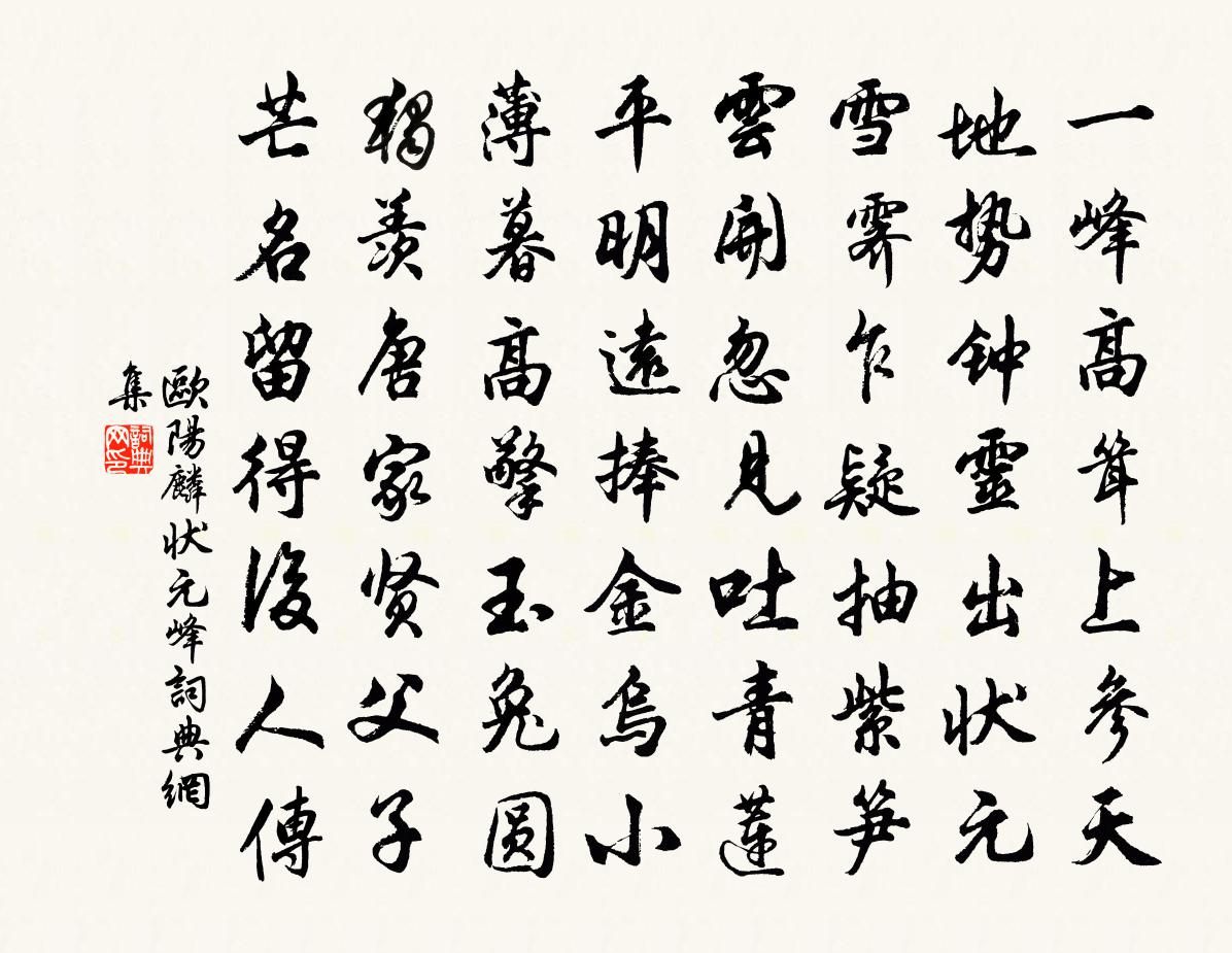 詩詞名句歷史字典書法欣賞書法字典國語詞典說文解字康熙字典古漢語字典標 題 作 者 詩 句 狀元峰作者:歐陽麟 朝代:宋代狀元峰原文一峰高聳上參天,地勢鍾靈出狀元。雪霽乍疑抽紫筍,雲開忽見吐青蓮。平明遠捧金烏小,薄暮高擎玉兔圓。獨羨唐家賢父子,芒名留得後人傳。詩詞問答問:狀元峰的作者是誰?答:歐陽麟問:狀元峰寫於哪個朝代?答:宋代歐陽麟狀元峰書法欣賞狀元峰書法作品詩詞推薦寄贈集虛孟高士方回〔宋代〕天地春藏凍核中,時來蜂蝶哄東風。萬端變化根無極,一寸靈明裹太空。妙處千江分明月,飄然六合點飛鴻。守玄冰壺二首錢時〔宋代〕一掃從前萬慮非,寒光冷照發幽微。乾坤總在冰壺裹,不費壺公日暮歸。言懷仇遠〔宋代〕故家喬木盡丘墟,筍石猶存十數株。誰有挾山超海力,為分雲片過西湖。潛佚名〔先秦〕猗與漆沮,潛有多魚。有鱣有鮪,鰷鱨鰋鯉。以享以祀,以介景福。齊山喻良能〔宋代〕龕岩宜號秘密藏,翠微應呼清淨身。欲憑妙句發佳境,安得揮毫我輩人。江上孔武仲〔宋代〕萬里長江一葉舟,客心蕭索已驚秋。亂霞影照山根寺,落日光翻水面樓。淺浦耀金知躍鯉,前灘點雪兒棲鷗。少年壽李雁湖吳泳〔宋代〕起從通德里,出守巽岩州。上相先聲到,兇徒悍氣柔。鴻居新勞徠,鳥戶舊綢繆。已築沙堤路,歸歟贊大猷。金剛隨機無盡頌標經題目釋印肅〔宋代〕般若真微妙,無相為宗要。無住元為體,十方皆昭耀。研窮理趣長,堆卷積山岡。言言不及,一口吸西江。方言稱書驛壁二首姚嗣宗〔宋代〕百越干戈未息肩,九原金鼓又轟天。崆峒山叟笑不語,靜聽松風春晝眠。謝虞司戶鍾乳粉馮坦〔宋代〕仙家仙藥不易得,頗為鬼神所愛惜。道人入山因采出,輕如鵝管如蟬翼。多君用心窮藥譜,能辯始興最良處。合入次韻楊宰宿田家陳造〔宋代〕雪曉烏驚矯,無風葉自零。人家住莽蒼,徑柏挺寒青。千載猶歸鶴,三生省病僧。脾虛眼多眚,更比向來增。雨過蘇端(端置酒)杜甫〔唐代〕雞鳴風雨交,久旱雲亦好。杖藜入春泥,無食起我早。諸家憶所歷,一飯跡便掃。蘇侯得數過,歡喜每傾倒。也復秋意黃庚〔宋代〕梧葉翻風敲老樹,蛩聲帶月泣寒莎。只消些少閒風月,便覺客窗秋意多。歸雁亭梅摯〔宋代〕東風楊柳杏花飛,曾伴先生酒一戶。前輩風流那復見,小亭煙雨漫相思。城邊春草路南北,山下河梁人別離。一尺行次穎州聞張甥宗亮不捷鄉薦以詩唁而迎之梅堯臣〔宋代〕風前汝 * ,雨冷江南書。始嘆與意異,何慚定監疏。但能存楚玉,切莫道黔驢。不負當時約,馳迎一乘車。早行孫應時〔宋代〕畏暑裝行早,江村雞未鳴。林廬相遠近,河漢正縱橫,思眇關山迥,心依斗極明。小橋聊駐馬,流水有佳聲。十二月十七日移病家居成五長句張耒〔宋代〕從今羞復走功名,鹵莽因循已半生。心遣我愚應有謂,眼看人智亦何成。夢為蝴蝶因觀化,目送發鴻漫寄情。堪笑前調(壽野渡)衛宗武〔宋代〕弧矢開祥,喜從此、旬兼九日。新歲改、椒盤獻頌,齊頭七十。漸入唐人諸老畫,可追洛社耆英集。有陶潛、三徑木香張耒〔宋代〕紫皇寶輅張珠幰,玉女熏籠覆繡衾。萬紫千紅休巧笑,人間春色在檀心。故吏部郎中贈給事中韋公輓歌二首李嘉祐〔唐代〕神理今何在,斯人竟若斯。顏淵徒有德,伯道且無兒。白髮今非老,青雲數有奇。誰言夕郎拜,翻向夜台悲。社裡名句推薦君行四月草萋萋,柳花桃花半委泥。納蘭性德《送蓀友》 大鵬一日同風起,扶搖直上九萬里。李白《上李邕》 臥聞兒女夸翁健,詩句年光一樣新劉克莊《戊午元日二首》 農不出則乏其食,工不出則乏其事,商不出則三寶絕,虞不出則財匱少。司馬遷《史記·七十列傳·貨殖列傳》 野戰格鬥死,敗馬號鳴向天悲。李白《戰城南》 單于北望拂雲堆,殺馬登壇祭幾回。王之渙《涼州詞二首》 東風隨春歸,發我枝上花。李白《落日憶山中》 來說是非者,便是是非人。佚名《增廣賢文·上集》 魂來楓葉青,魂返關塞蒙杜甫《夢李白二首·其一》 津橋春水浸紅霞,煙柳風絲拂岸斜。雍陶《天津橋望春》