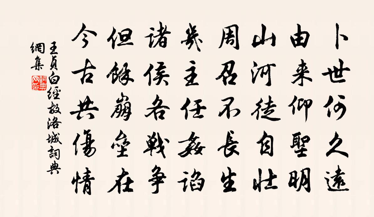 詩詞名句歷史字典書法欣賞書法字典國語詞典說文解字康熙字典古漢語字典標 題 作 者 詩 句 經故洛城作者:王貞白 朝代:唐代經故洛城原文卜世何久遠,由來仰聖明。山河徒自壯,周召不長生。幾主任奸諂,諸侯各戰爭。但余崩壘在,今古共傷情。詩詞問答問:經故洛城的作者是誰?答:王貞白問:經故洛城寫於哪個朝代?答:唐代問:經故洛城是什麼體裁?答:五律王貞白經故洛城書法欣賞經故洛城書法作品注釋全唐詩:卷701-22詩詞推薦沁園春(壽何逢原北堂)何夢桂〔宋代〕孔蓋D74B旌,月佩雲裳,人間女仙。問韶光九十,何如今待,明朝最處,好是明年。戲舞稱觴,一堂家慶,眼臘月十九日飲於周氏無盡藏雪作趙蕃〔宋代〕卯飲君家江上樓,坐中風雪暗前洲。世間矰繳無空巧,我自歸心沒白鷗。和三舍人省上蘇軾〔宋代〕紛紛榮瘁何能久,雲雨從來翻覆手。怳如一夢墮枕中,卻見三賢起江右。(曾子開、劉貢父、孔經父,皆江西人。次友人韻題墨梅李若水〔宋代〕長愛孤標似君子,不禁橫竹巧擠排。短幅離離乃遺像,至今寒蝶誤飛來。題朱氏園張耒〔宋代〕東風邀客入芳菲,夾徑吹香李萬枝。啼鳥遠聞知晝靜,好花相續得春遲。連檣東去淮天闊,綠野南環楚澤卑。客至桑婦劉駕〔唐代〕牆下桑葉盡,春蠶半未老。城南路迢迢,今日起更早。四鄰無去伴,醉臥青樓曉。妾顏不如誰,所貴守婦道。一春關山月宋構〔宋代〕關山月,關山月,千里寒光射冰雪。一聲羌管裂青雲,隴上行人腸斷絕。腸斷絕兮將奈何,為君把酒問常娥。冰輪寄吳拾遺齊己〔唐代〕新竹將誰榷重輕,皎然評里見權衡。非無苦到難搜處,合有清垂不朽名。疏雨晚沖蓮葉響,亂蟬涼抱檜梢鳴。野橋望月有懷(一作康庭芝詩,一作沈佺期詩)宋之問〔唐代〕天使下西樓,含光萬里秋。台前似掛鏡,簾外如懸鉤。張尹將眉學,班姬取扇儔。佳期應借問,為報大刀頭。馬郎婦贊釋心月〔宋代〕鏡里精神,風前調度。手執蓮經,換人腸肝。錦鱗吞釣上鉤來,黃金骨已騰空去。吏上宋祁〔宋代〕吏上重門鑰,樓喧疊鼓撾。翠沈遙嶺樹,紅斂暝叢花。杼促蟲聲急,眉拖月魄斜。煩心銷熱盡,不待鎮嘉瓜。鷓鴣天辛棄疾〔宋代〕木落山高一夜霜。北風驅雁又離行。無言每覺情懷好,不飲能令興味長。頻聚散,試思量。為誰春草夢池塘。中年出三城留別幕中三判官劉復〔唐代〕翔禽托高柯,倦客念主人。恩義有所知,四海同一身。況皆曠大姿,翰音見良辰。陳規佐武略,高視據要津。常願輞川集北垞王維〔唐代〕北垞湖水北,雜樹映朱闌。逶迤南川水,明滅青林端。題艾溪艾性夫〔宋代〕睦城西下柳陰陰,以艾名溪古到今。鼻祖桑弧蓬矢地,耳孫喬木故家心。應無別姓爭墩住,曾有高人對客吟。欲向浣溪沙(觀吳人歲旦游承天)吳文英〔宋代〕千蓋籠花鬥勝春。東風無力掃香塵。盡沿高閣步紅雲。閒里暗牽經歲恨,街頭多認舊年人。晚鐘催散又黃昏。宋君輓詞方岳〔宋代〕持家不廢夜窗書,未了功名志竟違。是處青山曾對飲,祗今白羽為誰揮。楊花亂落春無極,燕子重來人已非。手斸丹霞第二代無學視野師釋子淳〔宋代〕皎月流輝,影澄寒水。萬有齊彰,太虛廓爾,禪版曾酬上上機,當鋒未薦西來旨。寄題茶山姚勉〔宋代〕文獻風流想故家,玉川室邇已人遐。何時細賞文清竹,與客同煎陸羽茶。春日同友人游湖上釋斯植〔宋代〕十里湖邊路,垂楊映馬蹄。水光平野闊,山影繞樓低。夜雨生青草,春風濕紫泥。興來無限意,同此片時題。名句推薦與人善言,暖於布帛;傷人之言,深於矛戟。荀子《荀子·榮辱》 玉璫緘札何由達,萬里雲羅一雁飛。李商隱《春雨》 夜發清溪向三峽,思君不見下渝州。李白《峨眉山月歌》 向來冰雪凝嚴地,力斡春回竟是誰?陸游《落梅》 徒把金戈挽落暉,南冠無奈北風吹。虞集《挽文丞相》 群芳爛不收,東風落如糝歐陽修《春日西湖寄謝法曹歌》 山高月小,水落石出。蘇軾《後赤壁賦》 滄海桑田,謂世事之多變;河清海晏,兆天下之昇平。程登吉《幼學瓊林·卷一·地輿》 有弗學,學之弗能,弗措也。有弗問,問之弗知,弗措也。有弗思,思之弗得,弗措也。有弗辨,辨之弗明,弗措子思《中庸·第二十章》 一上高城萬里愁,蒹葭楊柳似汀洲。許渾《鹹陽城東樓 / 鹹陽城西樓晚眺 / 西門》