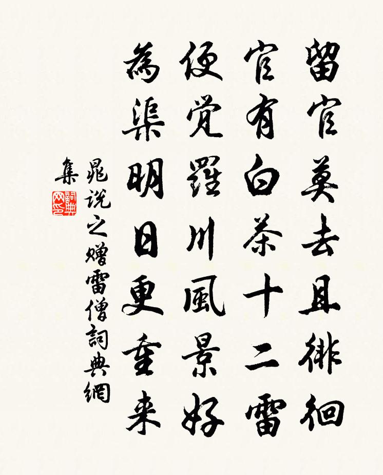 詩詞名句歷史字典書法欣賞書法字典國語詞典說文解字康熙字典古漢語字典標 題 作 者 詩 句 贈雷僧作者:晁說之 朝代:宋代贈雷僧原文留官莫去且徘徊,官有白茶十二雷。便覺羅川風景好,為渠明日更重來。詩詞問答問:贈雷僧的作者是誰?答:晁說之問:贈雷僧寫於哪個朝代?答:宋代晁說之贈雷僧書法欣賞贈雷僧書法作品詩詞推薦天淨沙·秋思馬致遠〔元代〕枯藤老樹昏鴉,小橋流水人家。古道西風瘦馬,夕陽西下,斷腸人在天涯。五洩龍井釋文珦〔宋代〕五吉蜿蜒宅,幽深父老言。傍溪唯見瀑,度嶺始知源。夾欲斜暉隱,空林夕電翻。屢聞當旱歲,噀雨出松門。贈陳高士琴歌白玉蟾〔宋代〕昨夜西風起白苹,從前湖海幾酸辛。感今懷古無限事,拄頰閒思一愴神。瓊窟先生鼓玉琴,一調一弄符我心。屈平長安言懷寄沈彬侍郎卿雲〔唐代〕故園梨嶺下,歸路接天涯。生作長安草,勝為邊地花。雁南飛不到,書北寄來賒。堪羨神仙客,青雲早致家。香林四首陳與義〔宋代〕絕愛公家花氣新,一林清露百般春。是中宴坐應容我,只恐微風喚起人。赴宣城守吳興道中張耒〔宋代〕秋野連雲靜,三吳稻熟時。風江客帆疾,晴野雁行遲。草木霜天晚,山川澤國卑。宣城不負汝,好繼謝公詩。三洪遺墨石刻汪炎昶〔宋代〕弟兄落落峙雄名,字落青珉定有靈。地下可能□□劍,人間喜似出蘭亭。為牟德范題石湖遺墨意有未盡復賦五首方回〔宋代〕日長飢雀窺鐺釜,雨過跳蛙上灶爐。莫笑曬書亡玉軸,荊州還識半人無。山花子陳子龍〔明代〕楊柳淒迷曉霧中,杏花零落五更鐘。寂寂景陽宮外月,照殘紅。 蝶化彩衣金縷盡,蟲銜畫粉玉樓空。惟有無情和余山南僉判清溪觀荷釋道璨〔宋代〕東風已老南風急,浪蕊浮花和露泣。翠袖盈盈波上來,相向美人如玉立。軒渠一笑俱動容,彼此一樣冰雪蹤。明珠朔日迎客這章諸賢多有和者使君再賦仍次韻以曹彥約〔宋代〕霜清石出水分流,邂逅騷人得志秋。落日斷霞增逸氣,小窗低戶愧英游。苦無酒量能陪飲,只有詩盟可避愁。此地咀業間新茶二絕汪炎昶〔宋代〕虜全陸羽事烹,謾自誇張立戶庭。別向人間傅一法,吾詩便把當茶經。喜友人日南回張蠙〔唐代〕南遊曾去海南涯,此去遊人不易歸。白日霧昏張夜燭,窮冬氣暖著春衣。溪荒毒鳥隨船啅,洞黑冤蛇出樹飛。重入骨相陸游〔宋代〕骨相元知薄,功名敢自期?病侵強健日,閒過聖明時。形勝輪台地,飛騰瀚海師。江湖雖萬里,猶擬綴聲詩。斑竹管筆梅堯臣〔宋代〕翠管江潭竹,斑斑紅淚滋。束毫何勁直,在橐許操持。欲寫湘靈怨,堪傳虞舜辭。蔚然君子器,安用俗人知。過雙陂楊萬里〔宋代〕霜後寒溪清更清,冰如溪水水如冰。閒行也有窮忙事,問訊梅花開未曾。乙卯十一月往鎮州元好問〔金代〕村靜鳥聲樂,山低雁影遙。野陰時滉朗,冷雨只飄蕭。涉遠心先倦,沖寒酒易消。紅塵忘南北,渺渺見長橋。過嚴瀨寄陸守務觀喻良能〔宋代〕翰墨場中老伏波,揮毫快馬下晴坡。三年睿主思獻納,千里疲民賴撫摩。瀟灑郡齋方在望,飄搖征棹未能過。擬求次韻邵公濟尋梅三首郭印〔宋代〕素艷遙憐月色同,暗香披拂有無中。一枝已覺春光破,不恨南鄰笛里風。暫住新市行次謝村二首張鎡〔宋代〕籠叢灌木繞低田,一雨催鳴爾許蟬。平日詩懷何處吐,今年秋色此行先。名句推薦世業事黃老,妙年孤隱淪宋之問《始安秋日》 酒醒人靜奈愁濃。殘燈孤枕夢,輕浪五更風。徐昌圖《臨江仙·飲散離亭西去》 真積力久則入。荀子《荀子·勸學》 歷冰霜、不變好風姿,溫如玉。陸容《滿江紅·詠竹》 多私者不義,揚言者寡信。戴聖《大戴禮記·文王官人第七十二》 窮則變,變則通,通則久。佚名《易傳·繫辭傳下·第二章》 千人之諾諾,不如一士之諤諤。司馬遷《史記·商君列傳》 野花不種年年有,煩惱無根日日生。馮夢龍《警世通言·卷二十》 鎮日思歸歸未得,孤負殷勤杜宇。王瀾《念奴嬌·避地溢江書於新亭》 長江如虹貫,蟠繞其下。宋濂《閱江樓記》