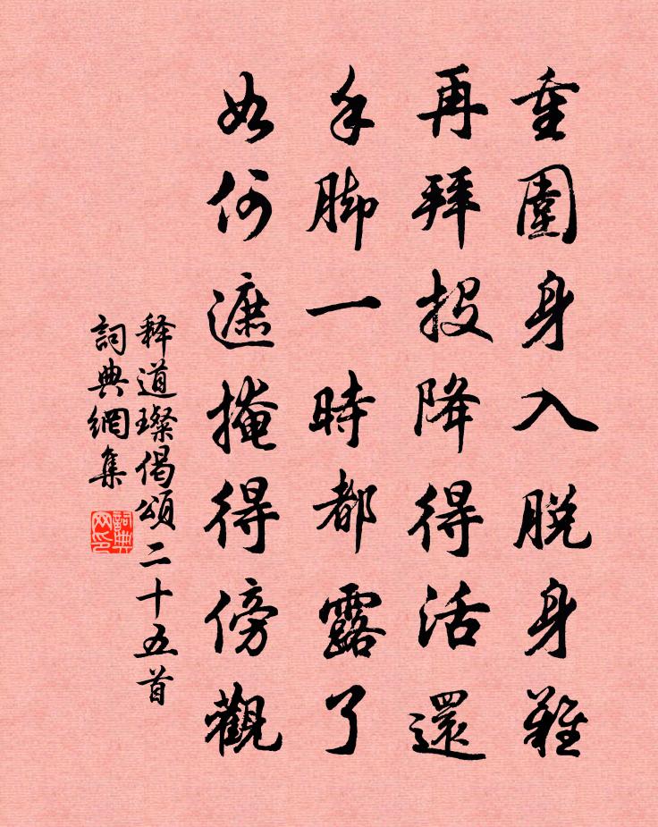 詩詞名句歷史字典書法欣賞書法字典國語詞典說文解字康熙字典古漢語字典標 題 作 者 詩 句 偈頌二十五首作者:釋道璨 朝代:宋代偈頌二十五首原文重圍身入脫身難,再拜投降得活還。手腳一時都露了,如何遮掩得傍觀。詩詞問答問:偈頌二十五首的作者是誰?答:釋道璨問:偈頌二十五首寫於哪個朝代?答:宋代釋道璨偈頌二十五首書法欣賞偈頌二十五首書法作品詩詞推薦秋山吟金朋說〔宋代〕濃淡霜林入望中,天工施巧染秋容。秋空猶勝春光好,翠葉燒丹綠樹紅。霅溪夜宴詩(湘江神歌)水神〔唐代〕渺渺煙波接九疑,幾人經此泣江蘺。年年綠水青山色,不改重華南狩時。挽王總乾父知縣衛宗武〔宋代〕蜀溪名閥世為儒,祖擢巍科子亦如。從仕為民辭薦牘,移忠有後竟懸車。一生冰櫱節愈厲,兩度弦歌政可書。菘擬和單令簡園梨花四絕胡寅〔宋代〕梅花如夢李成塵,卻伴酴醿過晚春。未要烘晴千樹白,且看帶雨一枝新。庚辰歲人日作時聞黃河已復北流老臣舊數論此蘇軾〔宋代〕老去仍棲隔海村,夢中時見作詩孫。天涯已慣逢人日,歸路猶欣過鬼門。三策已應思賈讓,孤忠終未赦虞翻。典衣贈蜀士盧石受二首劉克莊〔宋代〕井絡纏兵慘,瞿塘下棹輕。命寧一錢直,腹載五車行。姑覽無諸跡,休聽望帝聲。世無韓十八,誰識玉川生。送許守吳芾〔宋代〕千里歡謠處處同,使君遺愛信無窮。不容昏墊為民患,解轉凶荒作歲豐。治行好書循吏傳,清聲無愧古人風。九重柳初新晁端禮〔宋代〕些兒柄靶天來大。悶損也、還知麽。共伊合下、深盟厚約,比望收因結果。這好事、難成易破。到如今,彼此無那題僧壁李商隱〔唐代〕捨生求道有前蹤,乞腦剜身結願重。大去便應欺粟顆,小來兼可隱針鋒。蚌胎未滿思新桂,琥珀初成憶舊松。若信頌古七首日面佛月面佛釋慧勤〔宋代〕東街柳色拖煙雨,西巷桃華相映紅。左雇右盼看不足,一時分付與春風。端午五言三首劉克莊〔宋代〕綺紈貴家子,旗鼓少年場。屢舞眾人醉,鮮妝一國狂。避暑冷泉方岳〔宋代〕火雲散鱗甲,萬瓦如炊燖。東華車馬塵,褦襶不自禁。誰能半日閒,脫身此窺臨。百錢買漁篷,橫截南北岑。追隨成都遨樂詩二十一首五日州南門蠶市田況〔宋代〕齊民聚百貨,貿鬻貴及時。乘此耕桑前,以助農績資。物品何其夥,碎璅皆不遺。編籋列箱筥,飭木柄銻錤。備用送同年朱元直監稅馮時行〔宋代〕池上千岩入曉光,無花草木自吹香。眼隨天霽山山見,心與秋清事事涼。長嘯響驚龍壑靜,微吟思入雁雲長。未須再和二首郭印〔宋代〕涉海必假舟航,登山當尋蹊徑。每嘆修身錯路,譬如飲藥加病。逢人須是問津,有心未免擊磬。況遇先覺先知,早楊雄草玄台岑參〔唐代〕吾悲子云居,寂寞人已去。娟娟西江月,猶照草玄處。精怪喜無人,睢盱藏老樹。立春日釋文珦〔宋代〕上國又逢春,衣裳化客塵。園廬空入夢,歲月但依人。生意歸群物,窮愁老一身。喜余鷗鷺伴,猶不怪吾真。吳尉東閣西亭劉過〔宋代〕石板橋東閣,軒窗如此華。碧虛澄水鑒,紅影侵霜花。似串歌雲駐,如泥醉帽斜。但驚風露冷,飄落怕還家。普化贊釋心月〔宋代〕邈得先師真,鼻孔不相似。大悲院裡歸,驢鳴較些子。漁父詞十三首蒲壽宬〔宋代〕明月愁人夜未央,篷窗如晝水浪浪。何處笛,起淒涼。梅花噴作一天霜。名句推薦為上者疑,為下者懼。上下背德,禍必興焉。來俊臣《羅織經·事上卷第二》 松竹翠蘿寒,遲日江山暮。曹組《卜運算元·蘭》 遠水不救近火。韓非及後人《韓非子·說林上》 望極春愁,黯黯生天際。柳永《蝶戀花·佇倚危樓風細細》 多情自古傷離別,更那堪冷落清秋節!柳永《雨霖鈴·寒蟬淒切》 爭奈醒來,愁恨又依然朱淑真《江城子·賞春》 采菱人語隔秋煙,波靜如橫練。王惲《平湖樂·采菱人語隔秋煙》 信宿漁人還泛泛,清秋燕子故飛飛。杜甫《秋興八首》 天街曾醉美人畔,涼枝移插烏巾。吳文英《夜飛鵲·蔡司戶席上南花》 樹繞村莊,水滿陂塘。秦觀《行香子·樹繞村莊》