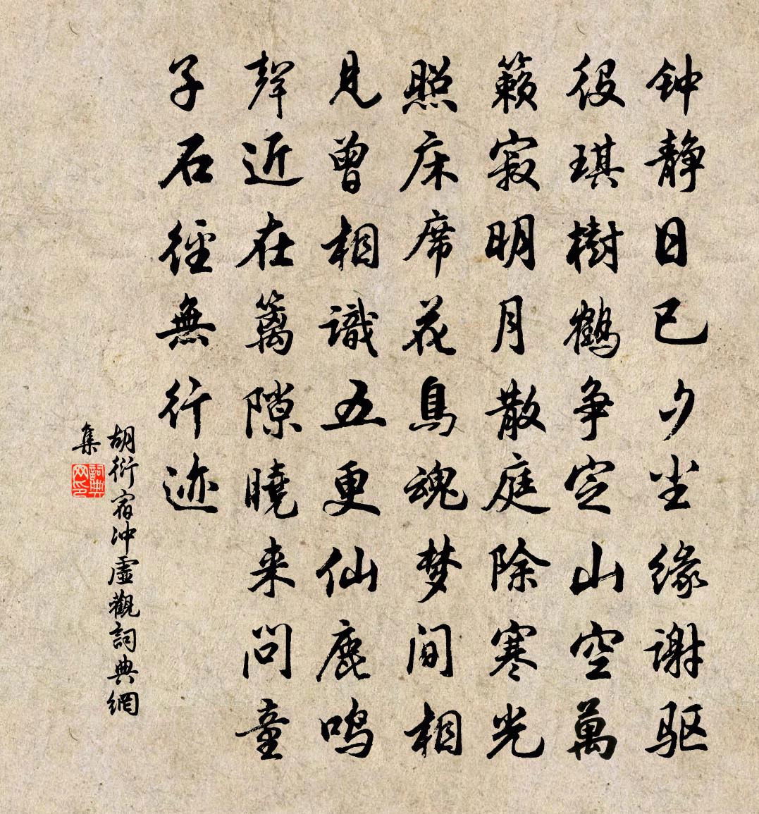 詩詞名句歷史字典書法欣賞書法字典國語詞典說文解字康熙字典古漢語字典標 題 作 者 詩 句 宿沖虛觀作者:胡衍 朝代:宋代宿沖虛觀原文鍾靜日已夕,塵緣謝驅役。琪樹鶴爭定,山空萬籟寂。明月散庭除,寒光照床蓆。花鳥魂夢間,相見曾相識。五更仙鹿鳴,聲近在籬隙。曉來問童子,石徑無行跡。詩詞問答問:宿沖虛觀的作者是誰?答:胡衍問:宿沖虛觀寫於哪個朝代?答:宋代胡衍宿沖虛觀書法欣賞宿沖虛觀書法作品詩詞推薦壽運使芹庵〔宋代〕玉節煌煌擁使星,泉流地上富全閩。光華動業知何自,鹹詠崧高降甫申。卜運算元吳潛〔宋代〕春事到西湖,處處梅花笑。抖擻長安車馬塵,眼底青山好。身世兩悠悠,歲月間中老。極目煙波萬頃愁,此意誰知送張伯起入都二首方回〔宋代〕元侯可文學,未壯冠貂蟬。之子觀光日,前修致政年。芹宮堪注擬,瓜戍尚遲延。定有群人薦,班行綴集賢。句張載〔宋代〕一目全牛萬隙開。和答斯遠因梅見屬三首趙蕃〔宋代〕君行過海門,惟復仍舊里。友朋不易得,相與況能爾。獨念吾家侄,無由從夫子。朝中措洪咨夔〔宋代〕滂葩七十二灘春。鍾瑞石麒麟。流水行雲才思,光風霽月精神。金蕉進酒,斑衣起舞,喜氣津津。群玉峰頭環佩,挽寧谷居士何公三首何夢桂〔宋代〕英雄千古入泉台,八十餘齡死更哀。隱谷雲歸龍已老,吟壇月墮鶴空回。黃花滿地詩人老,青檟成阡弔客來。白髮戲贈崔千牛劉禹錫〔唐代〕學道深山許老人,留名萬代不關身。勸君多買長安酒,南陌東城占取春。霜葉飛佚名〔宋代〕故宮秋晚餘芳盡,輕陰閒淡池閣。鳳泥銀暗玳紋花,卷斷腸簾幕。漸砌菊、遺金謝卻,芙蓉才共清霜約。半弄蕊、送江墨莊趙汝騰〔宋代〕徑坂仙翁名蓋代,得君膠法喜臨池。雞林鼠島皆知重,爾亦聲華萬古垂。洞山圖卷唐寅〔明代〕吾聞淮水出桐山,古來賢哲產其間。君令自稱亦私淑,漁釣須當借一灣。山店賣石榴取以薦酒陸游〔宋代〕山色蒼寒雲釀雪,旗亭據榻興悠哉!麴生正欲相料理,催喚風流措措來。詠史下荀彧陳普〔宋代〕亂離揀得一枝棲,得路爭知卻是迷。曹操若逢諸葛亮,暮年當作漢征西。江城子(次韻葛魯卿上元)葉夢得〔宋代〕甘泉祠殿漢離宮。五雲中。渺難窮。永漏通宵,壺矢轉金銅。曾從鈞天知帝所,孤鶴老,寄遼東。強扶衰病步龍鍾偈頌一百六十首釋宗杲〔宋代〕去年人看中秋月,今年人看中秋月。今年人是去年人,去年月是今年月。魏城逢故人 / 綿谷回寄蔡氏昆仲羅隱〔唐代〕一年兩度錦城游,前值東風后值秋。芳草有情皆礙馬,好雲無處不遮樓。山將別恨和心斷,水帶離聲入夢流。今日問天方逢辰〔宋代〕胭脂十二萬風塵,一樣胞胎父母身。天欲殺之胡至此,厥初何用降生民。畫山水扇邵清甫〔宋代〕岩脈交橫簇亂峰,顛崖懸絕隱仙翁。不須遠看連天色,盡在吾人掌握中。南鄉子·集句蘇軾〔宋代〕悵望送春懷。漸老逢春能幾回。花滿楚城愁遠別,傷懷。何況清絲急管催。吟斷望鄉台。萬里歸心獨上來。景物登望江南吳潛〔宋代〕家山好,底事尚忘歸。但我辭榮還避辱,從渠把是卻成非。跳出世關機。將五十,老相已相催。爭得氣來有甚底,名句推薦記得那年花下,深夜,初識謝娘時。韋莊《荷葉杯·記得那年花下》 五原秋草綠,胡馬一何驕。李白《塞上曲》 山川蕭條極邊土,胡騎憑陵雜風雨。高適《燕歌行》 月出驚山鳥,時鳴春澗中。王維《鳥鳴澗》 一節見則百節知矣。劉向《說苑·尊賢》 衣懶換,酒難賒。可憐此夕看梅花。吳文英《思佳客·癸卯除夜》 因風吹火,用力不多。佚名《增廣賢文·上集》 若得鼓而進於義,則吾義豈不益進哉。墨子《墨子·49章 魯問》 高或入於虛,華或入於浮,而虛浮之士,究難指為高華。王永彬《圍爐夜話·第一一O則》 為山九仞,功虧一簣。佚名《尚書·周書·旅獒》