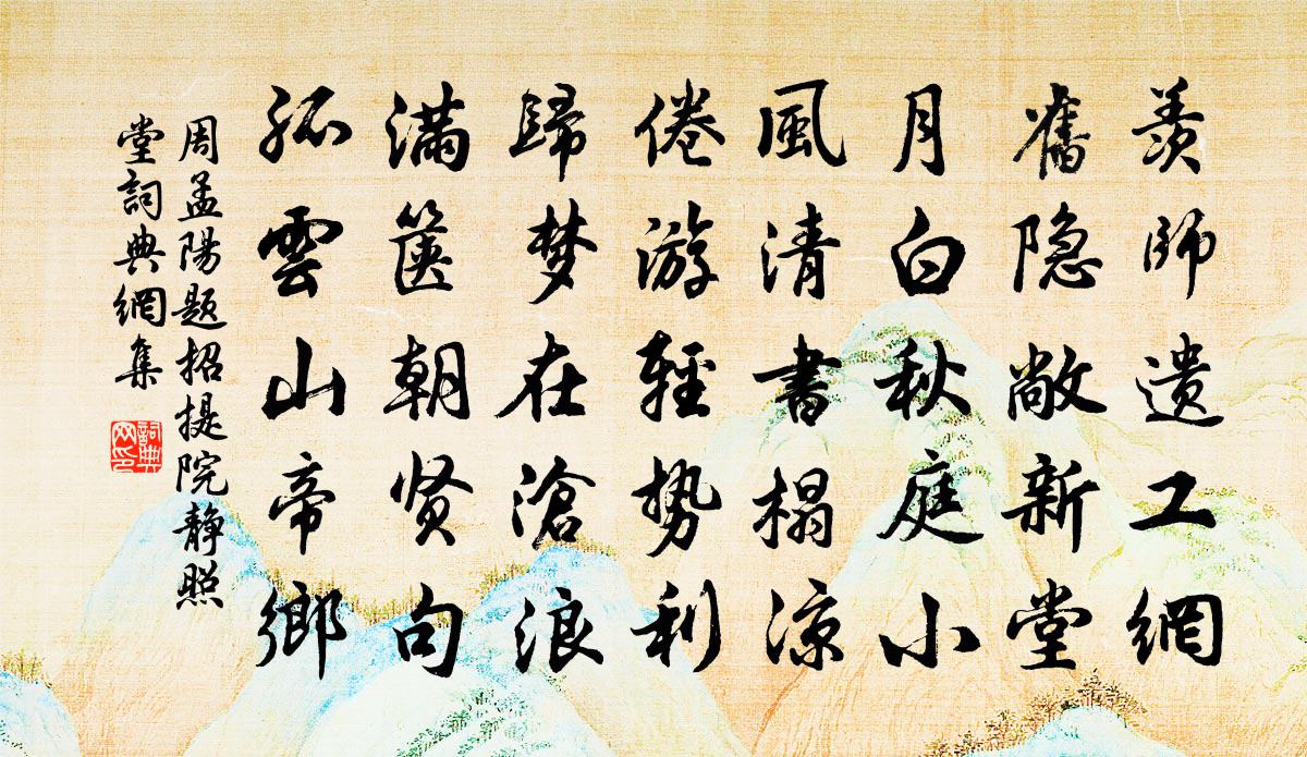 詩詞名句歷史字典書法欣賞書法字典國語詞典說文解字康熙字典古漢語字典標 題 作 者 詩 句 題招提院靜照堂作者:周孟陽 朝代:宋代題招提院靜照堂原文羨師遺工網,舊隱敞新堂。月白秋庭小,風清書榻涼。倦遊輕勢利,歸夢在滄浪。滿篋朝賢句,孤雲山帝鄉。詩詞問答問:題招提院靜照堂的作者是誰?答:周孟陽問:題招提院靜照堂寫於哪個朝代?答:宋代周孟陽題招提院靜照堂書法欣賞題招提院靜照堂書法作品詩詞推薦滿庭芳 述懷丘處機〔元代〕漂泊形骸,顛狂蹤跡,狀同不系之舟。逍遙終日,食飽恣遨遊。任使高官重祿,金魚袋、肥馬輕裘。爭知道,莊周寄子駿運使文同〔宋代〕西鄉巴嶺下,嶮道入孱顏。使騎到荒驛,野禽啼亂山。問民青靄里,訪古白雲間。幾日南城路,新詩滿軸還。舜韶新佚名〔宋代〕香滿西風,催歲晚東籬,黃花爭吐。嫩英細蕊,金艷繁、妝點高秋偏富。寒地花媒少,算自結、多情煙雨。每年年寄妻彭伉〔唐代〕莫訝相如獻賦遲,錦書誰道淚沾衣。不須化作山頭石,待我堂前折桂枝。和段季承左藏惠四絕句楊萬里〔宋代〕遮莫蟠胸書似山,更饒落筆語如泉。陰何絕倒無人怨,卻怨渠儂秘不傳。別李三元稹〔唐代〕階蓂附瑤砌,叢蘭偶芳藿。高位良有依,幽姿亦相托。鮑叔知我貧,烹葵不為薄。半面契始終,千金比然諾。人生關河道中韋莊〔唐代〕槐陌蟬聲柳市風,驛樓高倚夕陽東。往來千里路長在,聚散十年人不同。但見時光流似箭,豈知天道曲如弓。平生挽表叔趙君任安撫二首劉克莊〔宋代〕叔在兵間日,書常笑我孱。初雲機會易,晚嘆事功難。寂寞郎官省,荒涼上將壇。遙憐會稽窆,新種短松寒。賦園中所有十首蘇轍〔宋代〕室幽來客稀,塵土積不掃。鄰翁笑我拙,教我種藂草。經霜斫為簪,不讓秋竹好。始生如一毛,張王忽侵道。鉏耰真宗奉聖祖玉清昭應宮十一首真宗〔宋代〕雕俎在御,飈駕聞聲。真游斯降,旨酒斯盈。大樂雲闋,大禮雲成。徹彼常薦,罄此明誠。上馮使君五首貫休〔唐代〕撐船碧江上,春日何遲遲。汀花最深處,拾得鴛鴦兒。漁父無憂苦,水仙亦何別。眠在綠葦邊,不知釣筒發。樵叟挽中書俞侍郎二首洪咨夔〔宋代〕器重千鈞鼎,胸涵萬斛舟。文章歐六一,政事富青州。偃月知誰在,靈光獨我留。貂蟬雖未著,不作汗青羞。奉酬中書李相公早朝於中書候傳點,偶書所懷武元衡〔唐代〕寥落曙鍾斷,微明煙月沉。翠霞仙仗合,清漏掖垣深。北極星遙拱,南山闕迥臨。蘭釭竟曉焰,琪樹欲秋陰。霄漢七夕三首宋庠〔宋代〕漢家猗殿敞雲屏,青雀西來底有情。席上殘桃猶可種,劉郎爭奈不長生。次韻大受登天法塔見劉王二陵王灼〔宋代〕試縱浮圖目,閒紓客子情。軒騰超世界,指點識鄉程。天大雲欹野,江蒸氣抱城。長風饒振薄,落日倒光晶。古色曾侍郎挽章王洋〔宋代〕道盛當堯日,名高嗣聖安。人推金鼎望,帝念玉樓居。舊典尊王跡,傳家教孝書。崇文華夏事,澹泊寄情疏。尖送雲友歸行都武衍〔宋代〕落落奇男子,長年走客塵。白身無寸祿,青眼欠高人。病為思詩苦,貧緣立行真。片雷留不住,歸醉洛陽春。西塍秋日即事周密〔宋代〕絡緯聲聲織夜愁,酸風吹雨水邊樓。堤楊脆盡黃金線,城裡人家未覺秋。東園觀麥乾隆〔清代〕邇日雨實佳,今朝晴更好。麥苗即菁菁,麥穗亦矯矯。颺風披離離,邀露灩(白白白)(白白白)。十分縱未定,寄潘粹汪莘〔宋代〕夢魂何事練溪濱,起自新春向晚春。紅杏園林催百舌,綠楊洲渚薦重唇。一年好處是寒食,三月水邊多麗人。遙想名句推薦君似孤云何處歸,我似離群雁。周紫芝《卜運算元·席上送王彥猷》 香非在蕊,香非在萼,骨中香徹。晁補之《鹽角兒·亳社觀梅》 離心何以贈,自有玉壺冰。駱賓王《送別》 歡宴良宵好月,佳人修竹清風。吳文英《風入松·麓翁園堂宴客》 風吹仙袂飄颻舉,猶似霓裳羽衣舞白居易《長恨歌》 以身教者從,以言教者訟。范曄《後漢書·列傳·第五鍾離宋寒列傳》 入世冷挑紅雪去,離塵香割紫雲來。曹雪芹《訪妙玉乞紅梅》 浴不必江海,要之去垢;馬不必騏驥,要之善走。司馬遷《史記·外戚世家》 小娃撐小艇,偷采白蓮回。白居易《池上》 澹月梨花,借夢來、花邊廊廡。史達祖《解佩令·人行花塢》