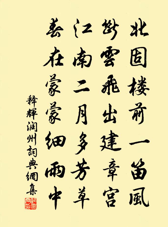詩詞名句歷史字典書法欣賞書法字典國語詞典說文解字康熙字典古漢語字典標 題 作 者 詩 句 潤州作者:釋輝 朝代:宋代潤州原文北固樓前一笛風,斷雲飛出建章宮。江南二月多芳草,春在濛濛細雨中。詩詞問答問:潤州的作者是誰?答:釋輝問:潤州寫於哪個朝代?答:宋代釋輝潤州書法欣賞潤州書法作品詩詞推薦次韻子瞻連雨江漲二首蘇轍〔宋代〕客到炎陬喜暫涼,江吹虛閣雨侵廊。回看野寺山溪隔,臥覺晨炊稻飯香。荔餉深紅陋櫻棗,桂醅淳白比琳琅。思移招東鄰白居易〔唐代〕小榼二升酒,新簟六尺床。能來夜話否,池畔欲秋涼。曉發途中張耒〔宋代〕坐無燈火夜蕭然,馬上匆匆未曉天。值驛老兵應笑我,肯將斗粟換高眠。和元絳〔宋代〕晼晚年垂盡,陰沈氣始凝。雲霄方一色,霰雪忽相仍。何處茲辰好,吾州自古稱。稽山呈刻畫,鏗水弄鮮澄。佛土送謝子肅之官吳芾〔宋代〕吾鄉人物苦雕零,賴子傳家有典刑。仕宦方期行古道,姓名早已達天庭。致君事業須先辦,涉世風霜要飽經。終不寄和水部馬郎中題興德驛,時昭義已平李商隱〔唐代〕仙郎倦去心,鄭驛暫登臨。水色瀟湘闊,沙程朔漠深。鷁舟時往復,鷗鳥恣浮沉。更想逢歸馬,悠悠岳樹陰。春晚舟行三首李彌遜〔宋代〕病眼看花似夢中,可堪紅紫半成空。一年三月春餘幾,枕上那聞昨夜風。大晟府擬撰釋奠十四首佚名〔宋代〕[太簇為徽]巍巍堂堂,其道如天。清明之象,應物而然。時維上丁,備物薦誠。維親禱典,樂諧中聲。四月末天氣陡然如秋遂御祫衣游北沙亭觀江漲黃庭堅〔宋代〕沙岸人家報急流,船官解纜正夷猶。震雷將雨度絕壑,遠水粘天吞釣舟。甚欲去揮白羽箑,可堪更著紫茸裘。平生牡羊同行五六登無盡墓入義方傳慶寺讀鍾離公洪咨夔〔宋代〕鍾離權約同燒汞,呂洞賓呼共層瓊。便合身隨笙鶴去,底須冠劍葬空塋。摸魚子 賦雞冠花,用明初韻許有壬〔元代〕笑山人木雞心事,年來斂*藏距。幽花細草聊娛目,小圃更無閒土。膏澤溥。豈天為司晨,偏與鍾奇古。無人起舞贈僧陸游〔宋代〕松間數語淡交成,不喜將身世上行。安得北窗風雪夜,地爐相對煮蕪菁?題披雲亭釋紹曇〔宋代〕大地黑漫漫,日月久韜□。山藤聊一揮,神與境相會。八紘淨無塵,萬象鏡中翳。天外出頭看,笑擘闌乾碎。次韻閻仲甫郎中病起二首二晁補之〔宋代〕脫略軒裳陶隱居,肘書百卷事寧軀。茯苓日長東山澀,早晚柴車命僕夫。楊武恭王輓詞樓鑰〔宋代〕歷數中興將,誰為第一功。兩朝忠衛上,四海雅推公。富貴無危溢,哀榮有始終。吾知尚遺恨,不見朔庭空。東林寺張至龍〔宋代〕滿院香風乍熟楂,猴孫抱子坐枯槎。頭陀不慣迎賓客,自折芙蓉供釋迦。奉和春日玩雪應制宋之問〔唐代〕北闕彤雲掩曙霞,東風吹雪舞山家。瓊章定少千人和,銀樹長芳六出花。對雪杜甫〔唐代〕北雪犯長沙,胡云冷萬家。隨風且間葉,帶雨不成花。金錯囊從罄,銀壺酒易賒。無人竭浮蟻,有待至昏鴉。鈷鉧潭西小丘記柳宗元〔唐代〕得西山後八日,尋山口西北道二百步,又得鈷鉧潭。西二十五步,當湍而浚者為魚梁。梁之上有丘焉,生竹樹。其至上高邑阮閱〔宋代〕上蔡人歸古縣封,蜀江依舊水流東。末山雲散庵猶在,敖嶺丹成井已空。名句推薦魚澤灘頭嘶獵馬,省嵬城畔看黃河。石茂華《九月九日登長城關》 諸侯之寶三:土地、人民、政事。寶珠玉者,殃必及身。孟子《孟子·盡心章句下·第二十八節》 千載休談南渡錯,當時自怕中原復。文徵明《滿江紅·拂拭殘碑》 飛花兩岸照船紅,百里榆堤半日風。陳與義《襄邑道中》 把君詩卷燈前讀, 詩盡燈殘天未明。白居易《舟中讀元九詩》 劍外忽傳收薊北,初聞涕淚滿衣裳。杜甫《聞官軍收河南河北》 金陵子弟來相送,欲行不行各盡觴。李白《金陵酒肆留別》 有誰知我此時情,枕前淚共階前雨,隔個窗兒滴到明。聶勝瓊《鷓鴣天·別情》 白日麗飛甍,參差皆可見。謝朓《晚登三山還望京邑》 一寸相思千萬緒。人間沒個安排處。李冠《蝶戀花·春暮》