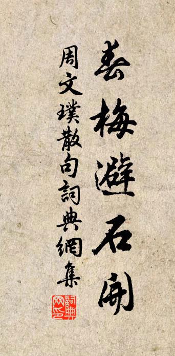詩詞名句歷史字典書法欣賞書法字典國語詞典說文解字康熙字典古漢語字典標 題 作 者 詩 句 句作者:周文璞 朝代:宋代句原文春梅避石開。詩詞問答問:句的作者是誰?答:周文璞問:句寫於哪個朝代?答:宋代周文璞句書法欣賞句書法作品詩詞推薦次仲甄韻二首李流謙〔宋代〕大用不堅壁,等閒憂患侵。平生知學道,萬事付無心。露莧鋤晨甲,煙篁步夕陰。陶然宇宙內,魚鳥聽浮沈。次韻君俞三詩時在山下李復〔宋代〕流水會大壑,層岑出遙林。結茅窮窈窱,細路下嶔崟。風露浩滿野,默坐掩孤衾。孤衾無與寫,秋色日向深。嚴州瀟灑亭趙師秀〔宋代〕高榭出禪關,人家向下看。千峰春隔霧,數里夜聞灘。偶至因成宿,前游亦值寒。州人多有詠,何不見方乾。定風波(自和)辛棄疾〔宋代〕金印累累佩陸離。河梁更賦斷腸詩。莫擁旌旗真箇去。何處。玉堂元自要論思。且約風流三學士。同醉。春風看試仙居樓白玉蟾〔宋代〕萬籟沉沉清夜闌,樓前獨自倚欄乾。金雞叫罷松風動,三十六天秋月寒。書事二首劉克莊〔宋代〕黃旗旁午責軍需,括匠搜船遍里閭。士稚去時無鎧仗,武候屯處有儲胥。粟空都內憂難繼,甲出民間策恐疏。昔補余過溫泉壁上有詩云直待眾生總無垢我方清冷蘇軾〔宋代〕石龍有口口無根,自在流泉誰吐吞。若信眾生本無垢,此泉何處覓寒溫。菩薩蠻(十一之四)賀鑄〔宋代〕綠窗殘夢聞鶗鴂。曲屏映枕春山疊。梳□發如蟬。鏡生波上蓮。絳裙金縷褶。學舞腰肢怯。簾下小憑肩。與人雙翠菩薩蠻呂本中〔宋代〕高樓只在斜陽里。春風淡盪人聲喜。攜客不嫌頻。使君如酒醇。花光人不會。月色須君醉。月色與花光。共成今夜感興利登〔宋代〕寂寂臥空晝,憂懷忽無端。攬衣亂西澗,復此凌西山。春事已無多,半消霜霰間。狂風更甚雨,時蔽江南天。寒草古興趙氏〔唐代〕鬱蒸夏將半,暑氣扇飛閣。驟雨滿空來,當軒卷羅幕。度雲開夕霽,宇宙何清廓。明月流素光,輕風換炎鑠。孤鸞次韻答曾司法張鎡〔宋代〕精神由日就,格律忌雷同。我匪從它入,君應自此工。多岐憐世路,力學振家風。莫易朱弦絕,各年論最公。下水船(和季良瓊花)晁補之〔宋代〕百紫千紅翠。唯有瓊花特異。便是當年,唐昌觀中玉蕊。尚記得、月里仙人來賞,明日喧傳都市。甚時又,分與揚已亥雜詩 286龔自珍〔清代〕少年奇氣稱才華,登岱還浮八月搓。我過東方亦無負,清尊三宿孔融家。信口十絕李流謙〔宋代〕細雨蕭蕭懶出門,爐薰消盡有餘溫。案頭不著閒文字,時把楞嚴信手翻。梵隆大師乞詩隆能琴阮為鼓數行韓元吉〔宋代〕扁舟望涵山,一塔白雲里。東西互迎送,目盡三十里。下有布金園,軒窗面流水。上人富願力,物物盡經始。莊嚴午窗遣興,家人謀過石湖范成大〔宋代〕雲日初收破柱雷,小窗坐穩興悠哉!熏爐花氣朝酲解,茶鼎松風午夢回。謝客門闌風動竹,惜春時節雨肥梅。畫船太常引丘崈〔宋代〕憎人虎豹守天關。嗟蜀道、十分難。說與沐猴冠。這富貴、於人怎謾。忘形尊俎,能言桃李,日日在東山。不醉有江樓會飲對月趙汝鐩〔宋代〕層樓畫棟凌霄漢,檻外江流百頃清。無一片雲但秋色,放千里月到天明。喚舟撒網鮮鱗美,擊鼓喧汀宿鷺驚。坐上和子野郊居見寄仇遠〔宋代〕知君標格眼前稀,暫別令人入夢思。鋏有可彈何必嘆,書如肯借本非痴。且看平子歸田賦,更和淵明述酒詩。我勸名句推薦借得山東煙水寨,來買鳳城春色施耐庵《念奴嬌·天南地北》 蕭蕭江上荻花秋,做弄許多愁。賀鑄《眼兒媚·蕭蕭江上荻花秋》 出耒在明晨,山寒易霜霰。王守仁《謫居糧絕請學於農將田南山詠言寄懷》 戚施不可使仰左丘明《國語·晉語·胥臣論教誨之力》 若為化得身千億,散上峰頭望故鄉。柳宗元《與浩初上人同看山寄京華親故》 日暮飛鴉集,滿山蕎麥花。溫庭筠《題盧處士山居 / 處士盧岵山居》 人之忌,在好為人師。孟子《孟子·離婁章句上·第二十三節》 野曠天清無戰聲,四萬義軍同日死。杜甫《悲陳陶》 水調數聲持酒聽。午醉醒來愁未醒。張先《天仙子·水調數聲持酒聽》 北風利如劍,布絮不蔽身。白居易《村居苦寒》