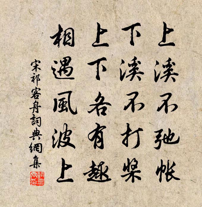 詩詞名句歷史字典書法欣賞書法字典國語詞典說文解字康熙字典古漢語字典標 題 作 者 詩 句 客舟作者:宋祁 朝代:宋代客舟原文上溪不弛帳,下溪不打槳。上下各有趣,相遇風波上。詩詞問答問:客舟的作者是誰?答:宋祁問:客舟寫於哪個朝代?答:宋代問:宋祁的名句有哪些?答:宋祁名句大全宋祁客舟書法欣賞客舟書法作品詩詞推薦次韻行甫小集平山方岳〔宋代〕客愁聊以酒防閒,非復春風桃李顏。北望未忘諸老在,中興已是百年間。非無煙雨無奇語,自有乾坤有此山。楊柳王獻之洛神賦帖贊岳珂〔宋代〕慶雲絢彩,河漢縈之。列星垂天,日月明之。先民授能,維聖成之。英英後先,疇其勝之。有晉大令,父而兄之。羅子琳來就廣漕試予以檄出至西江峽口懷古感曾豐〔宋代〕自朝連夕去,由海入江來。紫石岩前出,青山峽外開。秦貪徒郡縣,粵僭強樓台。陸賈嚴夫子,千年一倚桅。李相公餉建溪新茗奉寄曾幾〔宋代〕一書說盡故人情,閩嶺春風入戶庭。碾處曾看眉上白,分時為見眼中青。飯羹正晝成空洞,枕簟通宵失杳冥。無奈岳廟齋宮與崔伯憲都官王正甫殿丞飲別二君各強至〔宋代〕鄉人分散幾流萍,長樂坡頭已涕零。太華相逢聊永日,故交漸少似殘星。別杯猶恨樽前緩,詩筆那容席上停。車馬游天竺二首仇遠〔宋代〕行遍山巔又水涯,尚無紅葉與黃花。長松夾道六七里,小墅通村十數家。竺國雲深僧寂寞,草堂洞古石嵯牙。野翁約同僚游佳陰馮伯規〔宋代〕晚霽青山無處逃,秋來乘興便登高。□君欲暮休催去,小驛依然□嫩醪。頌古二十五首釋崇岳〔宋代〕雲門小廝兒,作大獅子吼。鼻孔得半邊,不知失卻口。有感二首許月卿六〔宋代〕晴明佳思吟難盡,雨雪愁寒撥不開。天地中間許多事,不應暑往不寒來。送陳待制自富沙移守京口曾豐〔宋代〕殿上舊開醫國口,閩中新出活人手。亘野桑麻水旱余,連村煙火兵戈後。飢得以食寒得衣,召為之父杜為母。公為送蔡子驤用蔡子駿韻秦觀〔宋代〕越絕山川遠相屬,萬壑千岩抱青綠。臥龍一峰稱是奇,遶趾清漪如帶束。鏡水春生鶂尾銜,稽山日暮猿聲續。三休黃經洞胡融〔宋代〕平生山水癖,遐往心獨歖。採秀凌丹丘,忽遇白雲子。腰劍蒼龍活,野袂青霞起。邀我石洞行,共坐啗石髓。架有句齊唐〔宋代〕飛棟新成蘸碧軒,會稽山腳照湖邊。賀周益公歸休尹直卿〔宋代〕六一先生薄吉州,歸田去作穎昌游。我公不向螺江住,羞殺青原白鷺洲。次張唐公韻王安石〔宋代〕憶昨同追八馬蹄,約公投老此山棲。公乘白鳳今何處,我適新年值白雞。夢回舒岳祥〔宋代〕月上芙蓉浦,船依杜若洲。歲行人冉冉,川永夢悠悠。天地回青眼,江山養白頭。老生如朽木,安識有悲秋。次韻鄧正字慎思秋日同文館九首晁補之〔宋代〕前世諸生選,平居數路開。鄉閭自相與,岩穴亦時來。射雉空亡矢,為蛇更奪杯。千金曾市骨,聊用作龍媒。悶歌行十二首楊萬里〔宋代〕山行舊路不堪重,及泛湖波又阻風。世上舟車無一穩,乾坤可是剩詩翁?和子瞻新居欲成二首蘇轍〔宋代〕老罷子卿還屬國,功成定遠恨陽關。漂流豈必風波際,顛沛何妨枕席間。伏臘便應隨俚俗,室廬聞似勝家山。因緣野庵曲沈瀛〔宋代〕野叟最昏迷。嘆世間、光陰奔走如馳。逢這閒時。忽尋忖、一生里事都非。從頭到尾。都改了、重立根基。枕上披名句推薦祖宗雖遠,祭祀不可不誠;子孫雖愚,經書不可不讀。朱柏廬《朱子家訓·全文》 春山煙欲收,天淡星稀小牛希濟《生查子·春山煙欲收》 奸巧語,穢污詞。市井氣,切戒之。李毓秀《弟子規·信》 勝敗兵家事不期,包羞忍恥是男兒。杜牧《題烏江亭》 傷心秦漢經行處,宮闕萬間都做了土。張養浩《山坡羊·潼關懷古》 細數十年事,十處過中秋。范成大《水調歌頭·細數十年事》 桃李不言,下自成蹊;道旁苦李,為人所棄。程登吉《幼學瓊林·卷四·花木》 新寒中酒敲窗雨,殘香細裊秋情緒。納蘭性德《菩薩蠻·新寒中酒敲窗雨》 坐開桑落酒,來把菊花枝。杜甫《九日楊奉先會白水崔明府》 灞原風雨定,晚見雁行頻。馬戴《灞上秋居》