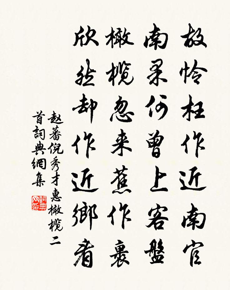 詩詞名句歷史字典書法欣賞書法字典國語詞典說文解字康熙字典古漢語字典標 題 作 者 詩 句 倪秀才惠橄欖二首作者:趙蕃 朝代:宋代倪秀才惠橄欖二首原文故憐枉作近南官,南果何曾上客盤。橄欖忽來蕉作裹,欣然卻作近鄉看。詩詞問答問:倪秀才惠橄欖二首的作者是誰?答:趙蕃問:倪秀才惠橄欖二首寫於哪個朝代?答:宋代趙蕃倪秀才惠橄欖二首書法欣賞倪秀才惠橄欖二首書法作品詩詞推薦西湖雜詩 之六沈曾植〔清代〕石罅苔花朱不枯,空岩乳水靜舂揄。楓林一葉吊霜艷,竹翠萬梢矜雪腴。黃天谷贈詩次韻二首劉克莊〔宋代〕浪跡遍齊州,曾從劍俠游。尚嫌秦政臭,肯要郅支頭。客禮朝三殿,兒嬉弄五侯。吾猶看不破,何況道家流。南湖春泛有客自北至說友人岑元…敘相思之志以寄焉皎然〔唐代〕故人隔楚水,日夕望芳洲。春草思眇眇,征雲暮悠悠。心期無形影,跡曠成阻修。有客江上至,知君佐雄州。鏗鏘雜記十首劉克莊〔宋代〕養成河北賊,挑致海東夷。空國坐朋字,亂華由黨碑。裴如晦自河陽至同韓玉汝謁之梅堯臣〔宋代〕朝聞單騎歸,徑走至其第。扣門童僕頑,拒我色甚戾。不顧遂登堂,有馬堂下系。辨詐大呼卿,稍應西屋際。逡巡三月四日驟暖范成大〔宋代〕日腳融晴晚氣暄,睡余初覺薄羅便。如何柳絮沾泥處,暖似槐陰轉午天。山庵胡仲弓〔宋代〕 * 清夜話,吟鬢任鬅鬙。瀹茗遲留客,焚香靜對僧。嵐蒸侵硯版,月冷逼禪燈。萬籟俱岑寂,呼童年亦不膺。行次穎州聞張甥宗亮不捷鄉薦以詩唁而迎之梅堯臣〔宋代〕風前汝 * ,雨冷江南書。始嘆與意異,何慚定監疏。但能存楚玉,切莫道黔驢。不負當時約,馳迎一乘車。壽范漕吳泳〔宋代〕自從繡紱解麒麟,一片忠誠只為民。涪水竹枝秋送客,漢嘉火樹夜迎神。玄蜂赤螘三垂靜,白黍黃雞萬井春。盡使採蓮詞儲光羲〔唐代〕淺渚荇花繁,深潭菱葉疏。獨往方自得,恥邀淇上姝。廣江無術阡,大澤絕方隅。浪中海童語,流下鮫人居。春雁臨江仙 壽高伯川王旭〔元代〕*莢生三秋八月,氣*風露清明。誕來人世作豪英。性天元廣大,心地盡寬平。書院興秋誰得似,燕山竇氏齊名。點絳唇張掄〔宋代〕陽氣初生,萬花潛動根荄暖。暗藏芳艷。未許東君見。恰似溫溫,鉛鼎丹初轉。功猶淺。九回烹煉。日月光華滿。答李先生韓維〔宋代〕眾人張眼,我視明明。眾人開口,我笑泠泠。百姓不我知,我與同醉醒。惟有北庵李家老,足智解語通人情。恐物水龍吟李昴英〔宋代〕碧潭花新漲浮花,柳花陰稠綠波花痕膩。一花聲雷鼓,半空雪浪,雙龍驚起。氣壓鯨鯢,怒掀鱗鬣,擘開煙水。算荊公墓范成大〔宋代〕本意治功徙木,何心黨禍揚塵。報讎豈教行劫,作俑翻成害仁。霅山和丹岩晚春韻衛宗武〔宋代〕疊疊青山疊疊林,風松石澗自成琴。箇中迥與世塵隔,試問入山深未深。送劉半千平陽簿歐陽修〔宋代〕嶺梅歸驛路迢迢,越鳥巢傾木半喬。松徑就荒聊 * ,桂叢留隱定相招。家庭噪鵲爭喧樹,夜帳驚猿自擁條。何處句丁謂〔宋代〕戴歸雙彩勝,就賜五辛盤。送羅永年西歸二首楊萬里〔宋代〕誰遣文章太驚俗,何緣場屋不遣才。南溪鷗鷺如相問,為報春吟費麝煤。頌古十首釋法薰〔宋代〕百千諸佛在何居,黃鶴樓詩錦不如。問汝秀才題也未,一篇題取莫躊躇。名句推薦惟順於父母,可以解憂。孟子《孟子·萬章章句上·第一節》 長江千里,煙淡水雲闊。李綱《六么令·次韻和賀方回金陵懷古鄱陽席上作》 江南自是離愁苦,況游驄古道,歸雁平沙。王沂孫《高陽台·和周草窗寄越中諸友韻》 君子務修其內而讓之於外。荀子《荀子·儒效》 萬歲山前珠翠繞,蓬壺殿里笙歌作岳飛《滿江紅·登黃鶴樓有感》 金柳搖風樹樹,系彩舫龍舟遙岸。柳永《破陣樂·露花倒影》 今夜送歸燈火冷,河塘,墮淚羊公卻姓楊。蘇軾《南鄉子·和楊元素時移守密州》 山中無甲子,寒盡不知年。吳承恩《西遊記·第一回》 諂諛在側,善議障塞,則國危矣。墨子《墨子·01章 親士》 蒼旻霽涼雨,石路無飛塵。岑參《暮秋山行》