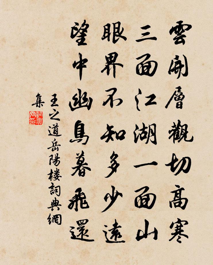 詩詞名句歷史字典書法欣賞書法字典國語詞典說文解字康熙字典古漢語字典標 題 作 者 詩 句 岳陽樓作者:王之道 朝代:宋代岳陽樓原文雲開層觀切高寒,三面江湖一面山。眼界不知多少遠,望中幽鳥暮飛還。詩詞問答問:岳陽樓的作者是誰?答:王之道問:岳陽樓寫於哪個朝代?答:宋代王之道岳陽樓書法欣賞岳陽樓書法作品詩詞推薦悼鶴皮日休〔唐代〕莫怪朝來淚滿衣,墜毛猶傍水花飛。遼東舊事今千古,卻向人間葬令威。採蓮曲白居易〔唐代〕菱葉縈波荷颭風,荷花深處小舟通。逢郎欲語低頭笑,碧玉搔頭落水中。和呂子梅題陳倅窗前新栽竹二首王之道〔宋代〕封殖要當同種玉,翱翔端復見停鸞。此君不是塵中物,豈減樊川十萬竿。句佚名〔唐代〕地甃如拳石,溪橫似葉舟。(駱浚春日,見《語林》)和劉後村梅花百詠方蒙仲〔宋代〕驛處徘徊磴處緣,任教人喚作梅顛。賒它陸凱二十字,喚起杜陵三百年。孟子憂憂喜喜陳普〔宋代〕骨肉真情出不期,捐階蓋井我何知。風埃滿目間來往,天性曾無一點疵。句張窈窕〔唐代〕滿院花飛人不到,含 * 語燕雙雙。新市道中張鎡〔宋代〕野晴天碧共溪長,畫樣飛來白鳥雙。舟小不禁風罨岸,菰蒲無數入篷窗。歸田詩庾信〔南北朝〕務農勤九榖。歸來嘉一廛。穿渠移水碓。燒棘起山田。樹陰逢歇馬。魚潭見酒船。苦李無人摘。秋瓜不直錢。社雞喜遷鶯·晉師勝淝上李綱〔宋代〕長江千里。限南北、雪浪雲濤無際。天險難逾,人謀克壯,索虜豈能吞噬。阿堅百萬南牧,倏忽長驅吾地。破強敵寄陳伯璣金陵王士禎〔清代〕東風作意吹楊柳,綠到蕪城第幾橋?欲折一枝寄相憶,隔江殘笛雨蕭蕭。水調歌頭(送唯齊之官回舟松江賦)葛郯〔宋代〕年來慣行役,楚尾又吳頭。餐霞吸露,何事佳處輒遲留。雲聽漁舟夜唱,花落牧童橫笛,占盡五湖秋。胡床興不淺榴皮題壁孫子光〔宋代〕黃鶴樓中吹笛罷,洞庭湖畔醉吟餘。劍光如寶無人識,卻記榴皮幾字書。隨州沙溪黃載〔宋代〕石路崎嶇石瀨鳴,峰巒回合小原平。桑麻積雨肥春壠,雞犬一村喧晝晴。田婦共攜中飯去,樵童相喚上山聲。邊頭蟲豸詩。蜘蛛(三首)元稹〔唐代〕蜘蛛天下足,巴蜀就中多。縫隙容長踦,虛空織橫羅。縈纏傷竹柏,吞噬及蟲蛾。為送佳人喜,珠櫳無奈何。網密初過漢江佚名〔唐代〕襄陽好向峴亭看,人物蕭條值歲闌。為報習家多置酒,夜來風雪過江寒。黃鳥佚名〔先秦〕交交黃鳥,止於棘。誰從穆公?子車奄息。維此奄息,百夫之特。臨其穴,惴惴其栗。彼蒼者天,殲我良人!如可醉落魄/一斛珠胡銓〔宋代〕百年強半。高秋猶在天南畔。幽懷已被黃花亂。更恨銀蟾,故向愁人滿。招呼詩酒顛狂伴。羽觴到手判無算。浩歌贈嶺上梅蘇軾〔宋代〕梅花開盡百花開,過盡行人君不來。不趁青梅嘗煮酒,要看細雨熟黃梅。夜會洪方叔強至〔宋代〕別杯曾破菊花期,今夕相逢菊又衰。宦路經年能會合,人生何處免參差。漸驚老態侵常日,猶喜交情似舊時。一笑名句推薦得成比目何辭死,願作鴛鴦不羨仙。盧照鄰《長安古意》 治民者,禁奸於未萌。韓非及後人《韓非子·心度》 一種青山秋草里,路人唯拜漢文陵許渾《途經秦始皇墓》 木謂之華,草謂之榮。佚名《爾雅·釋草》 天門中斷楚江開,碧水東流至此回。李白《望天門山》 有不忍言之心,必有不忍言之禍。王永彬《圍爐夜話·第一三O則》 珍重主人心,酒深情亦深。韋莊《菩薩蠻·勸君今夜須沈醉》 人之生不能無群荀子《荀子·富國》 眾人皆有以,而我獨頑似鄙。老子《老子·道經·第二十章》 客子光陰詩卷里,杏花訊息雨聲中。陳與義《懷天經智老因訪之》