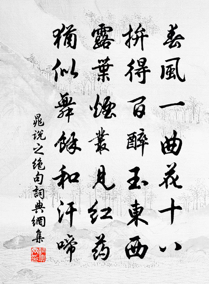 詩詞名句歷史字典書法欣賞書法字典國語詞典說文解字康熙字典古漢語字典標 題 作 者 詩 句 絕句作者:晁說之 朝代:宋代絕句原文春風一曲花十八,拚得百醉玉東西。露葉煙叢見紅藥,猶似舞余和汗啼。詩詞問答問:絕句的作者是誰?答:晁說之問:絕句寫於哪個朝代?答:宋代晁說之絕句書法欣賞絕句書法作品詩詞推薦勸飲酒張祜〔唐代〕燒得硫黃漫學仙,未勝長付酒家錢。竇常不吃齊推樂,卻在人間八十年。戲呈趙舜臣覓酒二首姜特立〔宋代〕兵廚釀乏吻生煙,阮校如今作贅員。卻怪淵明便歸去,酒材猶自有圭田。都城初秋和趙京府朱浚〔宋代〕暑夢蟲蟲似醉中,片雲挾雨過長空。不知秋色來多少,分數暖涼卜晚風。自立秋前病過白露猶未平遣懷陸游〔宋代〕飢能堅志節,病可養精神。不動成羆臥,微勞學鳥伸。功名知幻境,憂患笑前身。藥裹吾何厭,秋燈作夢新。次韻西山洪咨夔〔宋代〕山深莫道得春遲,雲漏晴光已大奇。夾徑幽香吹艾納,隔林絕艷點燕支。一川遠近迷漁屋,兩市東西認酒旗。錦野睡足宋庠〔宋代〕府廨寥寥似野廬,晏眠猶厭閣鈴呼。不知雲夢澤南日,得似富平津北無。舟中作陸游〔宋代〕東浦菰蒲合,南莊桑柘繁。潮生無斷港,寺廢有頹垣。糴米尋山步,移舟泊水村。野人多舊識,相對兩無言。梅花喜神譜欲開八枝宋伯仁〔宋代〕蠻觸國誰雄,戰爭猶未息。由此奪虛名,費盡人間力。蘇幕遮 看送孝馬鈺〔元代〕有微言,深可說。兔死孤悲,傷類聲淒切。人見人亡寧喜悅。大限來時,莫也無分別。願回頭,搜秘訣。猛舍家緣憶昔吳芾〔宋代〕憶昔從吾友,茲焉事筆耕。螢窗秋夜短,蓮社晚風清。亂後成陳跡,重來愴故情。惟余雲水客,依舊戲長鯨。贈申長官方乾〔唐代〕言下隨機見物情,看看獄路草還生。旅人莫怪無魚食,直為寒江水至清。緣識宋太宗〔宋代〕還知受氣稟天然,百法以方為事理全。假合都來歸至道,修持遠大更通玄。二儀交感成祥感瑞,八卦剛柔被俗牽。睡覺范成大〔宋代〕尋思斷夢半瞢騰,漸見天窗紙瓦明。宿鳥噪群穿竹去,縣前猶自打殘更。惜紅衣·吳興荷花姜夔〔宋代〕枕簟邀涼,琴書換日,睡余無力。細灑冰泉,並刀破甘碧。牆頭喚酒,誰問訊、城南詩客。岑寂,高柳晚蟬,說西和疊山送淮安士友韻王奕〔宋代〕金台去棹倚雲開,和餞諸詩已罄懷。行計竟為尊魯出,櫓聲相逐過江來。定逢歸旆榮桑里,豈料危機伏茗杯。願梓送梵才吉上人歸天台梅堯臣〔宋代〕頃余游鞏洛,值子入天台。當時群卿士,共羨出氛埃。荏苒逾一紀,卻向人間來。問子何為爾,言興般若台。雖將性地頌張伯端〔宋代〕佛性非同異,千燈共一光。增之寧解溢,減著且無傷。取捨皆為過,焚漂總不妨。見聞知覺法,無一可猜量。九日宴張諤〔唐代〕秋葉風吹黃颯颯,晴雲日照白鱗鱗。歸來得問茱萸女,今日登高醉幾人。戲韓子師韓元吉〔宋代〕讀餅堂前餅霜月明,讀餅堂後霜風聲。主人讀餅已萬卷,足踏省戶還專城。朅來掩關臥不出,左擁韋編右瑤瑟。似送李講主還維揚強至〔宋代〕定憶婆娑樹,雙垂滿地陰。春風吹社燕,歸意逐淮禽。帆落橫江盡,門開小院深。先撾 * 鼓,續震海潮音。名句推薦日暮東風怨啼鳥,落花猶似墜樓人。杜牧《金谷園》 秋風蕭瑟,洪波湧起。曹操《觀滄海 / 碣石篇》 愛人者人恆愛之,敬人者人恆敬之。孟子《孟子·離婁章句下·第二十八節》 王孫莫把比蓬蒿,九日枝枝近鬢毛。鄭谷《菊》 見碧水丹山,黃蘆苦竹。宋江《滿江紅·喜遇重陽》 世有伯樂,然後有千里馬。千里馬常有,而伯樂不常有。韓愈《雜說四·馬說》 燕子不歸春事晚,一汀煙雨杏花寒。戴叔倫《蘇溪亭》 卻看妻子愁何在,漫捲詩書喜欲狂杜甫《聞官軍收河南河北》 人一能之,己百之。人十能之,己千之。子思《中庸·第二十章》 不見去年人,淚濕春衫袖。歐陽修《生查子·元夕》