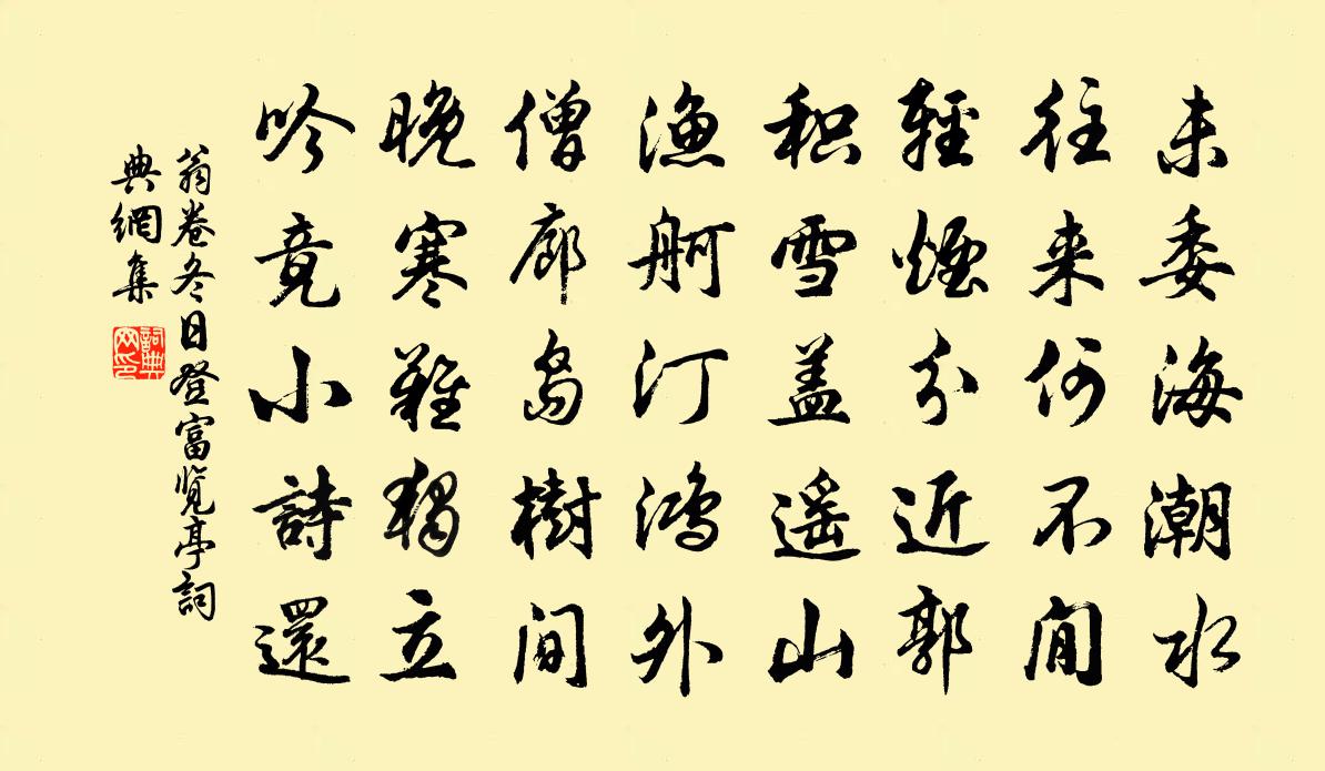 詩詞名句歷史字典書法欣賞書法字典國語詞典說文解字康熙字典古漢語字典標 題 作 者 詩 句 冬日登富覽亭作者:翁卷 朝代:宋代冬日登富覽亭原文未委海潮水,往來何不閒。輕煙分近郭,積雪蓋遙山。漁舸汀鴻外,僧廊島樹間。晚寒難獨立,吟竟小詩還。詩詞問答問:冬日登富覽亭的作者是誰?答:翁卷問:冬日登富覽亭寫於哪個朝代?答:宋代翁卷冬日登富覽亭書法欣賞冬日登富覽亭書法作品詩詞推薦詠史上子思陳普〔宋代〕俎豆迂疏仁義遲。上傳下授統如絲。薦才莫訝非家法,救世寧無爛額時。樂府新詩徐凝〔唐代〕一聲盧女十三弦,早嫁城西好少年。不羨越溪歌者苦,採蓮歸去綠窗眠。答孫顯世詩陸雲〔魏晉〕一邈矣上祖。垂休萬葉。廣問弘被。崇軌峻躡。高山克荒。大川利涉。繁茲惟祜。風連雲接。二大人有作。二後利雜曲歌辭。竹枝李涉〔唐代〕荊門灘急水潺潺,兩岸猿啼煙滿山。渡頭年少應官去,月落西陵望不還。巫峽雲開神女祠,綠潭紅樹影參差。下牢和魯如晦春日過定遠山口王之道〔宋代〕雨足塍塍水,春晴處處花。畏塗雙只堠,荒戍兩三家。心折朝鳴鹿,魂驚暮集鴉。想君行役苦,愁蹙不成嗟。游梅山寺楊侃〔宋代〕出郭塵路斷,登舟鷲嶺通。樓台花嶼上,鍾梵水天中。石磴班春蘚,松門韻晚風。蒪絲惹輕楫,雲錦散遙空。竹逕寒雨蘇轍〔宋代〕江南殊氣候,冬雨作春寒。冰雪期方遠,蕉絺意始闌。未妨溪草綠,先恐嶺梅殘。忽發中原念,貂裘據錦鞍。示化士釋慧遠〔宋代〕披毛戴角學無生,劍樹刀山敢次行。不向五峰吞栗棘,爭知日午打三更。分司初到洛中偶題六韻兼戲呈馮尹白居易〔唐代〕相府念多病, * 容不才。官銜依口得,俸祿逐身來。白首林園在,紅塵車馬回。招呼新客旅,掃掠舊池台。小舫華頂峰趙湘〔唐代〕連天含積翠,石路接危藤。日近棲雕樹,雲迎望海僧。狖傅幽谷響,泉落斷崖冰。中有仙人宅,知居第幾層。送東林廉上人歸廬山王昌齡〔唐代〕石溪流已亂,苔徑人漸微。日暮東林下,山僧還獨歸。昔為廬峰意,況與遠公違。道性深寂寞,世情多是非。會尋題望苑驛(東有馬嵬驛西有端正樹一作相思樹)溫庭筠〔唐代〕弱柳千條杏一枝,半含春雨半垂絲。景陽寒井人難到,長樂晨鐘鳥自知。花影至今通博望,樹名從此號相思。分明雨坐仇遠〔宋代〕梅霖寒似麥秋天,風葛淒淒未脫綿。金彈落地盧橘熟,紅裙委地石榴鮮。汨羅遺恨空千載,瀨水閒居尚一年。蒲酒銅雀硯趙文〔宋代〕老瞞智計籠天下,歌舞未終銅雀夜。可憐用破一生心,不及當時台上瓦。屑金作瓦費精神,那知身後旋成塵。流傳晚歸灃川韋應物〔唐代〕凌霧朝閶闔,落日返清川。簪組方暫解,臨水一翛然。昆弟忻來集,童稚滿眼前。適意在無事,攜手望秋田。南嶺閒遊(一作題山寺僧院)張籍〔唐代〕終日不離塵土間,若為能見此身閒。今朝暫共游僧語,更恨趨時別舊山。龔侯玉豹圖方回〔宋代〕龔侯之先楚兩龔,遠孫挺挺有祖風。五鼎食肉不掛意,萬卷讀書曾用功。草字隸字各神妙,古詩律詩俱豪雄。雖有華陽吟三十首白玉蟾〔宋代〕只將戊己作丹爐,煉得紅丸化玉酥。漫守火爻三百日,產成一顆夜明珠。清平樂張炎〔宋代〕蘭曰國香,為哲人出,不以色香自炫,乃得天之清者也。楚子不作,蘭今安在?得見所南翁枝上數筆,斯可矣。賦題汪水雲詩卷聶守真〔宋代〕一曲絲桐奏未休,蕭蕭笳鼓禁宮秋。湖山有意風雲變,江水無情日夜流。供奉自歌南渡曲,拾遺能賦北征愁。仙人名句推薦東風惡,歡情薄。陸游《釵頭鳳·紅酥手》 燕子飛時,綠水人家繞。枝上柳綿吹又少。蘇軾《蝶戀花·春景》 江山留勝跡,我輩復登臨。孟浩然《與諸子登峴山》 雪消門外千山綠,花發江邊二月晴。歐陽修《春日西湖寄謝法曹歌》 春山煙欲收,天淡星稀小牛希濟《生查子·春山煙欲收》 直道相思了無益,未妨惆悵是清狂。李商隱《無題·重幃深下莫愁堂》 一丈夫兮一丈夫,千生氣志是良圖。李泌《長歌行》 知其不可奈何而安之若命,德之至也。莊子《莊子·內篇·人間世》 顧此耿耿存,仰視浮雲白。文天祥《正氣歌》 他人有心,予忖度之。佚名《巧言》